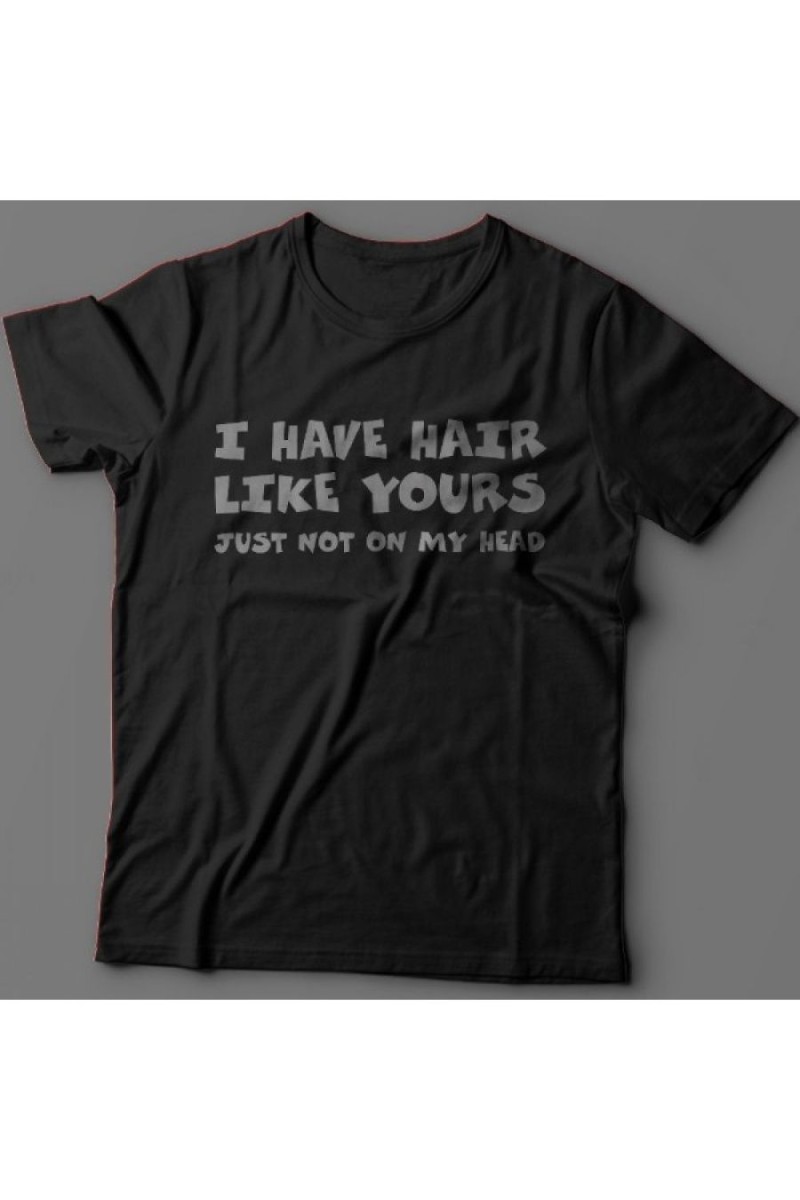 Прикольная, смешная мужская футболка с надписью "I have hair like yours just not on my head ". Футболка с прикольным принтом подходит для подростков, для мужчин, для взрослых. Отлично подходит как подарок на День Рождения папе, парню, мужу. Прикольная надпись на футболке выделит вас из толпы и подчеркнет уникальность. Футболки идут размер в размер и должны смотреться свободно, поэтому не следует выбирать слишком маленький размер, а лучше выбрать размер с запасом. По умолчанию в товаре указан выбор мужских размеров. Женские размеры - на 1 размер меньше чем мужские. Все мужские футболки со смешными надписями состоят из 100% хлопка. Цвет: черный, с белым принтом.