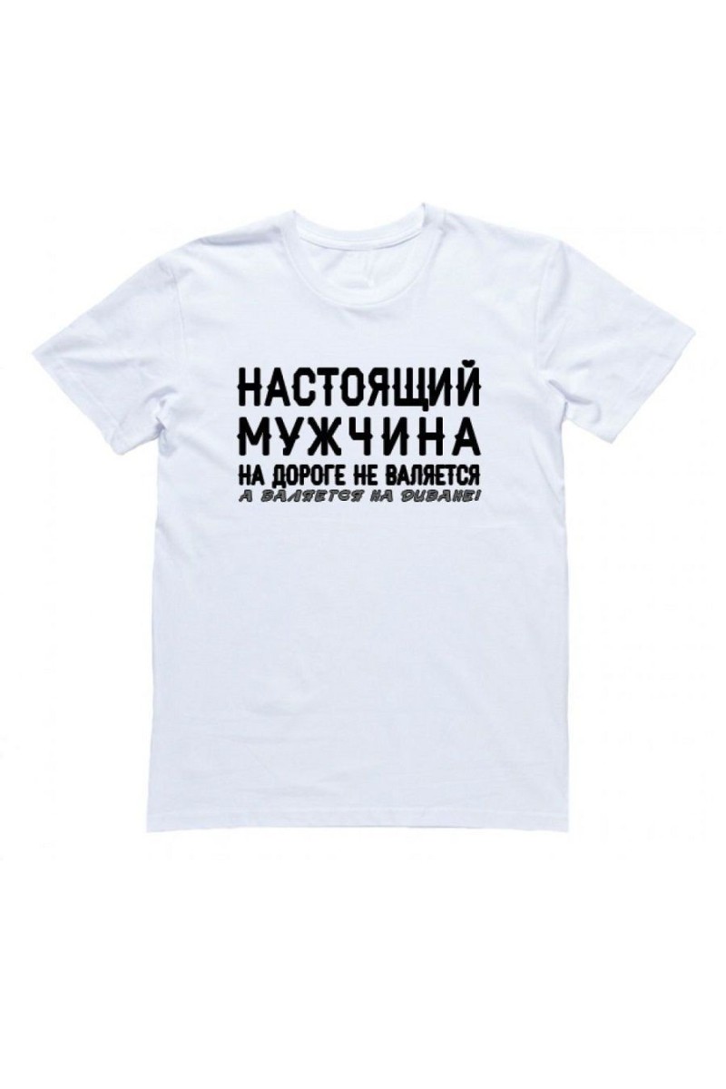Прикольная, смешная мужская футболка с надписью "НАСТОЯЩИЙ МУЖЧИНА на дороге не валяется, а валяется на диване". Футболка с прикольным принтом подходит для подростков, для мужчин, для взрослых. Отлично подходит как подарок на День Рождения папе, парню, мужу. Прикольная надпись на футболке выделит вас из толпы и подчеркнет уникальность. Футболки идут размер в размер и должны смотреться свободно, поэтому не следует выбирать слишком маленький размер, а лучше выбрать размер с запасом. По умолчанию в товаре указан выбор мужских размеров. Женские размеры - на 1 размер меньше чем мужские. Все мужские футболки со смешными надписями состоят из 100% хлопка. Цвет: белый, с черным принтом.