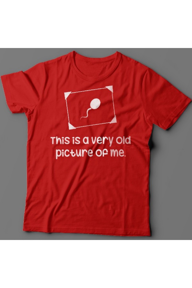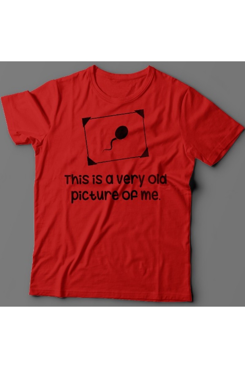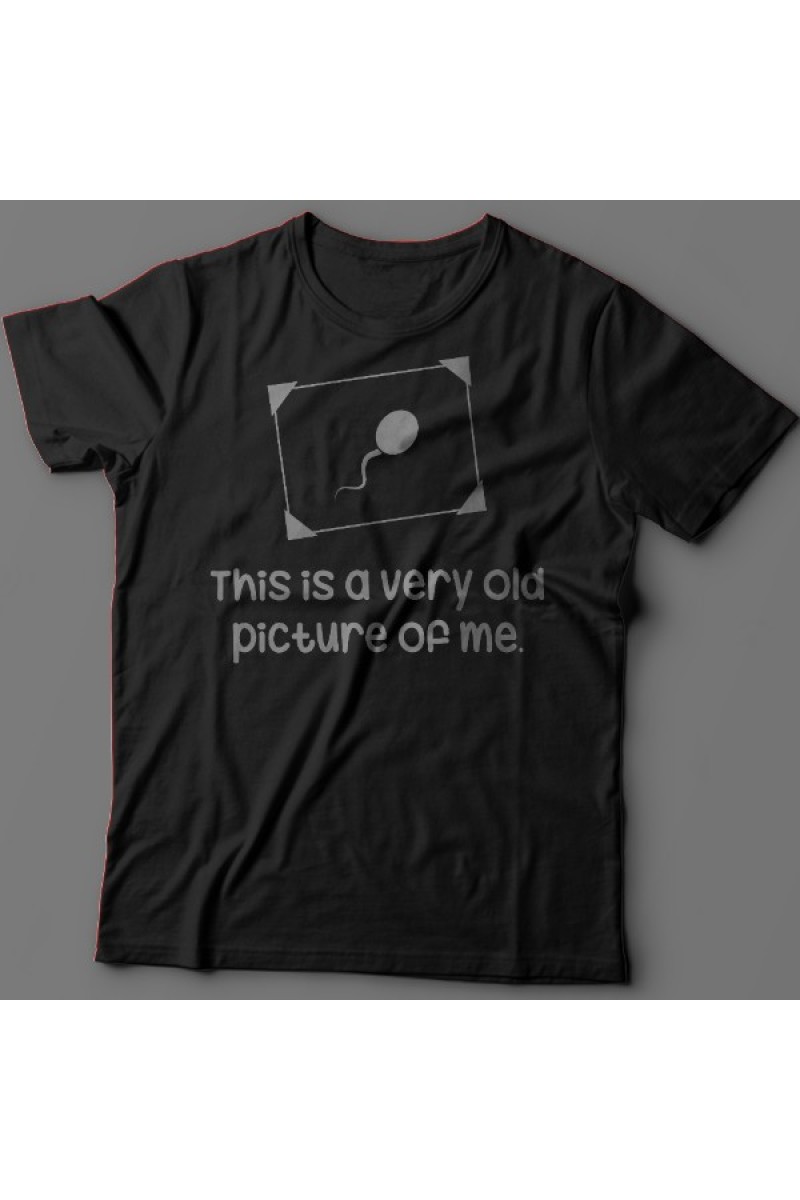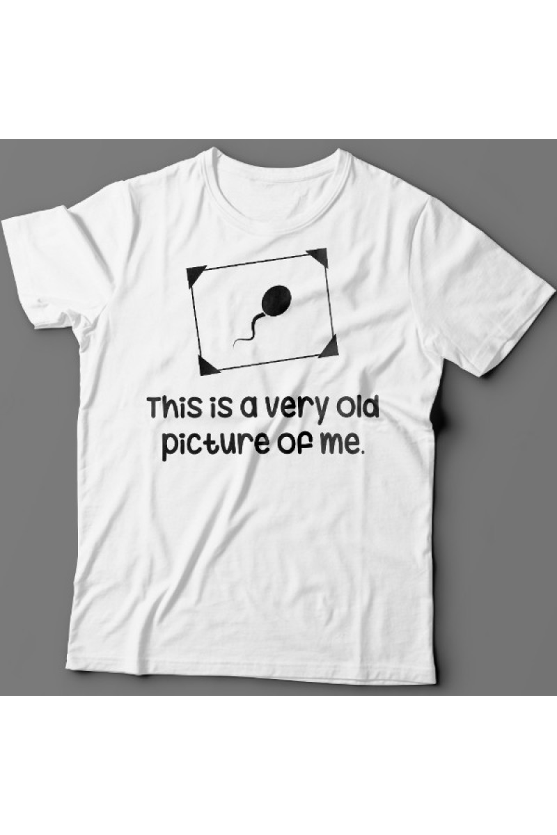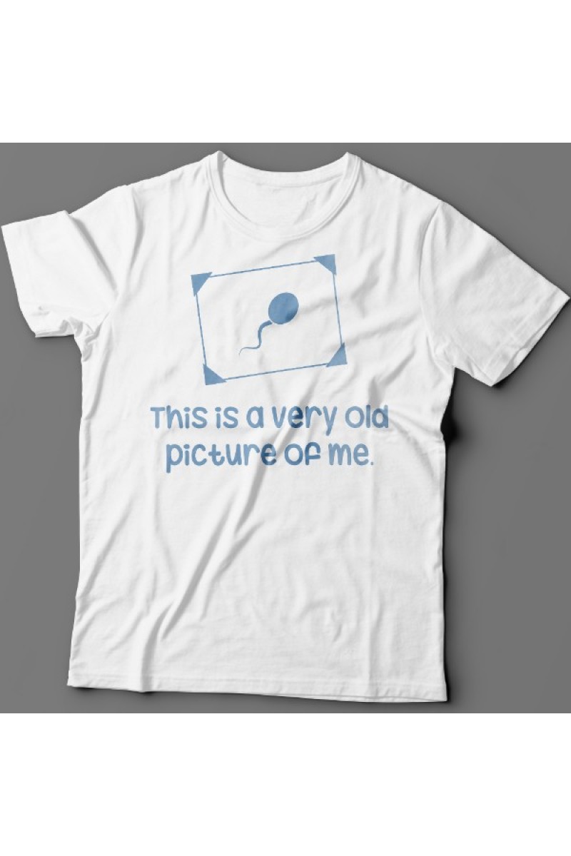 Смешная футболка с надписью "This is a very old picture of me" - Это самая старая фотография меня. Помимо надписи на принте есть изображение сперматозоида в рамочке.