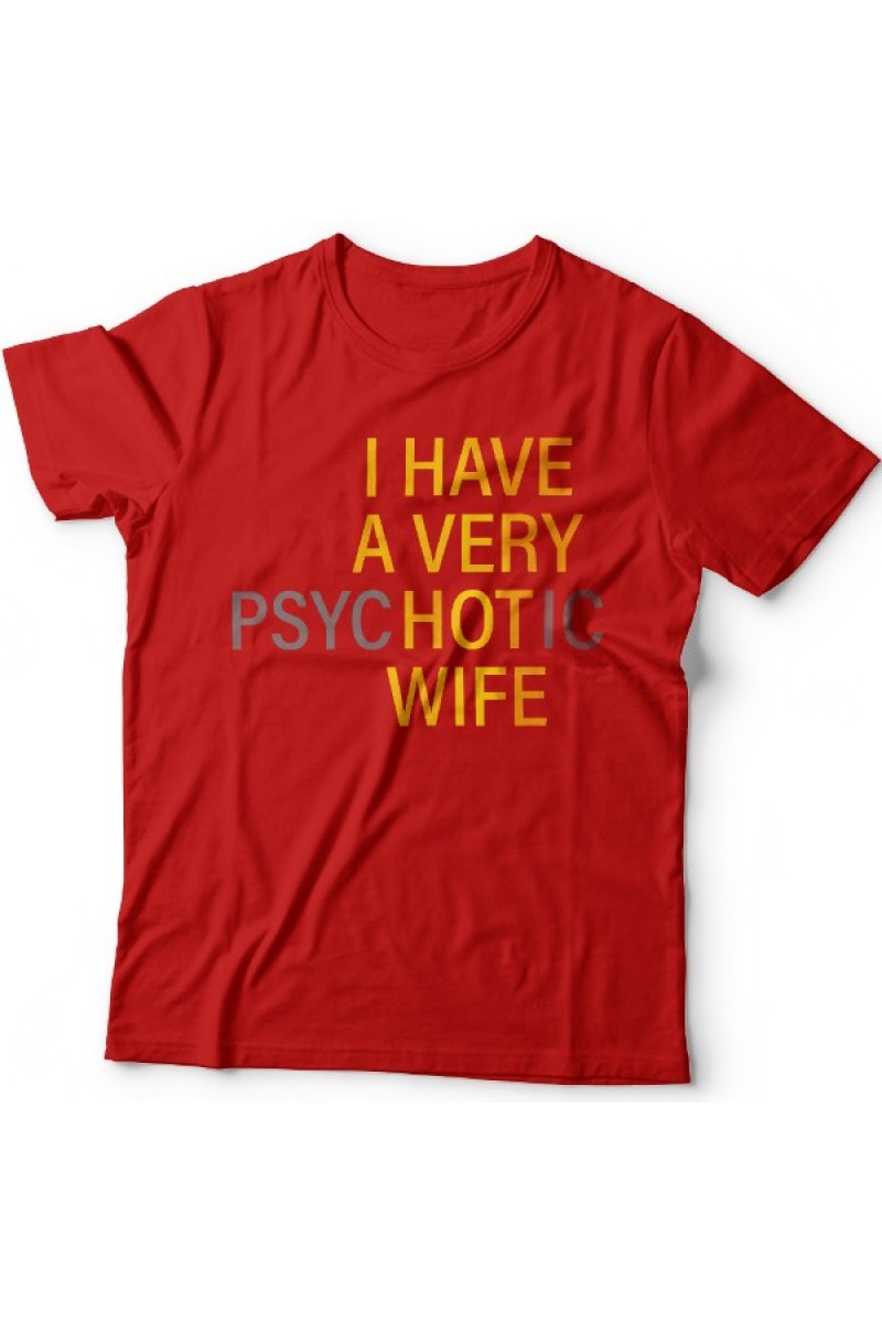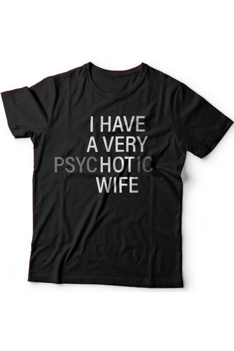 Смешная футболка с надписью "I HAVE A VERY (psy)HOT(ic) WIFE" - У меня самая красивая (нервная) жена.