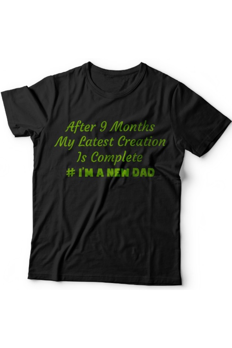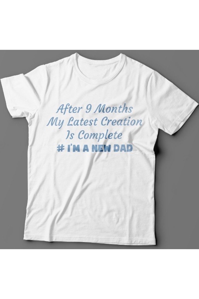 Веселая футболка в подарок для папы "After 9 months my latest creation is complete #I'm a new dad" - После 9 месяцев мое последние творение завершено. #Я новый папа.