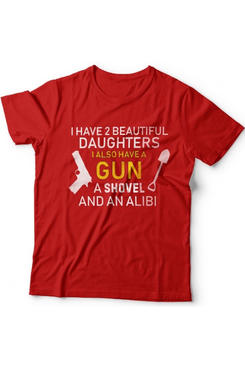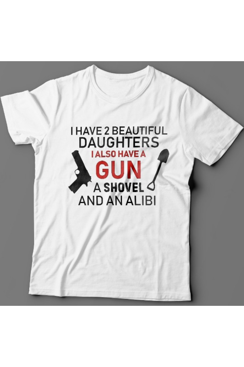 Веселая подарочная футболка для папы "I have 2 beautiful daughters I also have a Gun a Shovel and an Alibi" - У меня есть 2 прекрасные дочки. А еще у меня есть пушка, лопата и алиби.