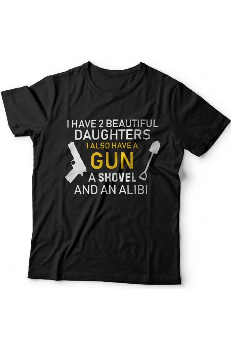Футболка для папы с надписью "I have 2 beautiful daughters. I also have a gun, a shovel and an alibi"