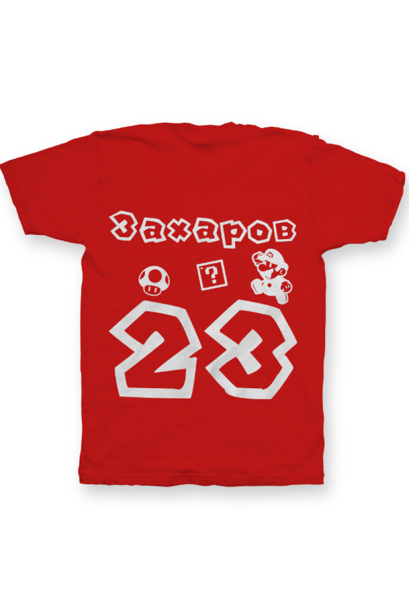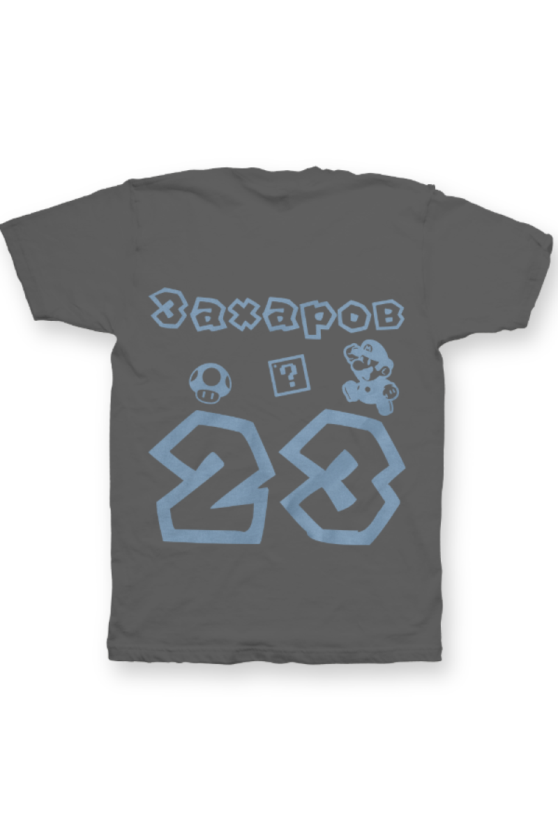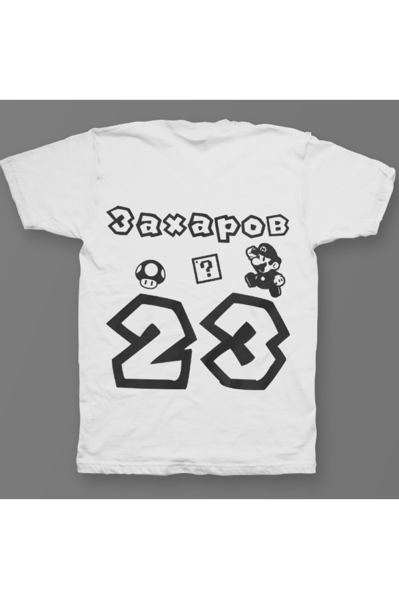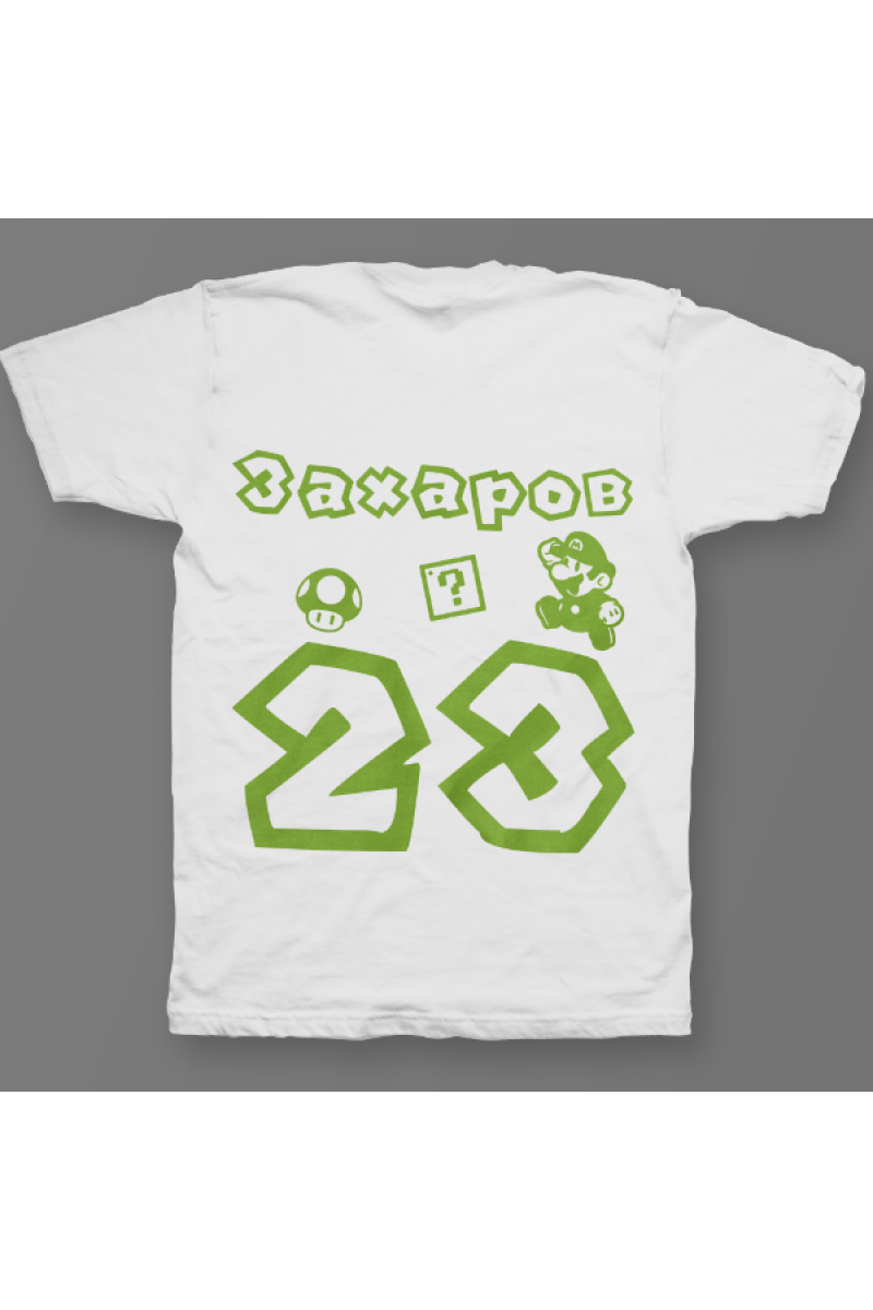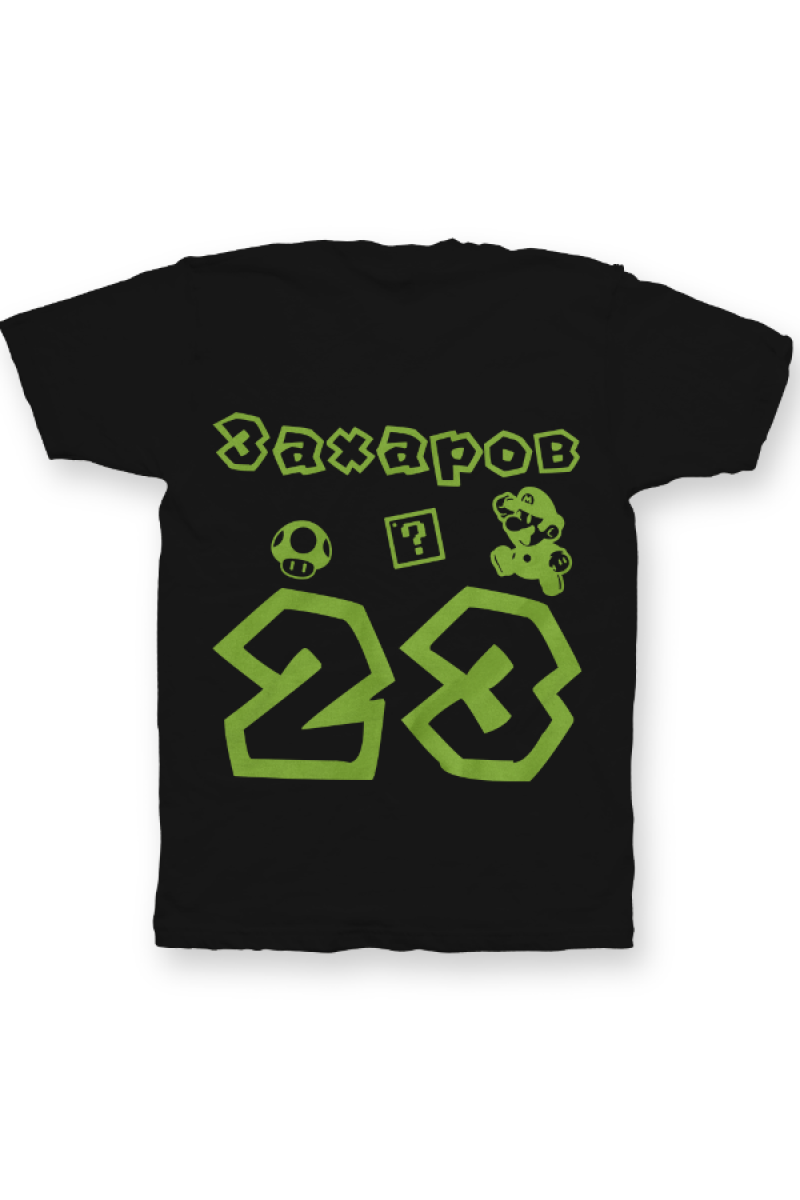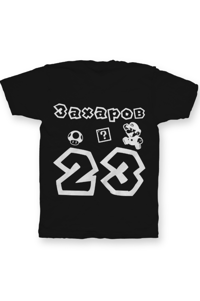 Именная футболка с шрифтом из игры Super Mario. Помимо надписи на футболке есть изображения из той же игры.