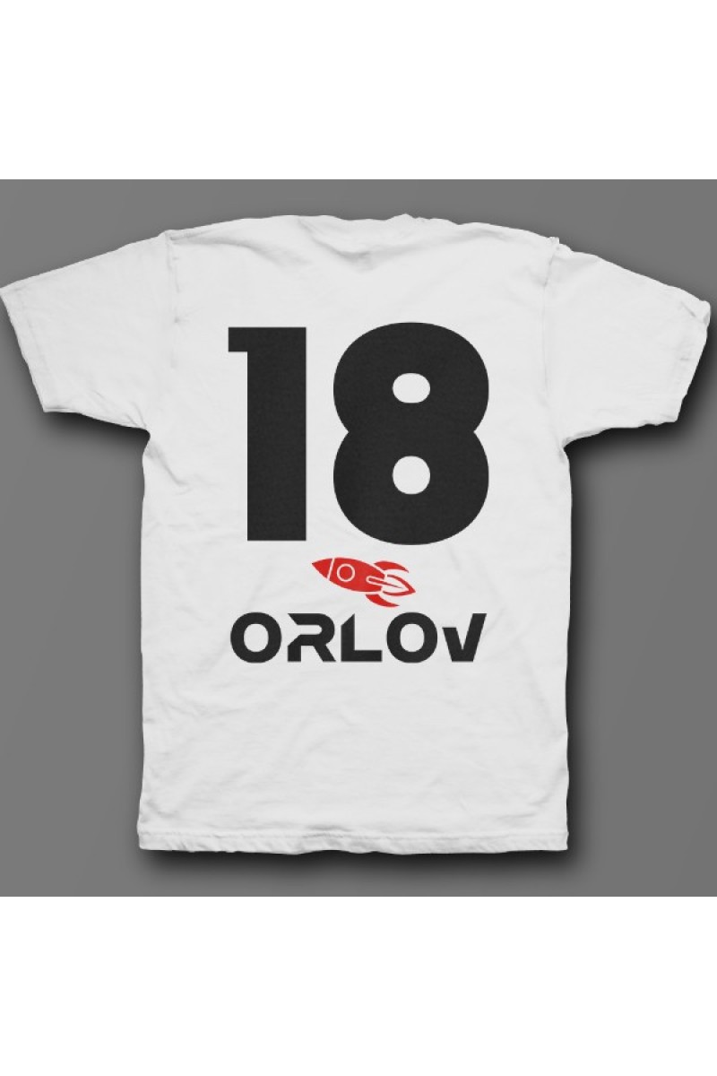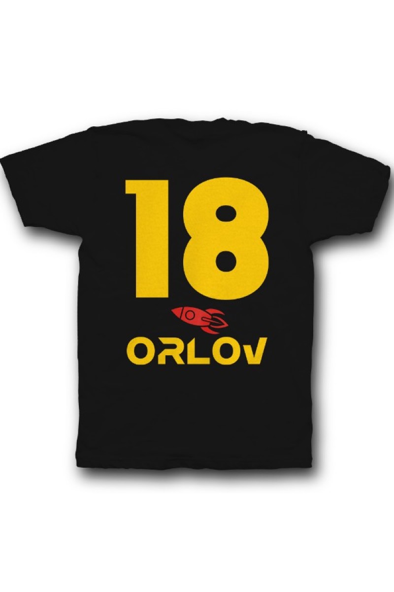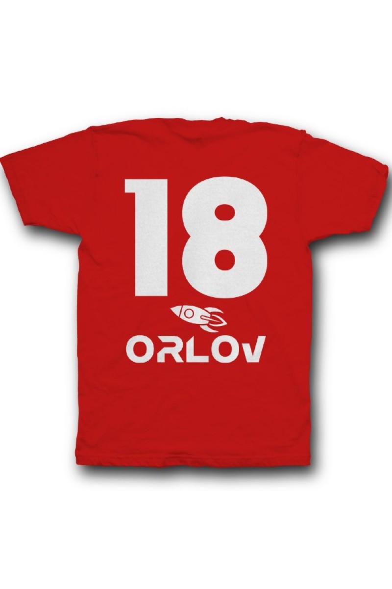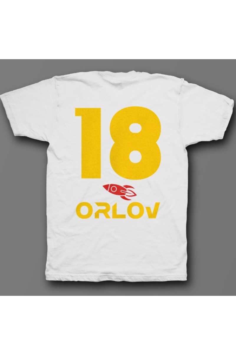 Веселая именная футболка с космическим шрифтом. Помимо надписи на футболке есть изображение ракеты.
