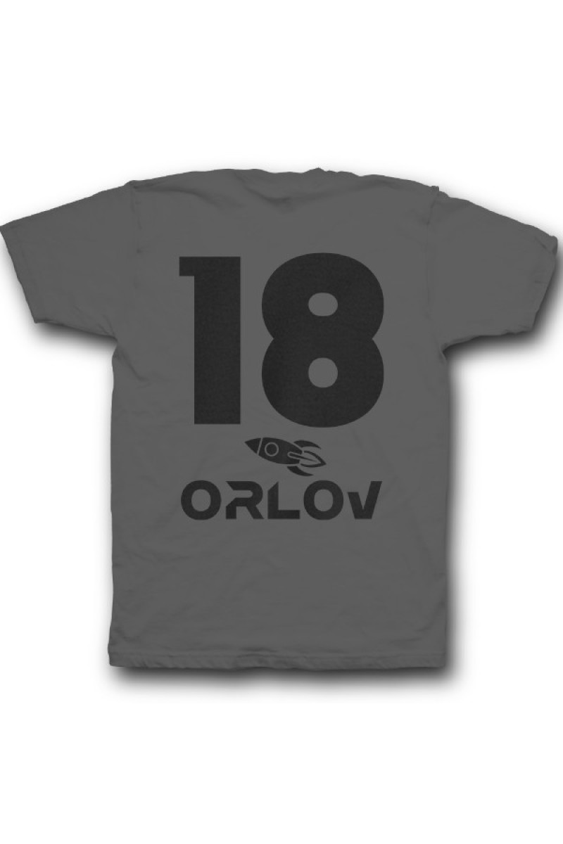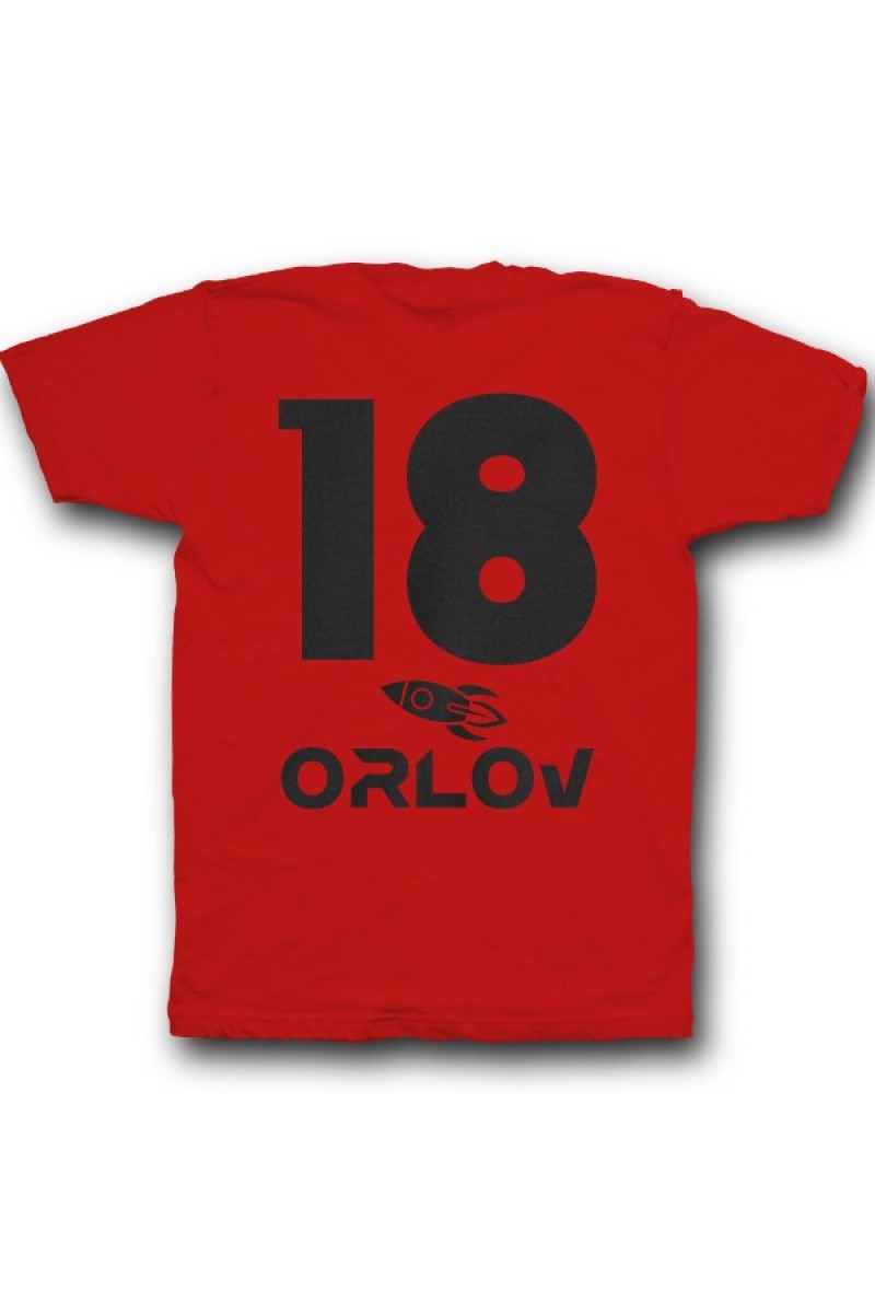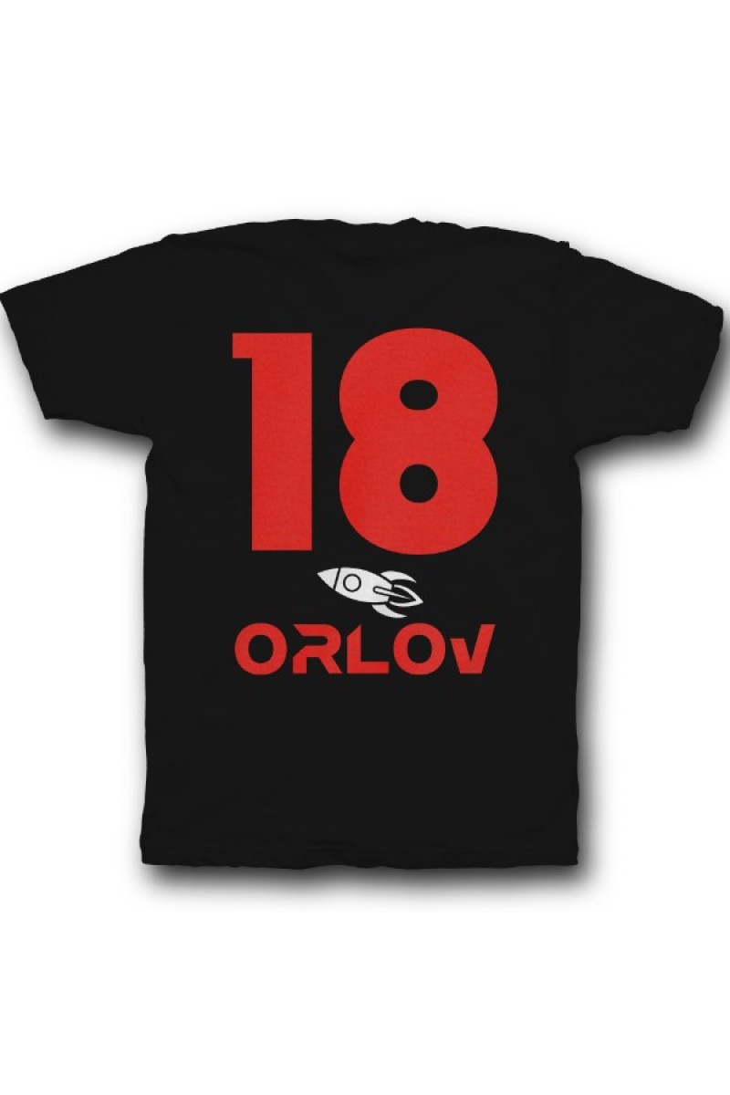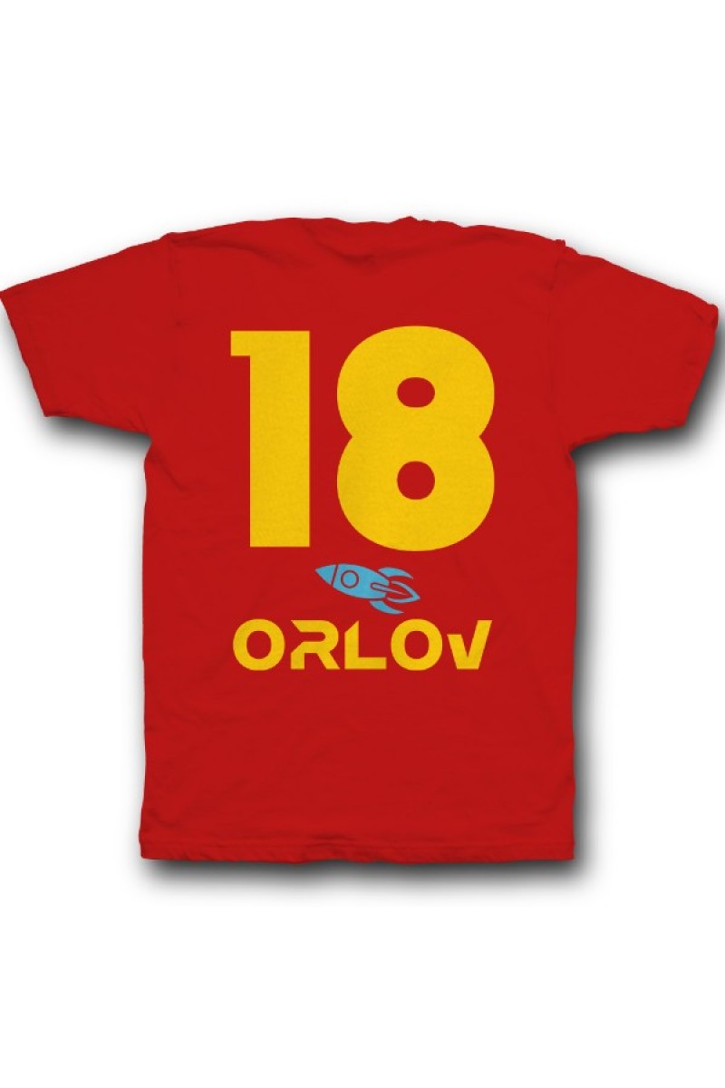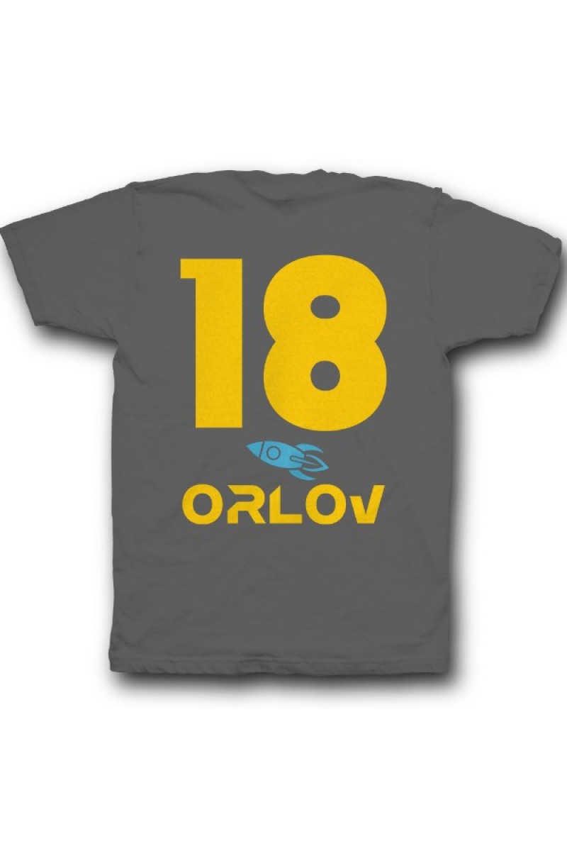 Веселая именная футболка с космическим шрифтом. Помимо надписи на футболке есть изображение ракеты.