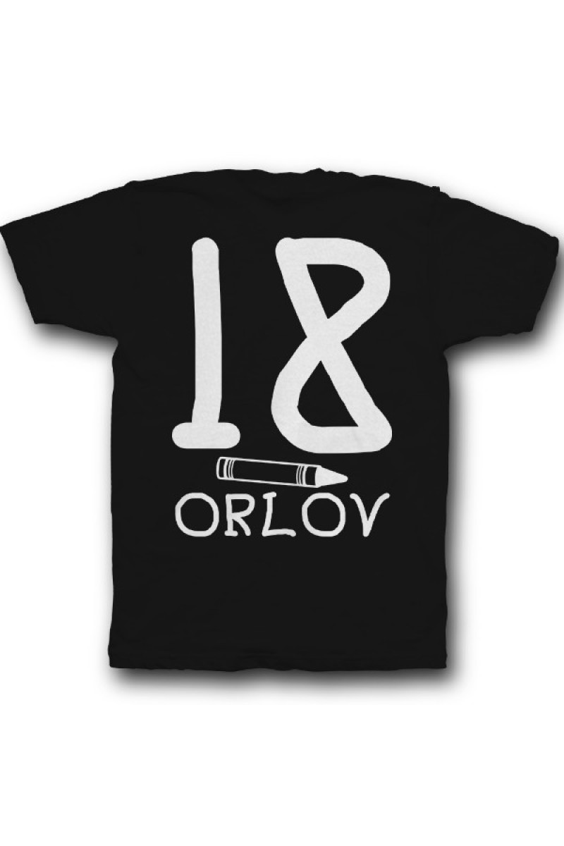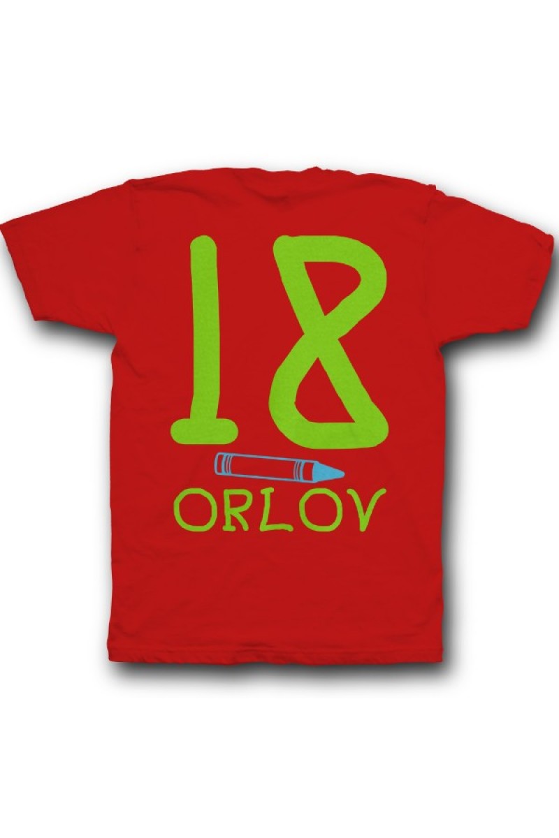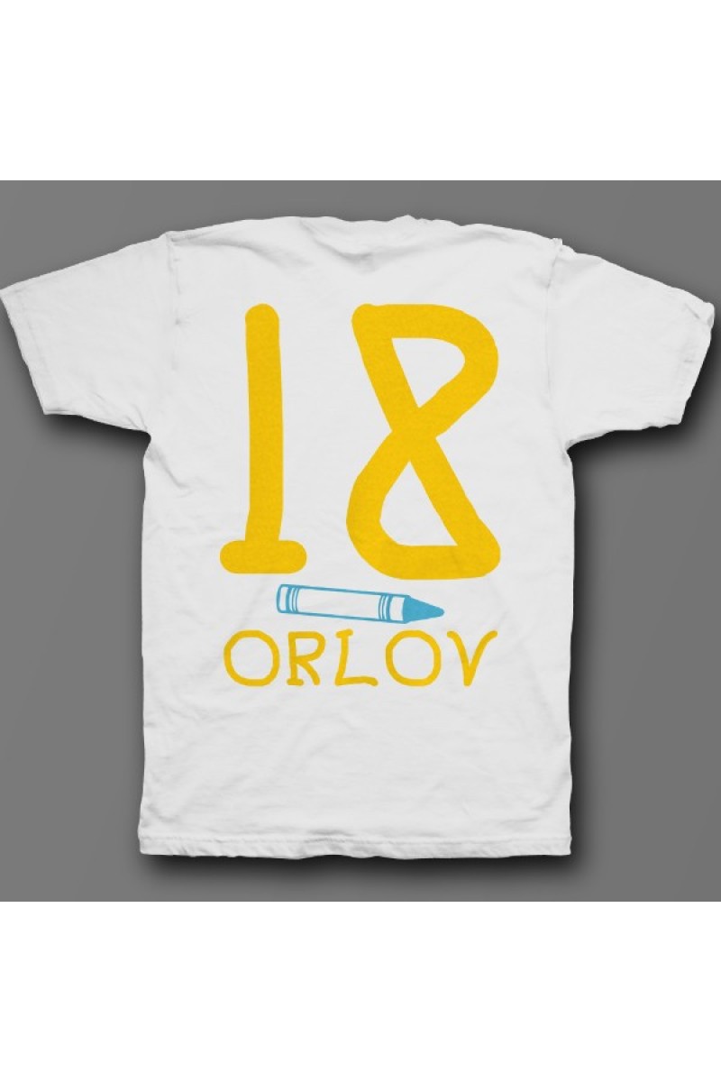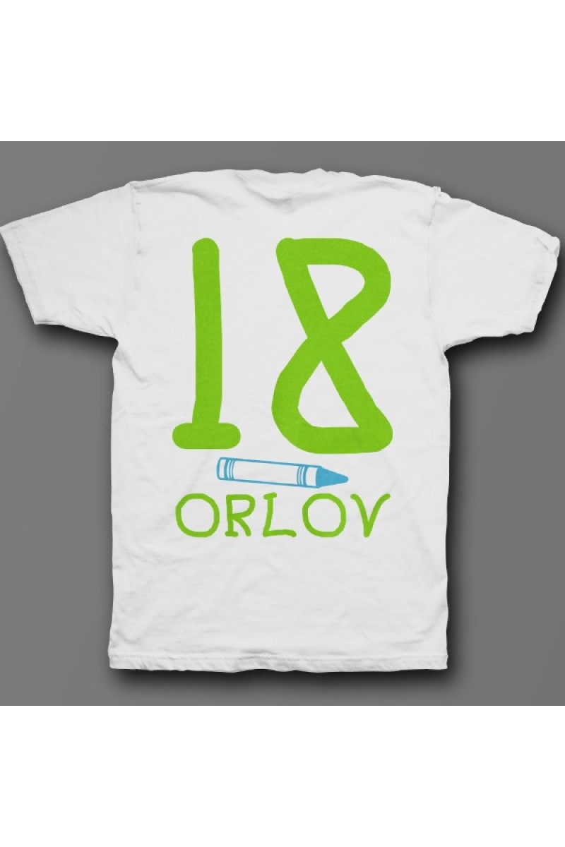 Веселая именная футболка с детским шрифтом. Помимо надписи на футболке есть изображение мелков.