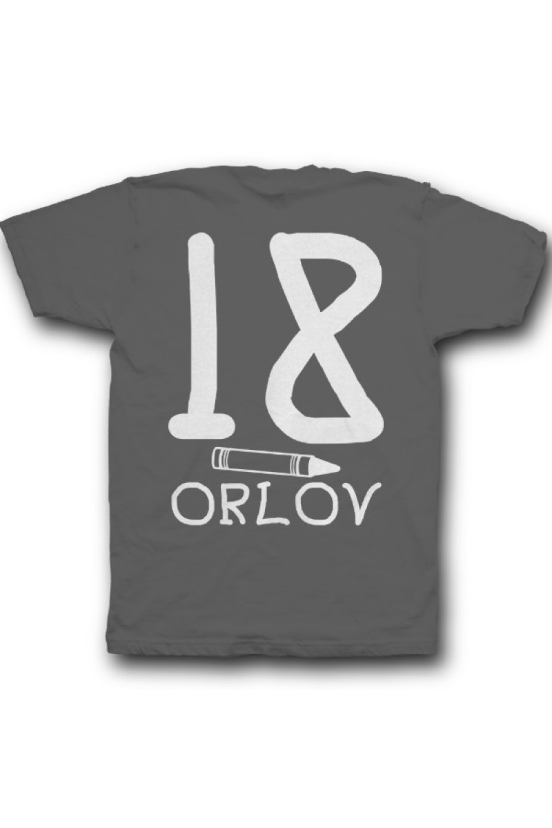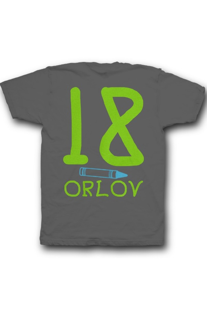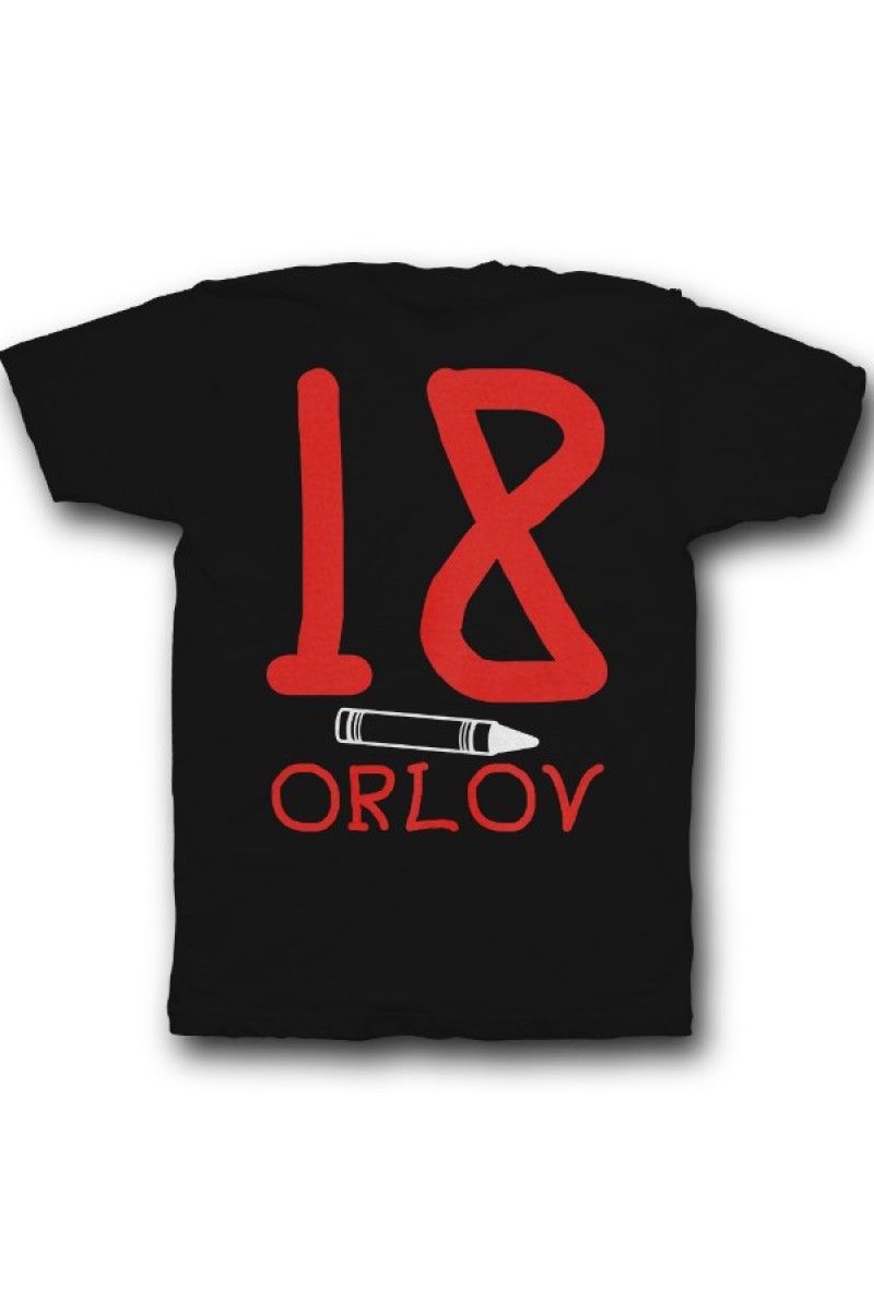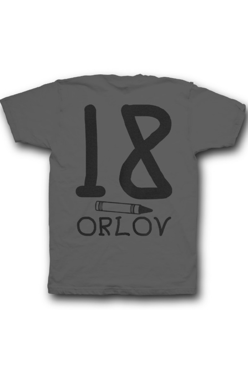 Веселая именная футболка с детским шрифтом. Помимо надписи на футболке есть изображение мелков.