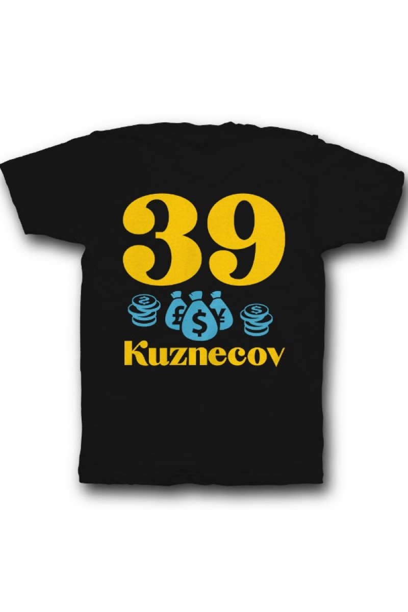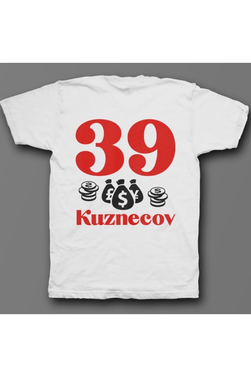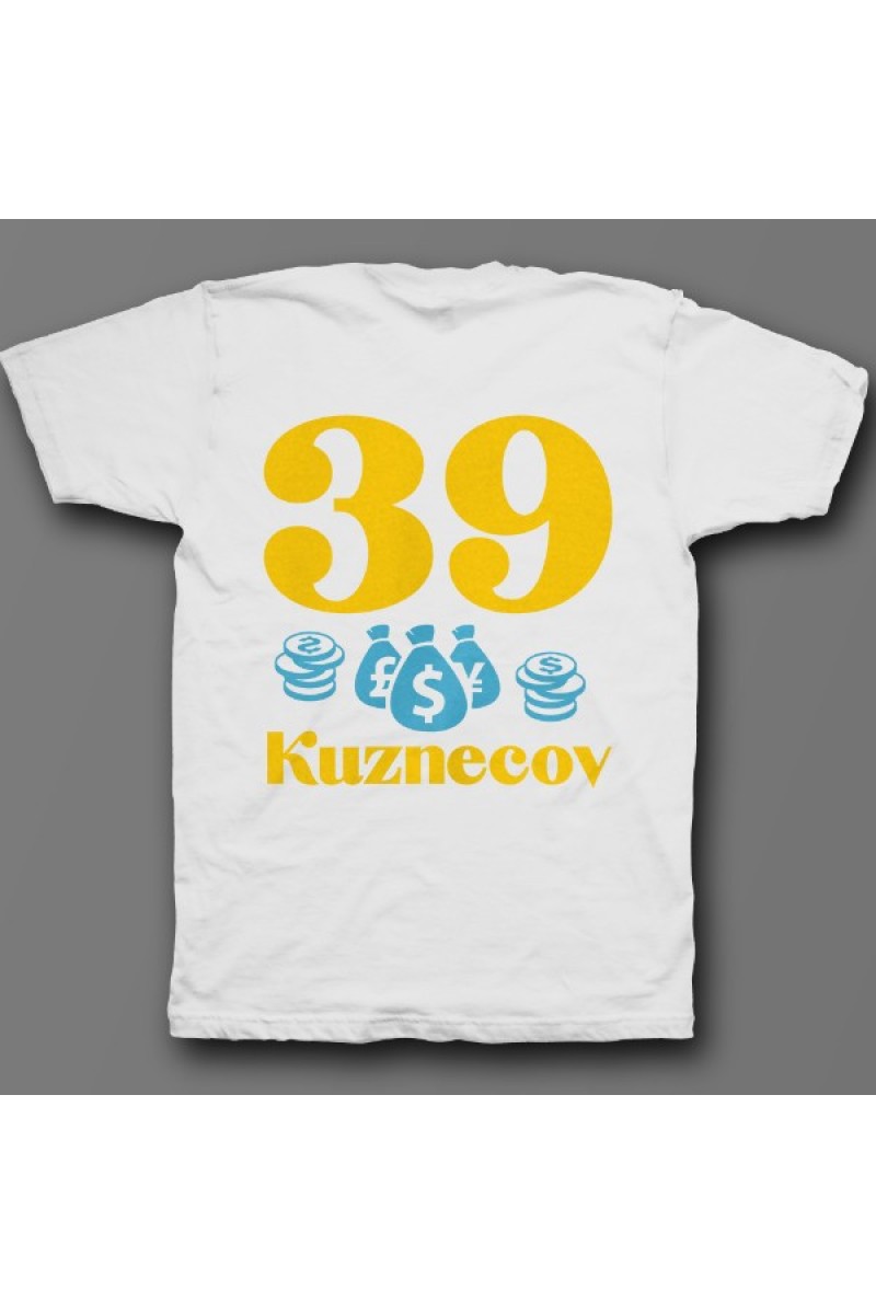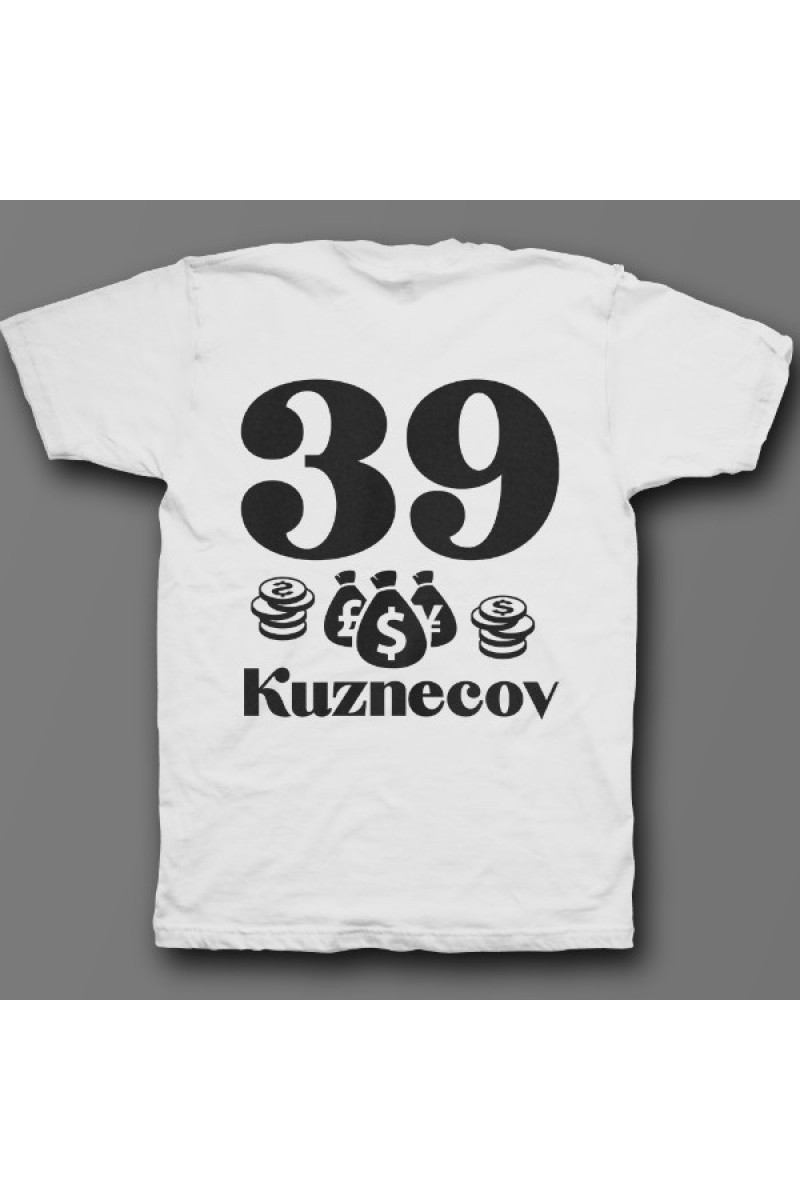 Прикольная именная футболка с мажорным шрифтом. Помимо надписи на футболке есть изображение мешка денег и монет.