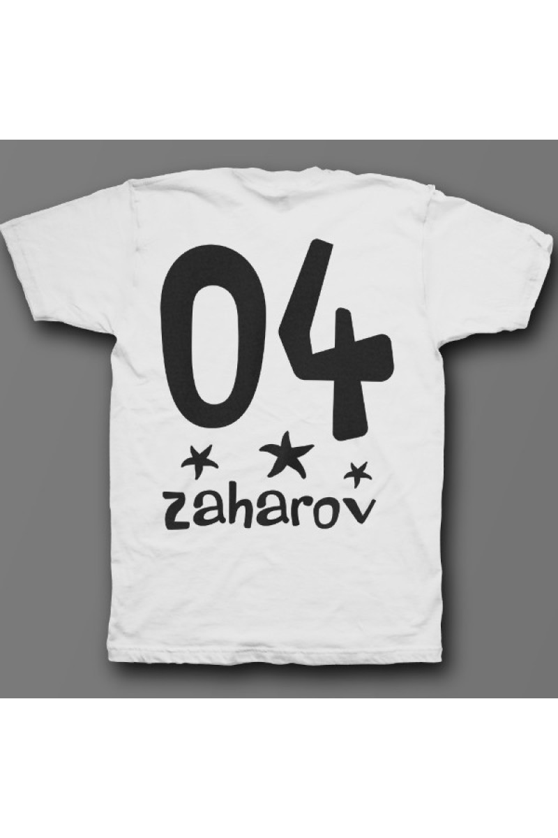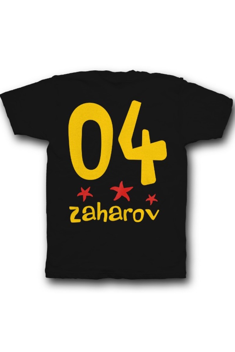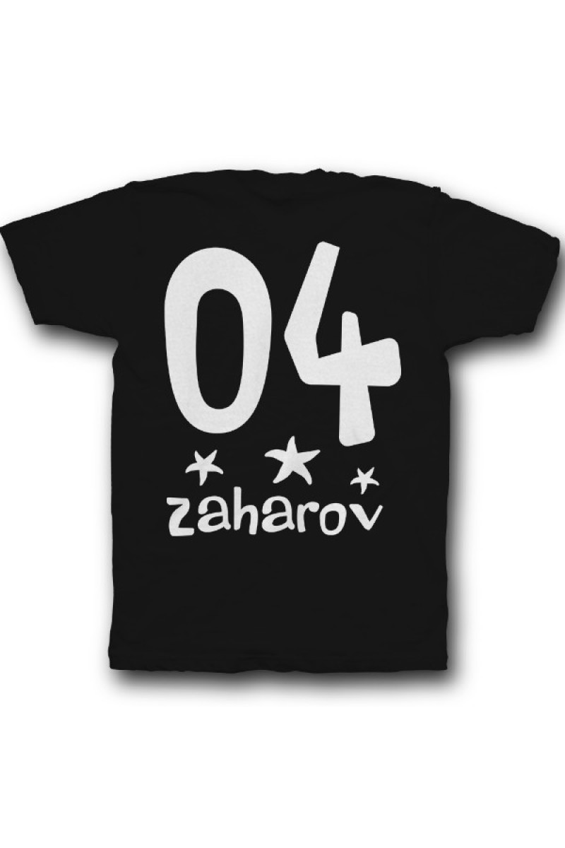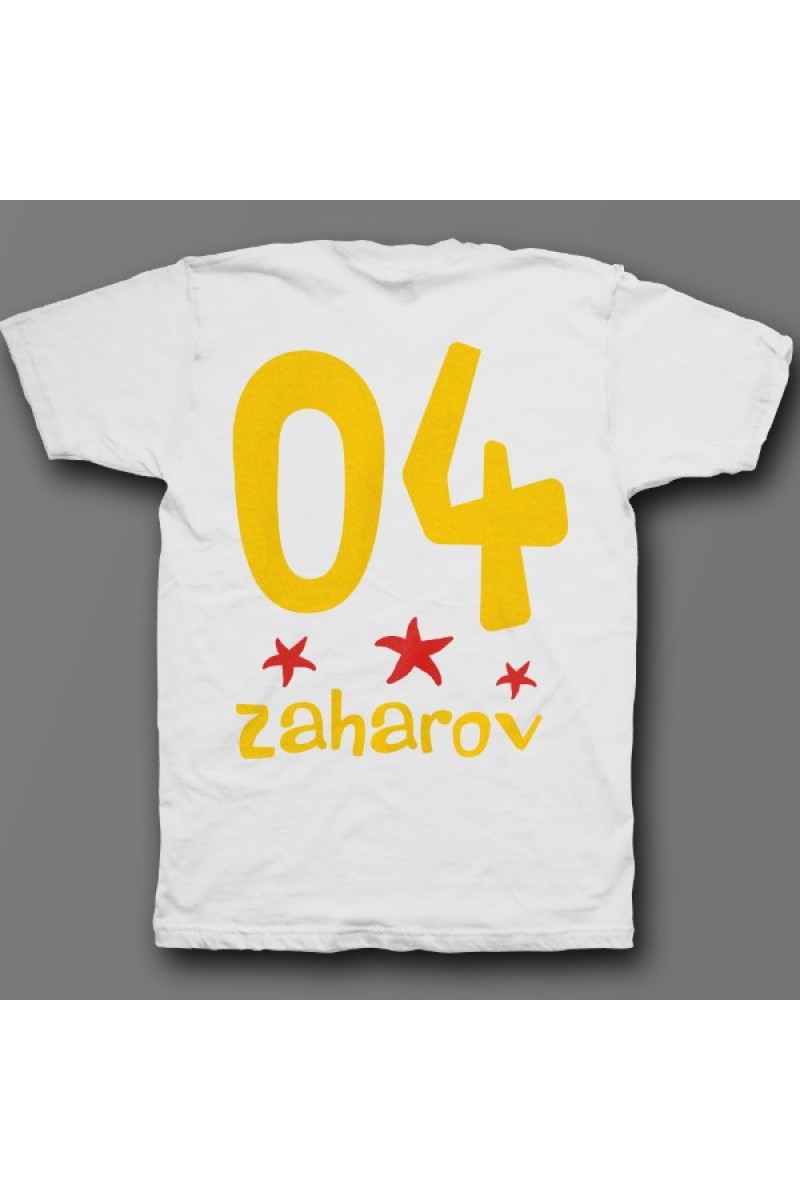 Веселая именная футболка с мультяшным шрифтом. Помимо надписи на футболке есть изображение морских звезд.