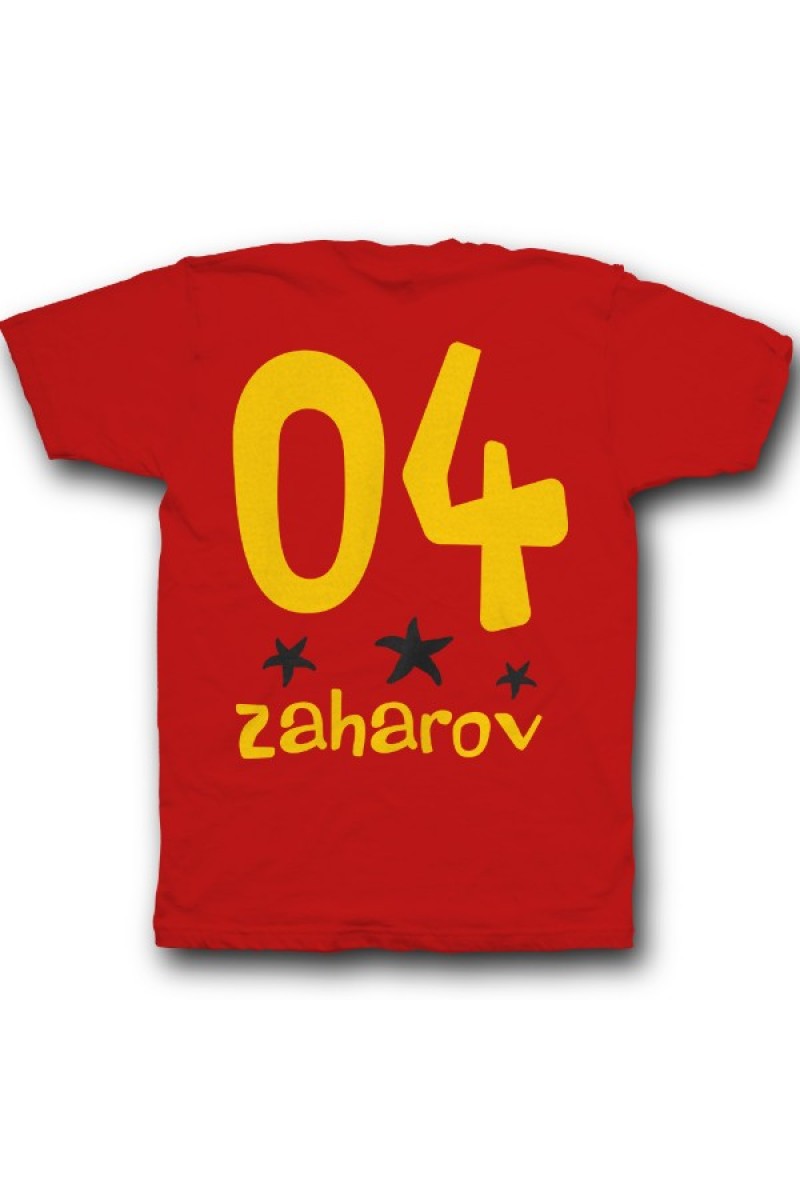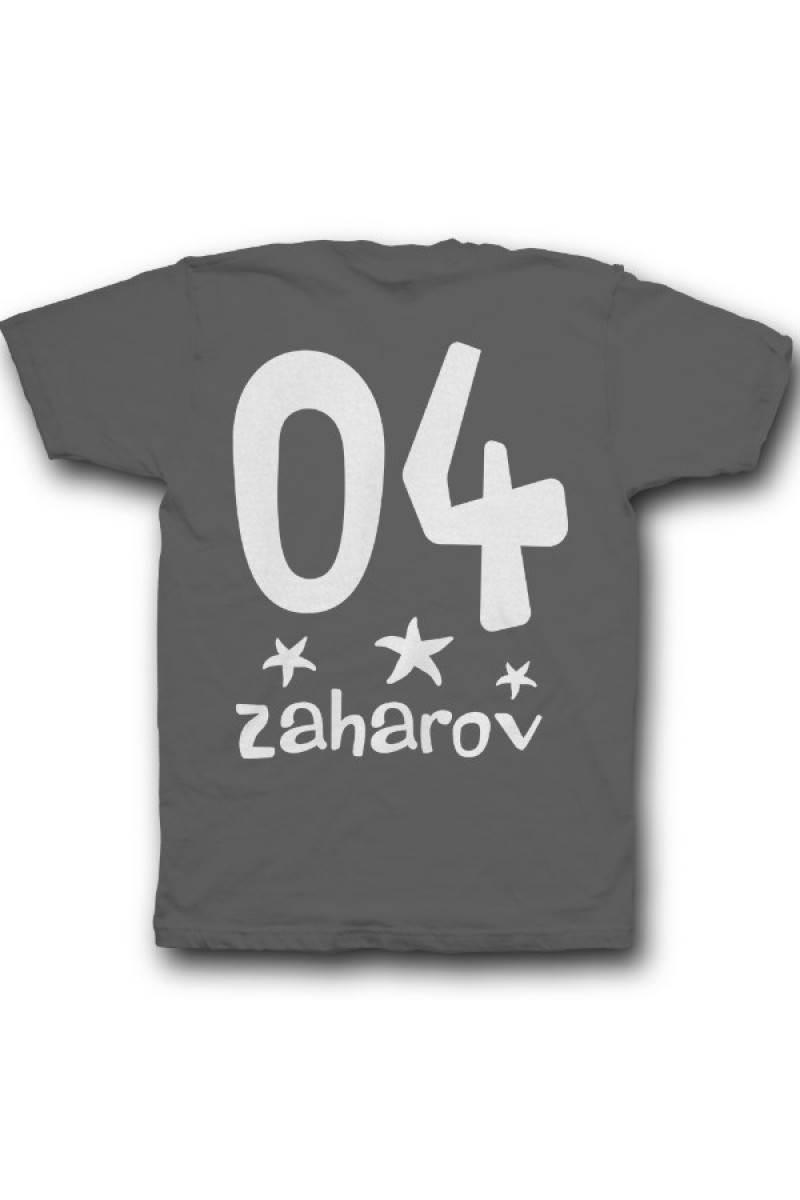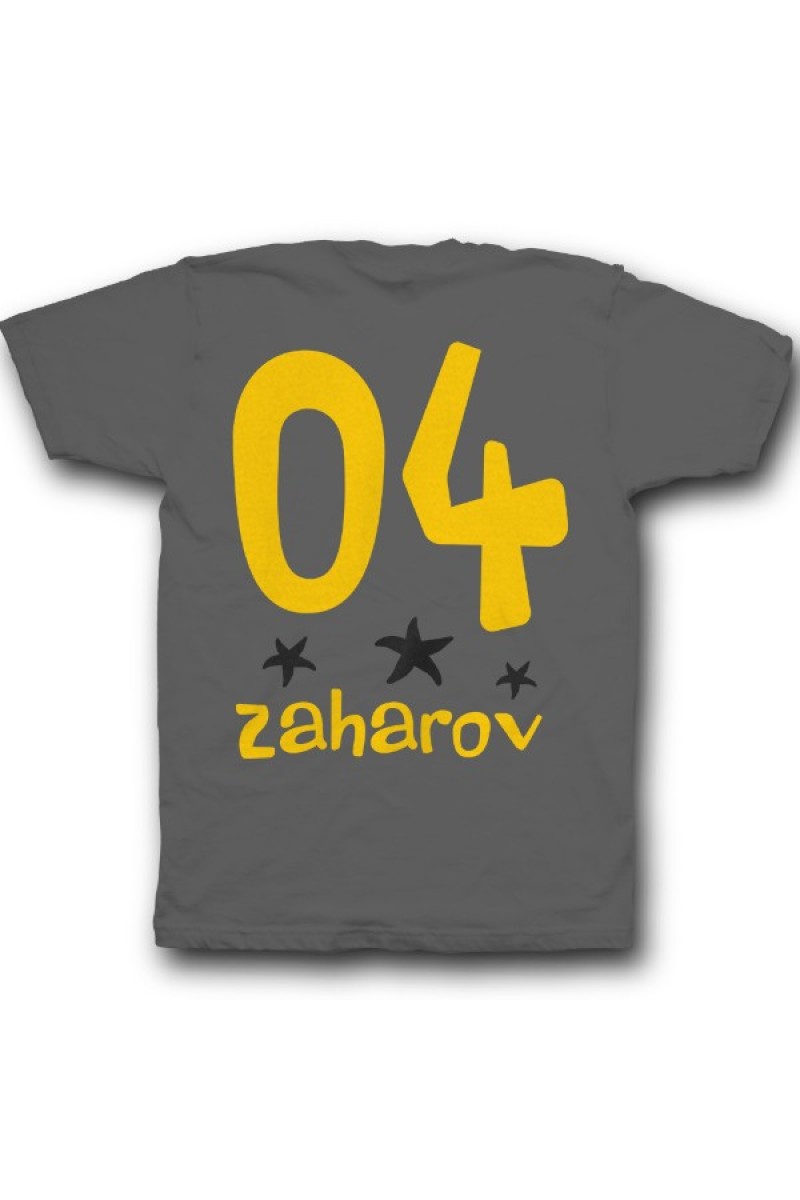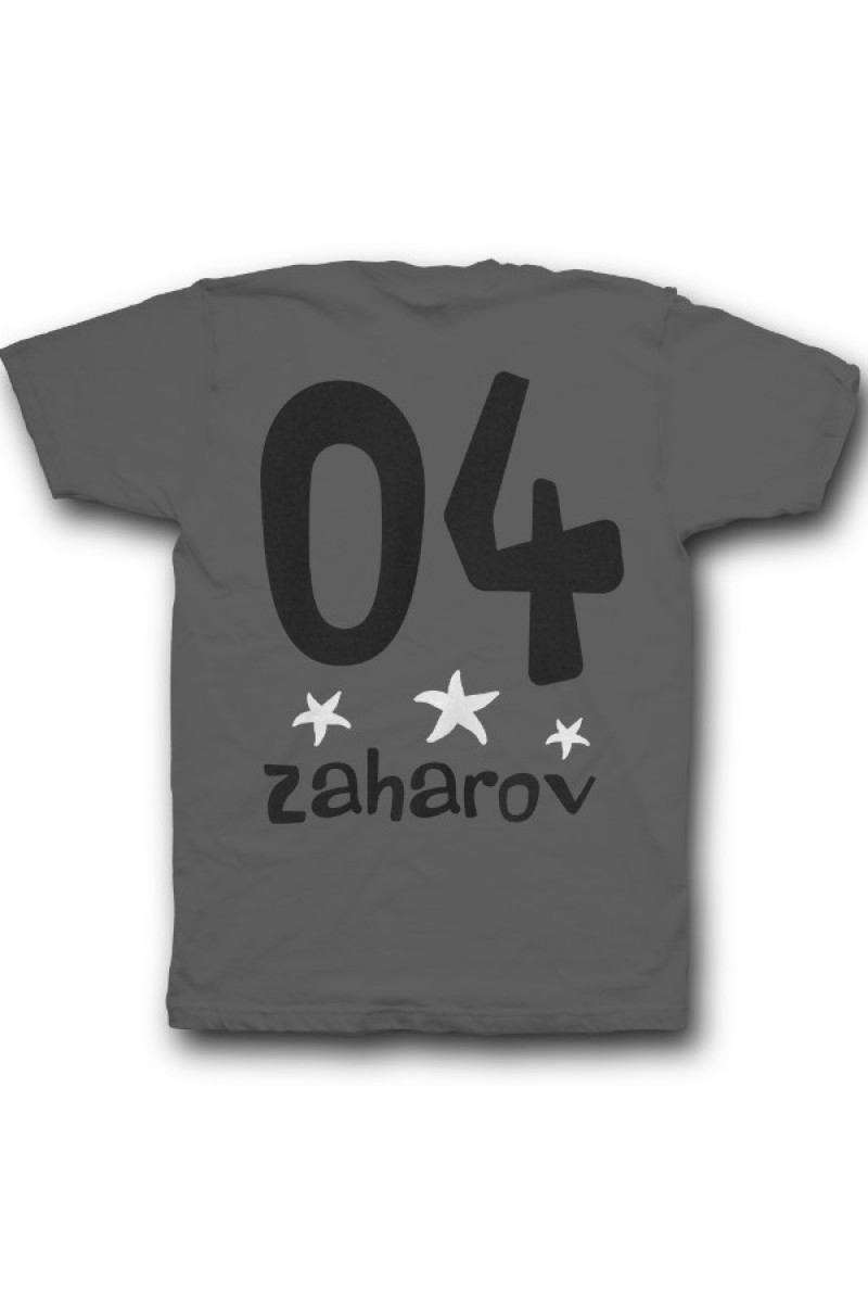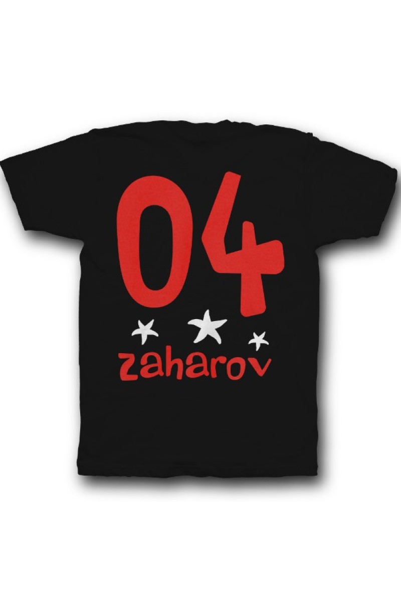 Веселая именная футболка с мультяшным шрифтом. Помимо надписи на футболке есть изображение морских звезд.