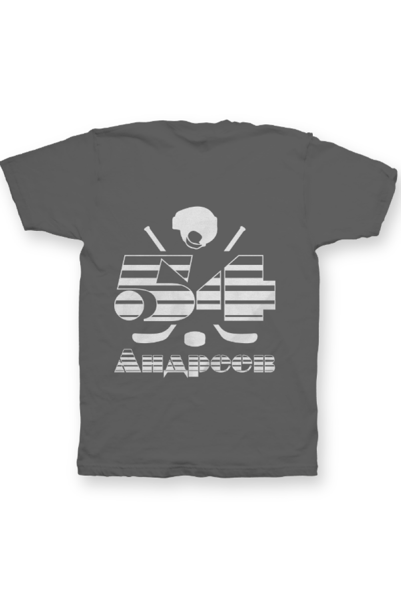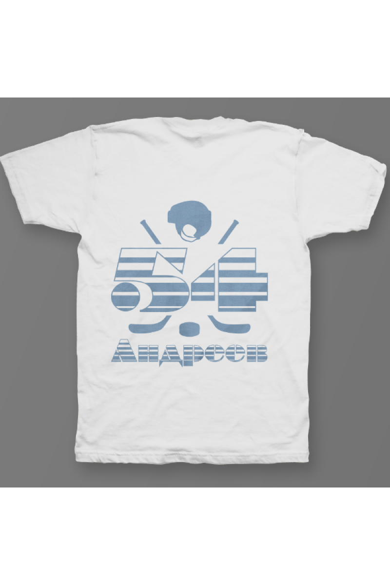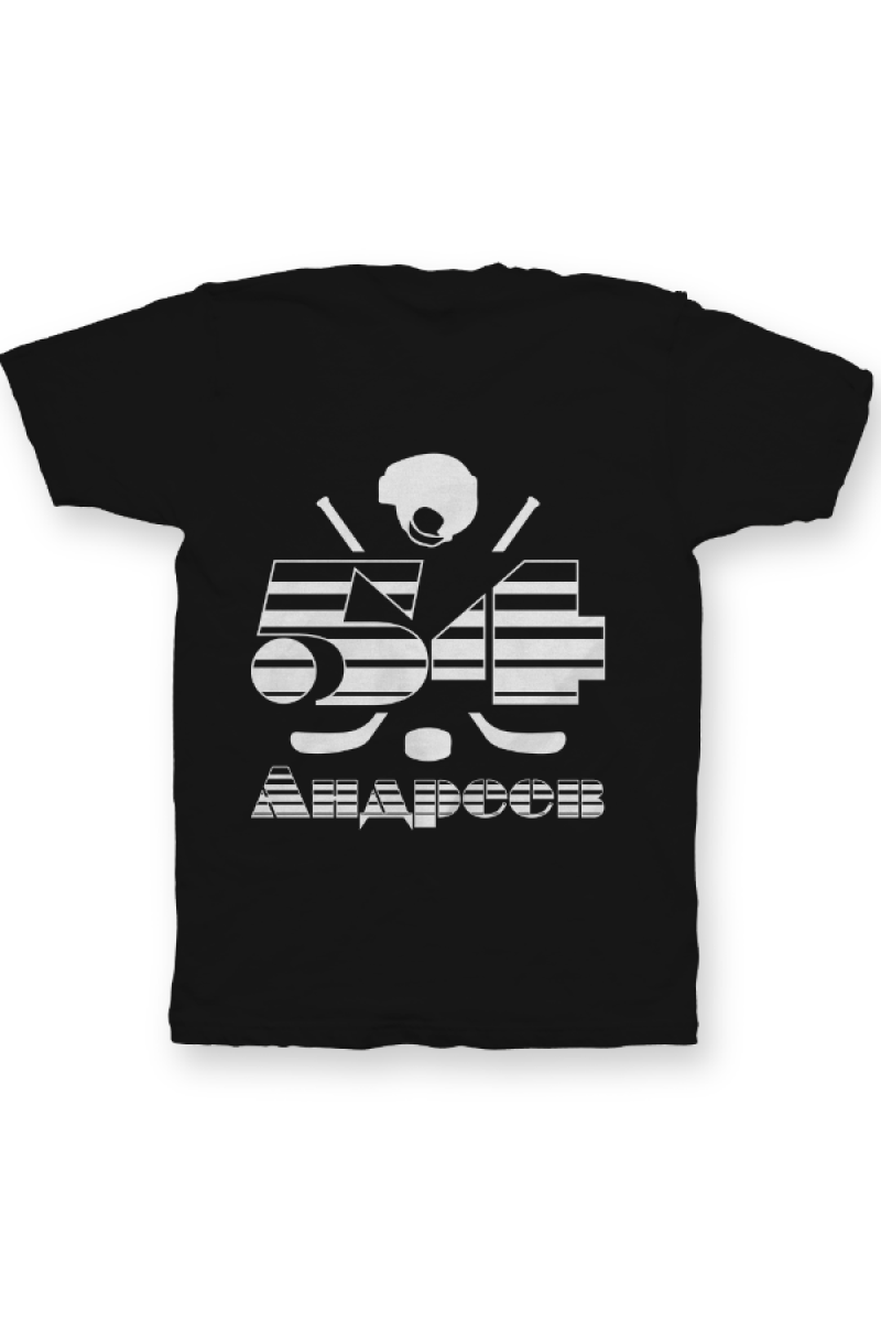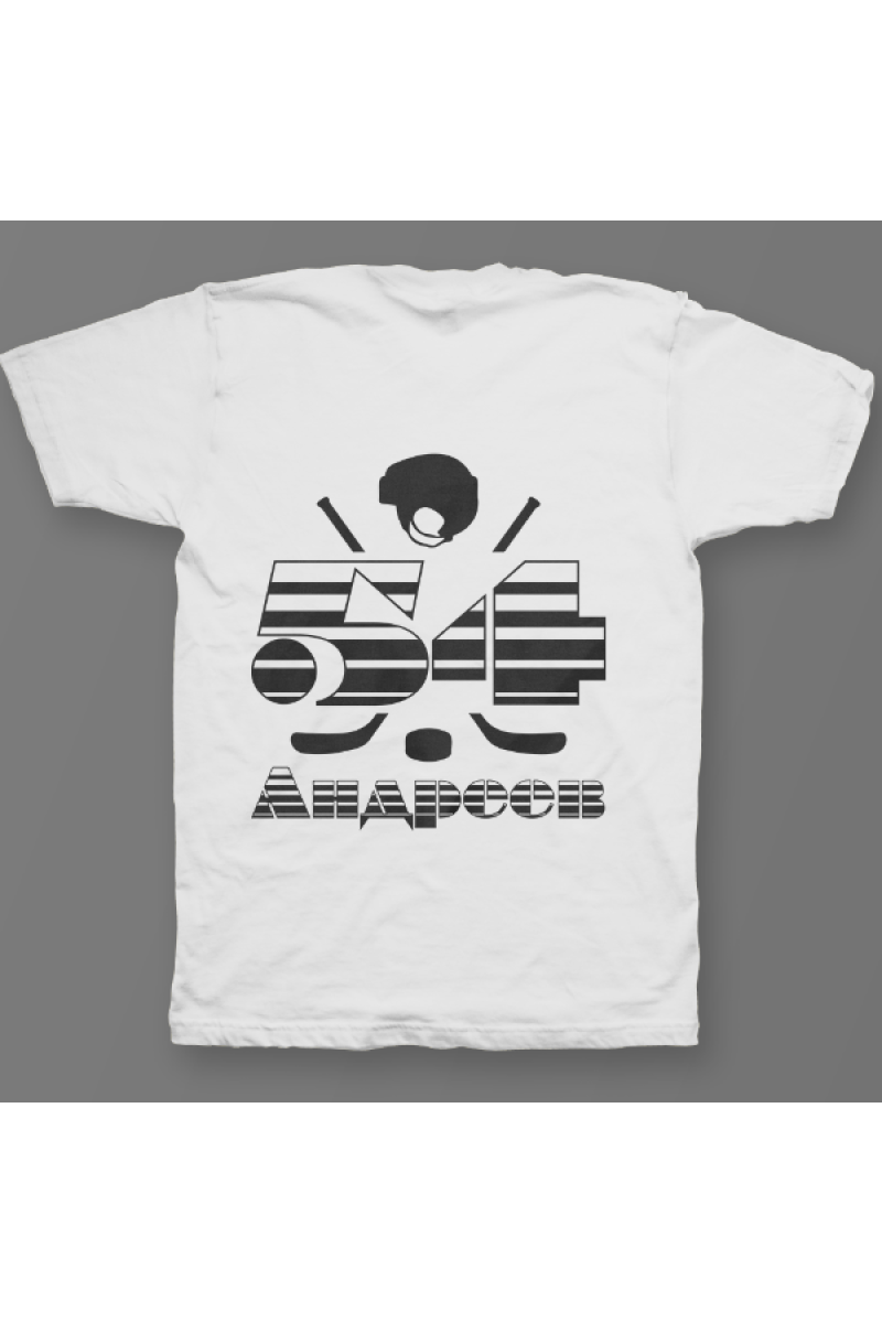 Именная футболка с полосатым шрифтом. Помимо надписи на футболке есть изображение шайбы, клюшек и шлема.