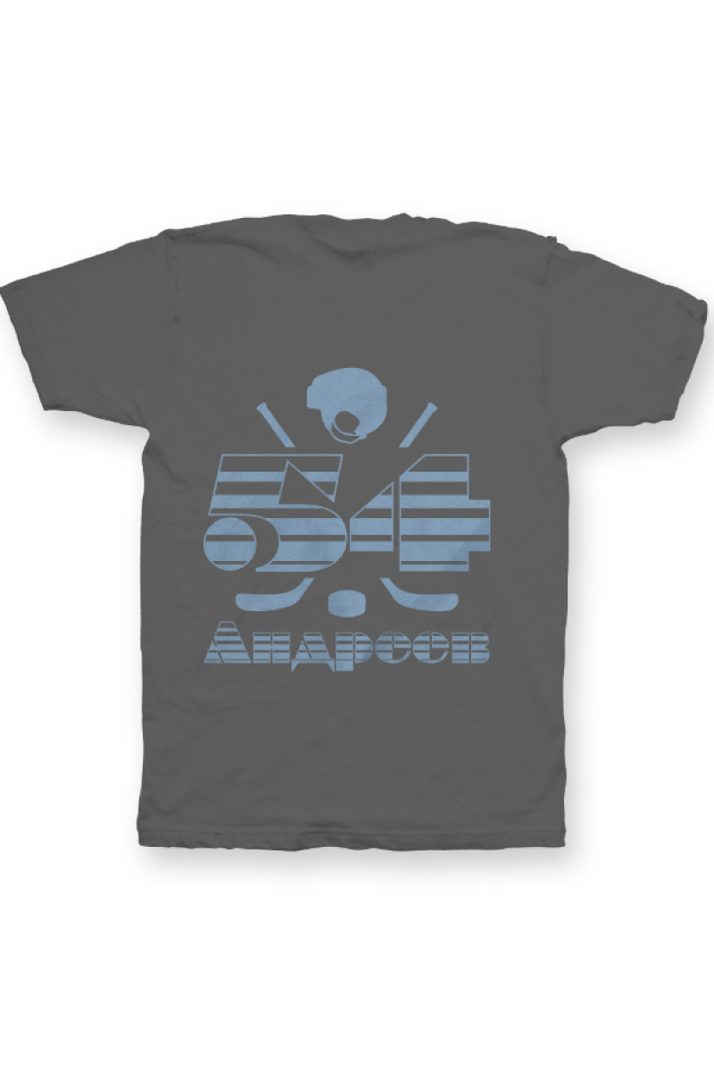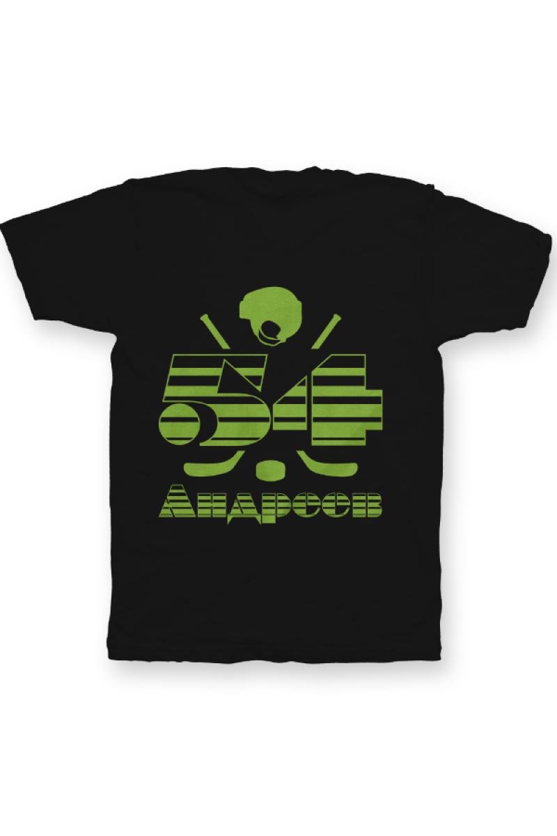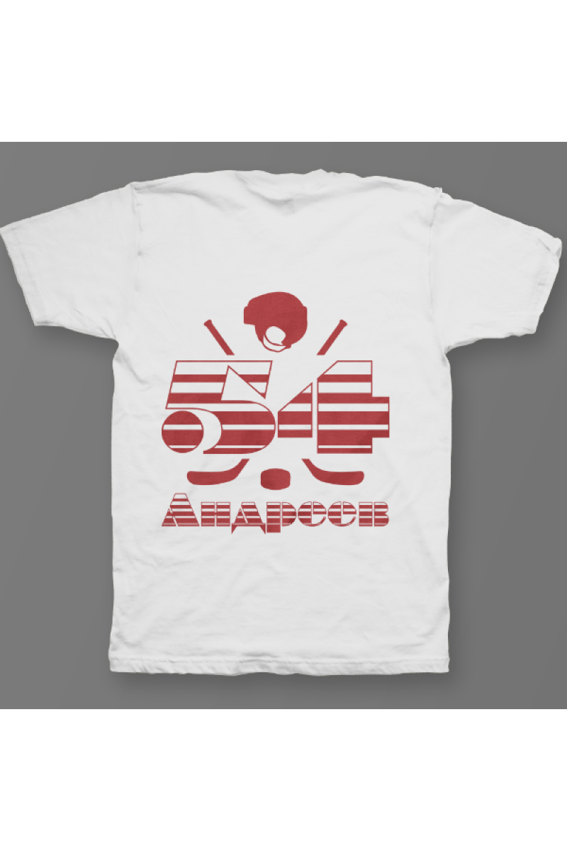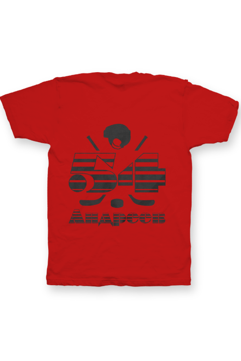 Именная футболка с полосатым шрифтом. Помимо надписи на футболке есть изображение шайбы, клюшек и шлема.