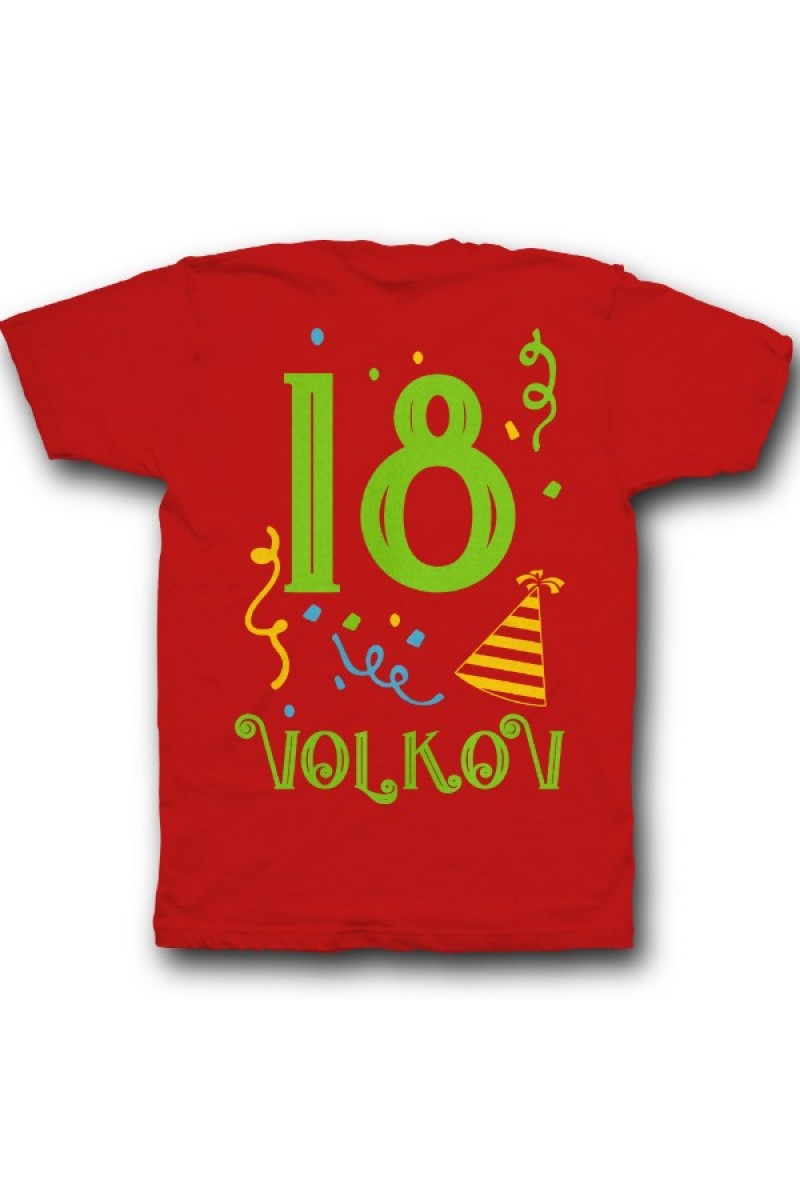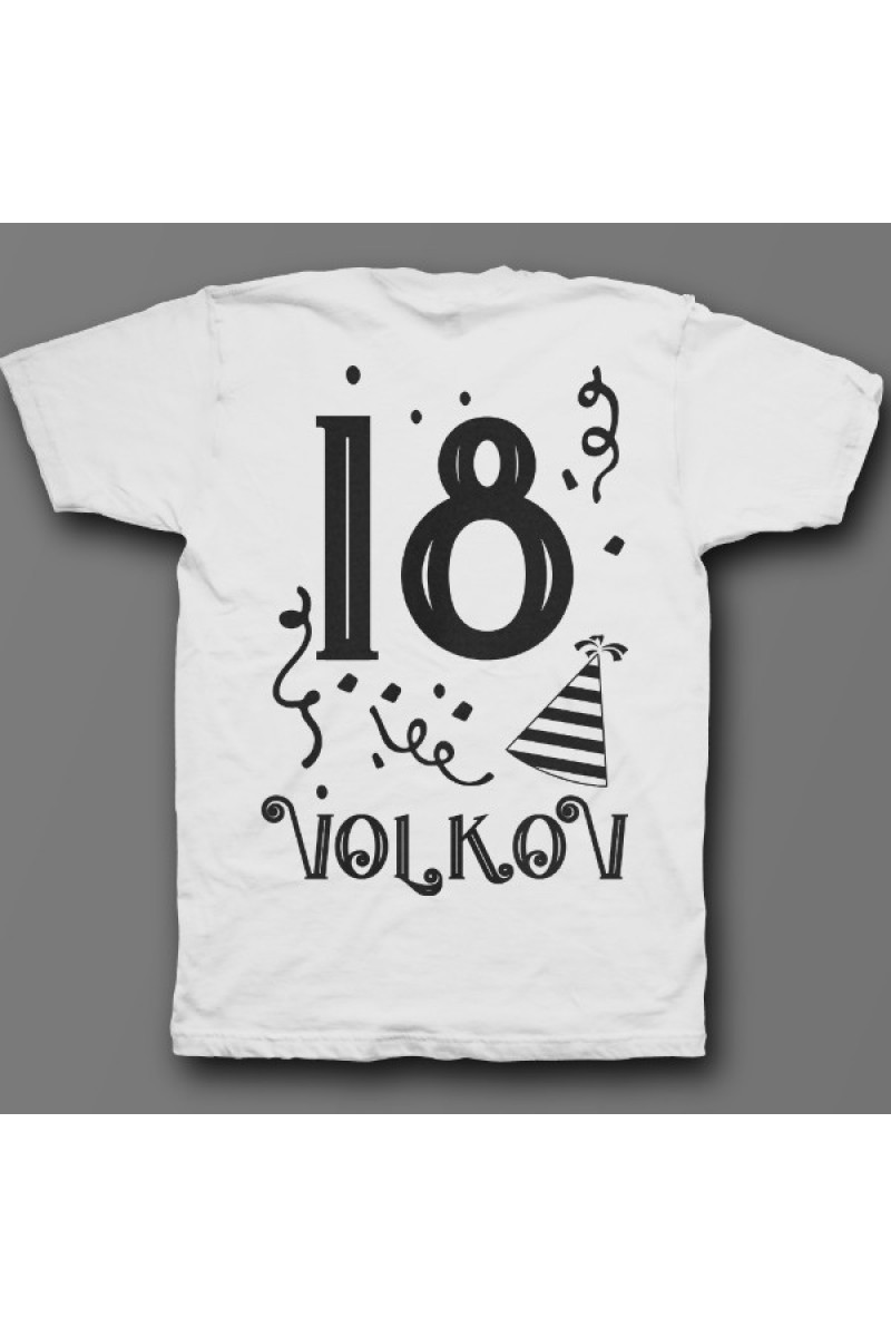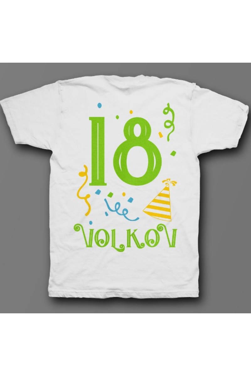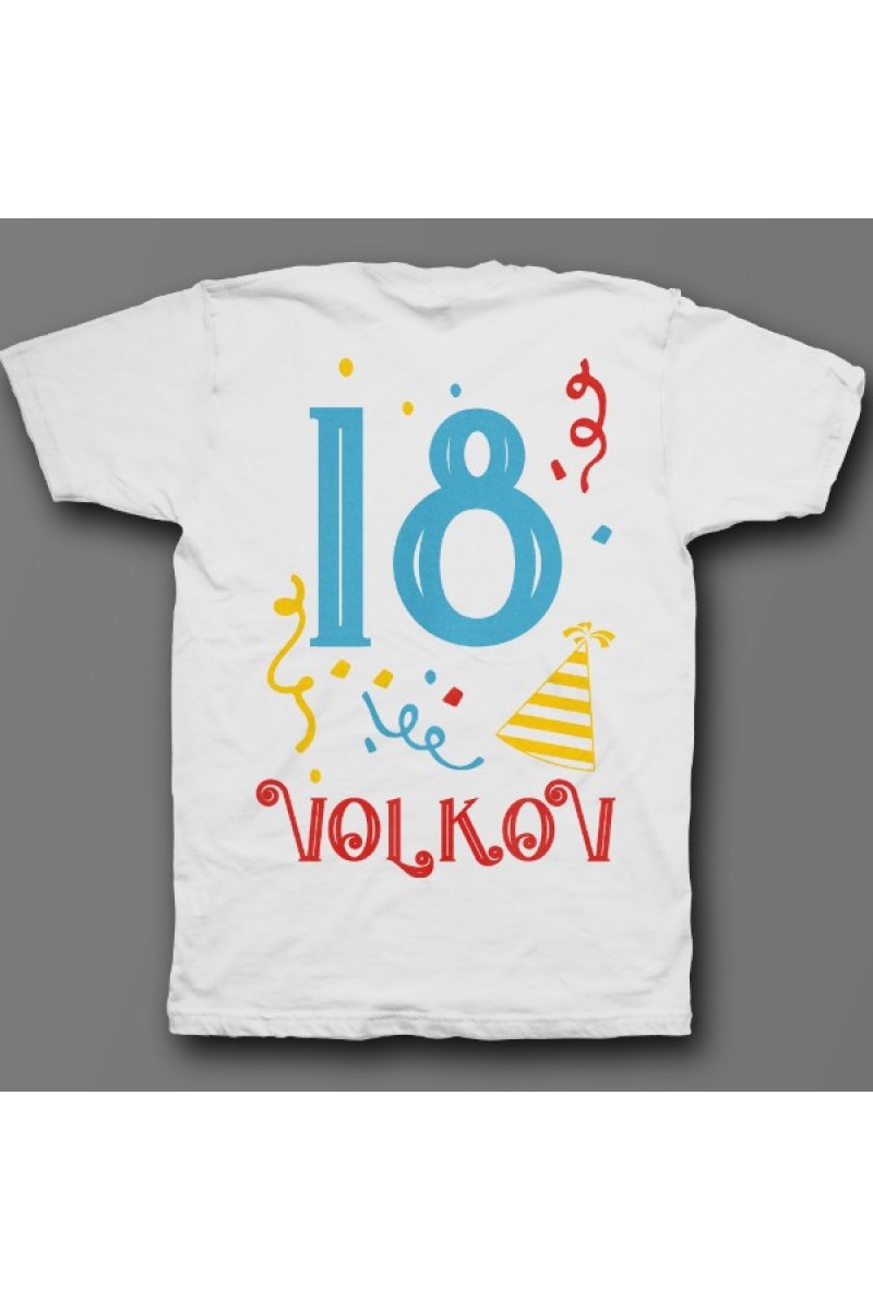 Прикольная именная футболка с праздничным шрифтом. Помимо надписи на футболке есть изображение колпака и конфетти.