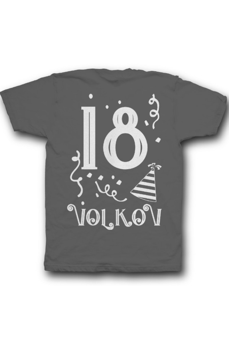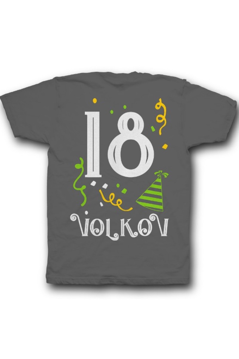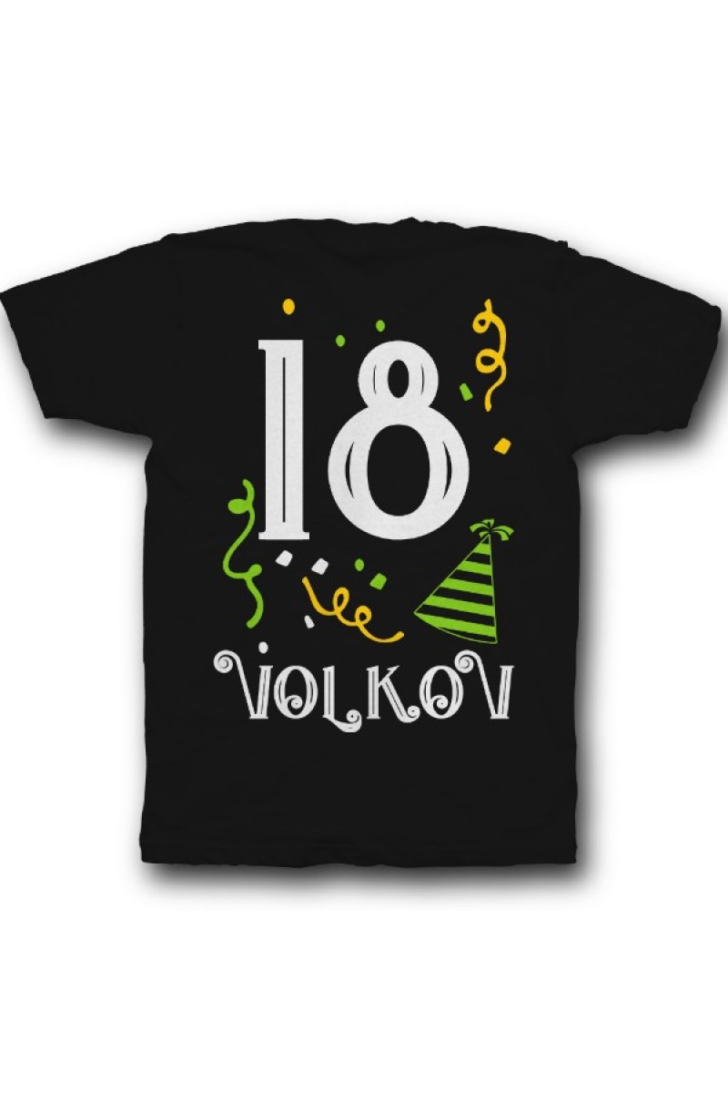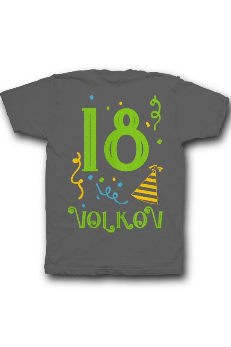 Прикольная именная футболка с праздничным шрифтом. Помимо надписи на футболке есть изображение колпака и конфетти.