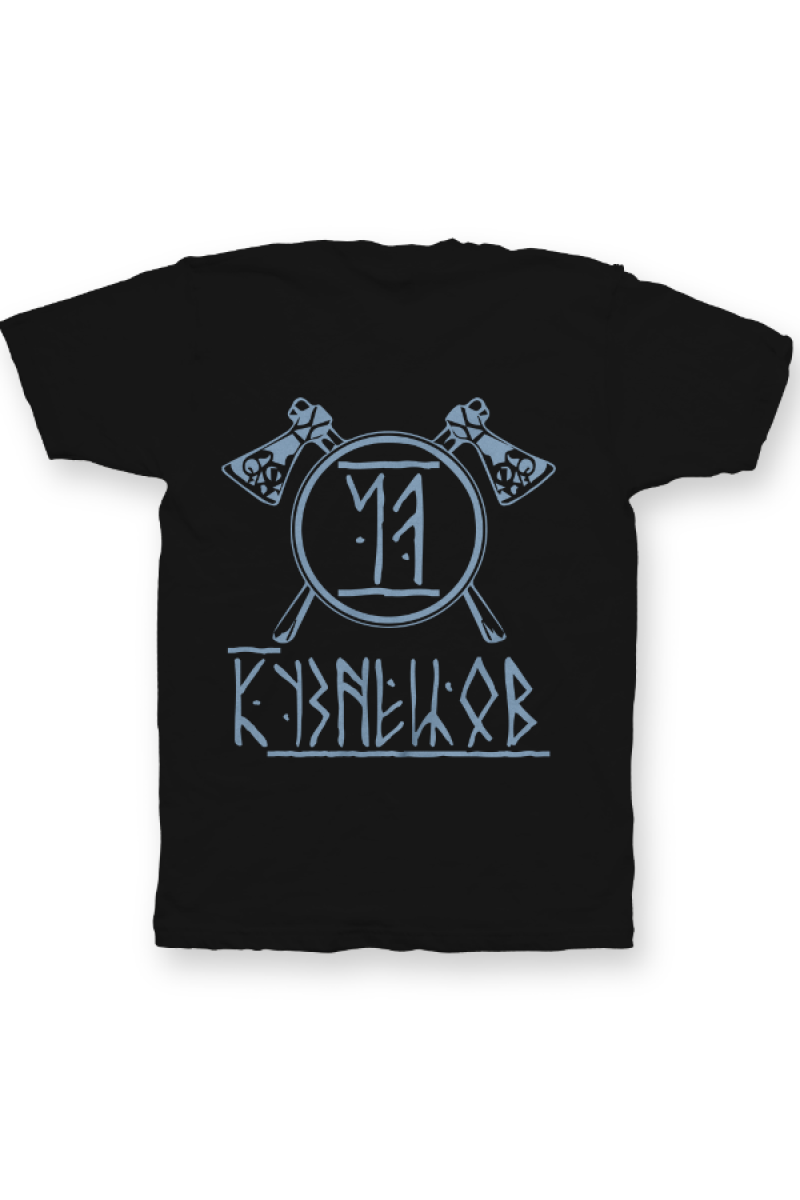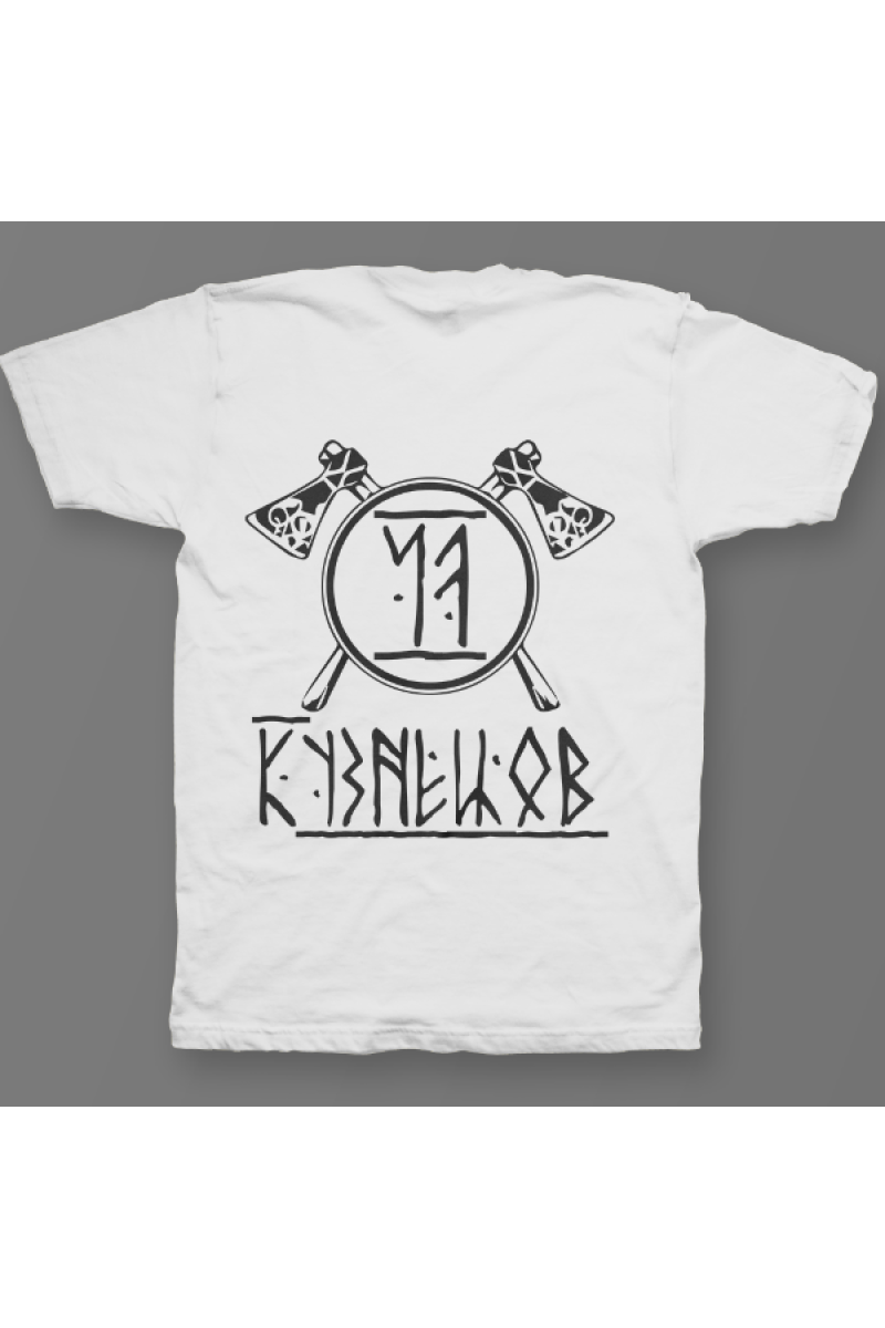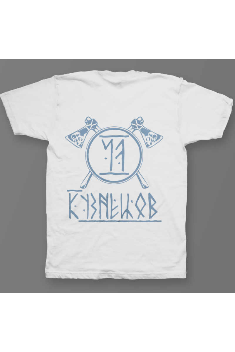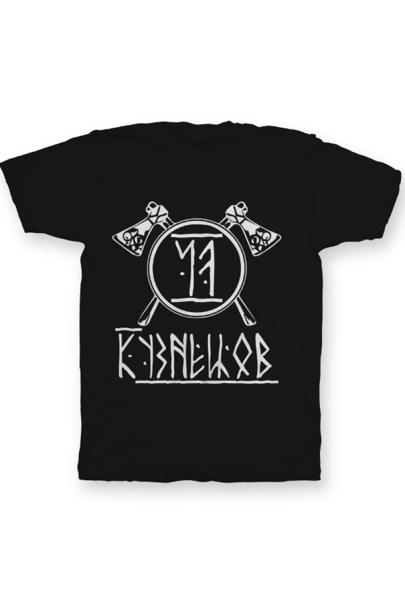 Именная футболка с руническим шрифтом. Помимо надписи на футболке есть изображение топоров и щита.