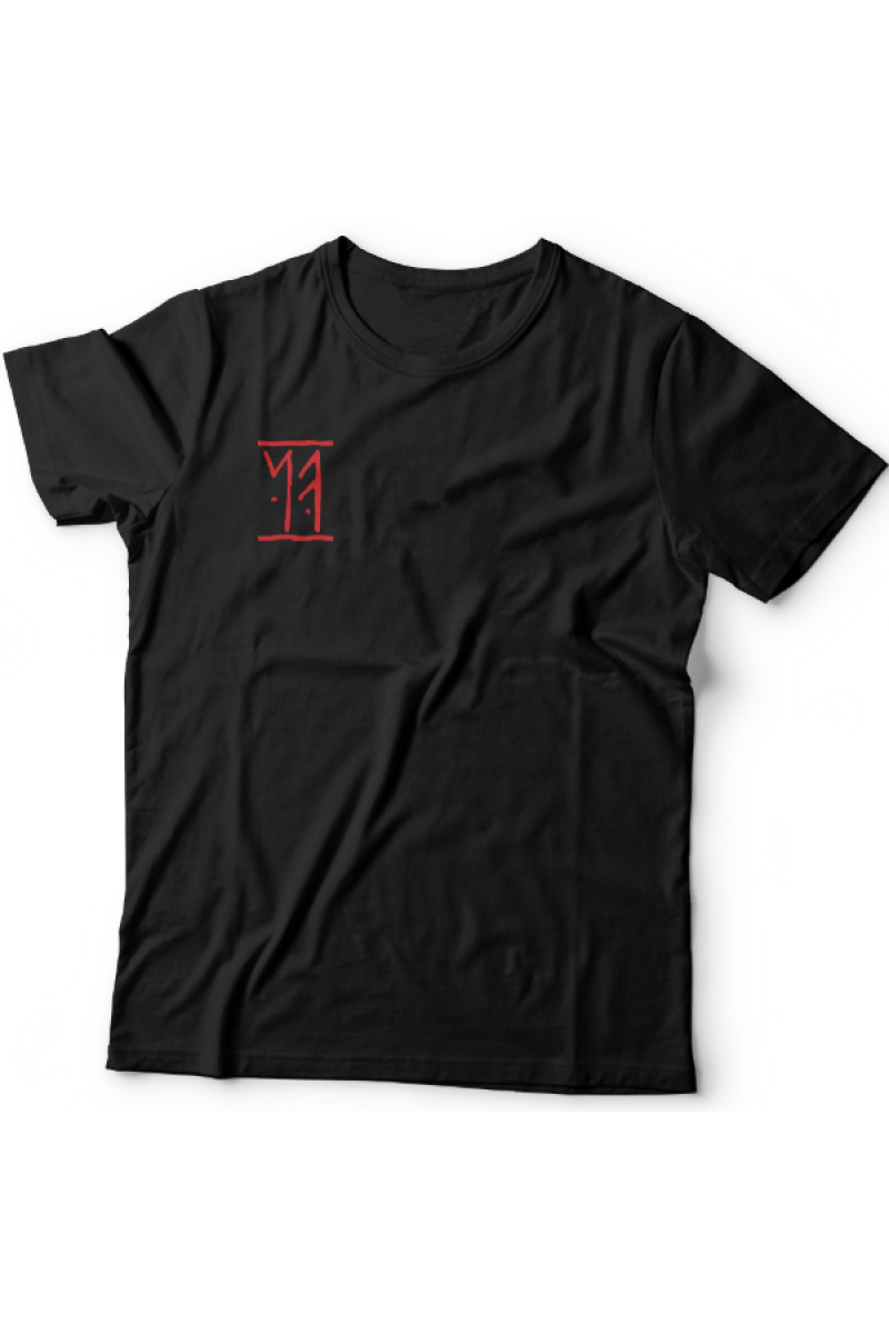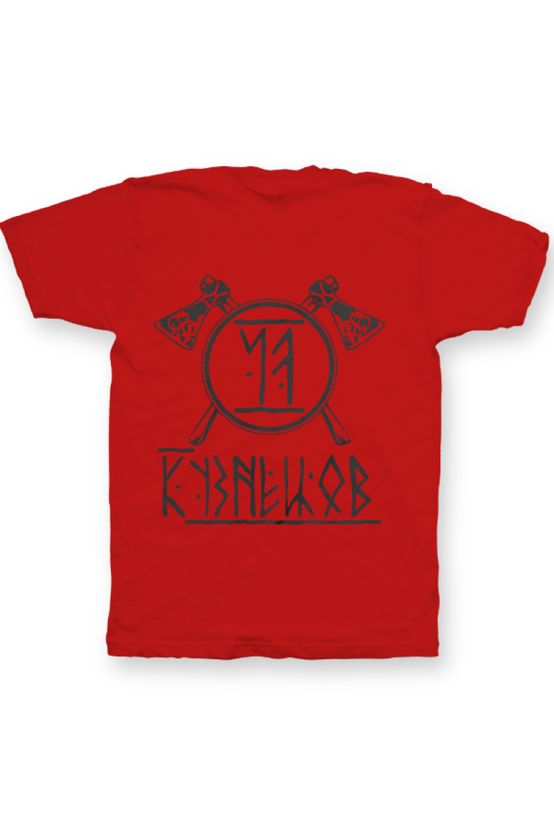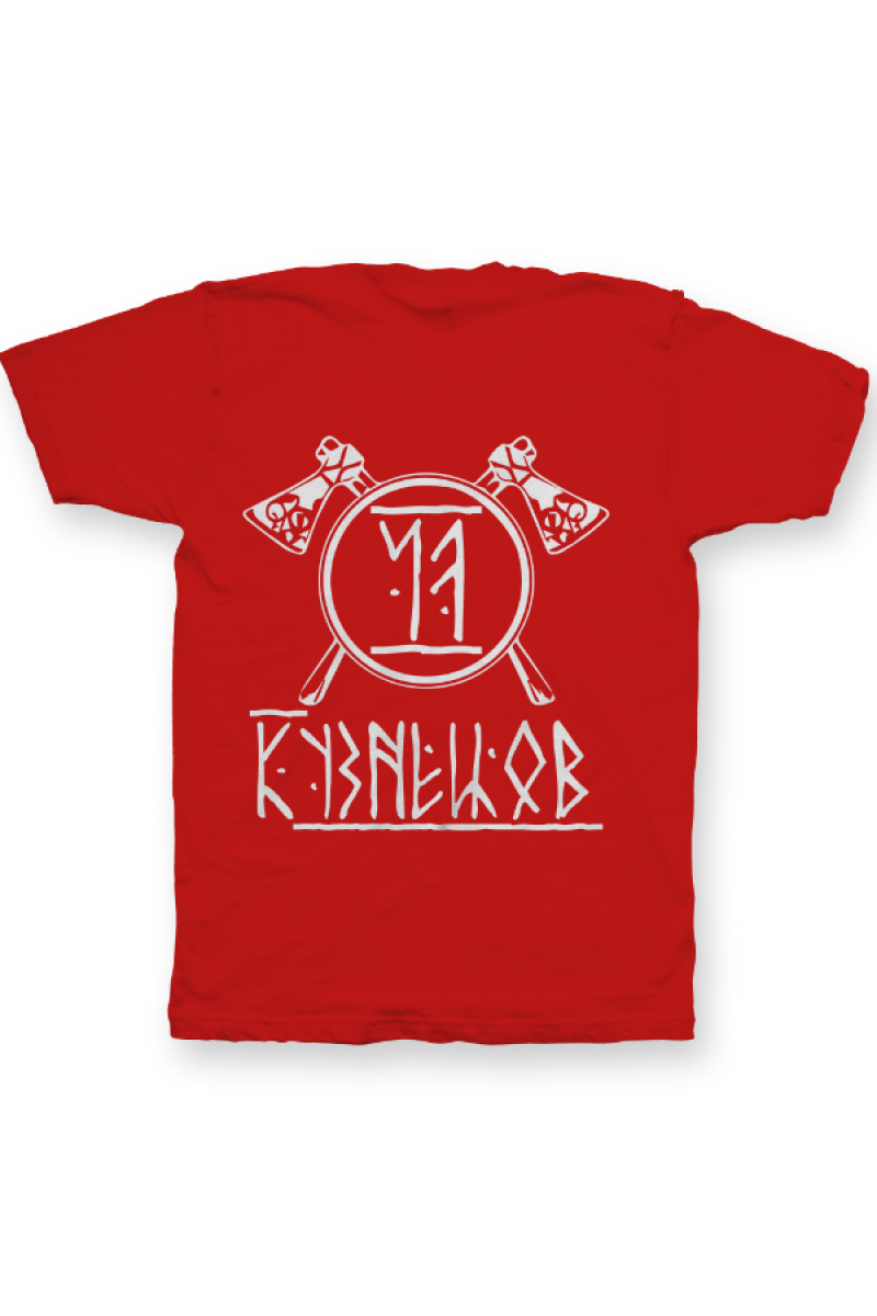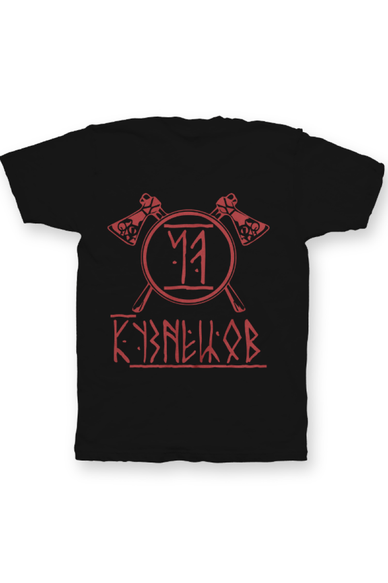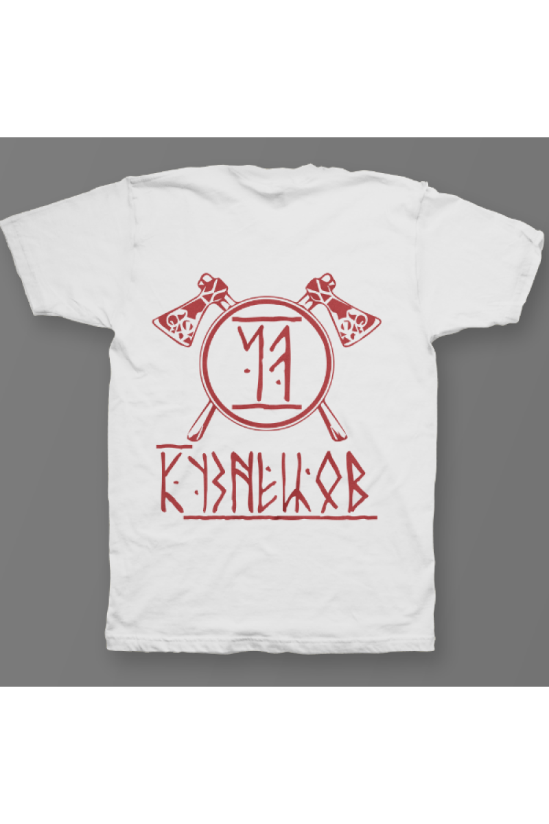 Именная футболка с руническим шрифтом. Помимо надписи на футболке есть изображение топоров и щита.