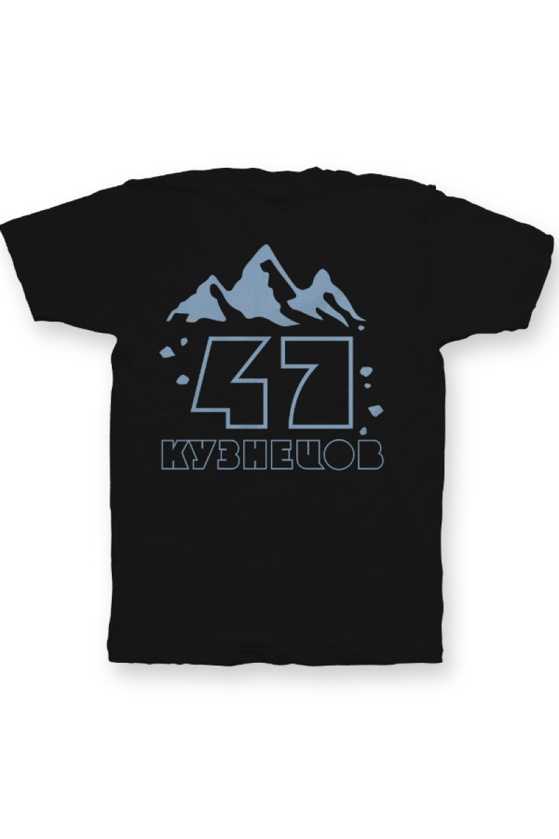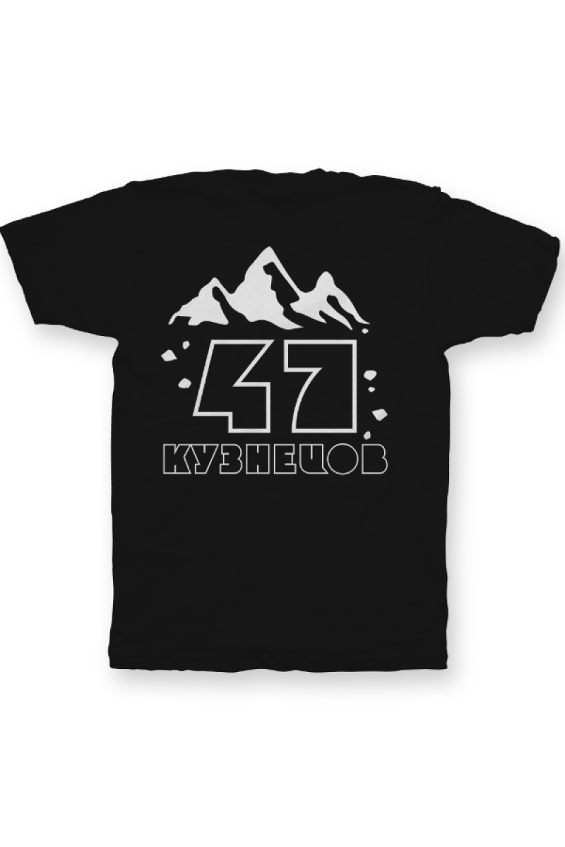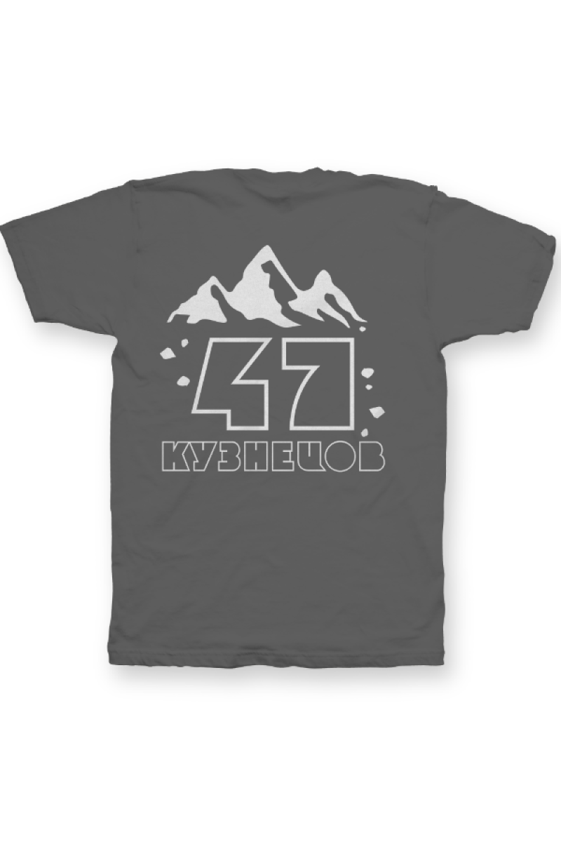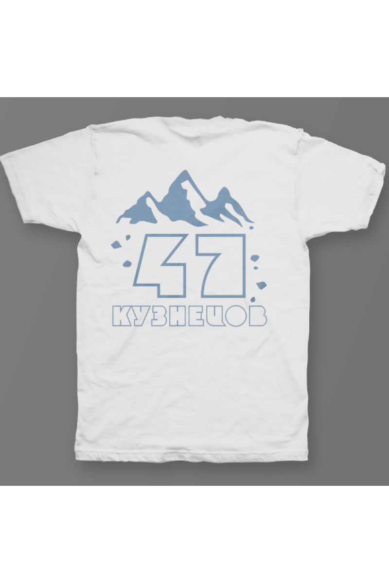 Именная футболка с необычным шрифтом. Помимо надписи на футболке есть изображение гор.