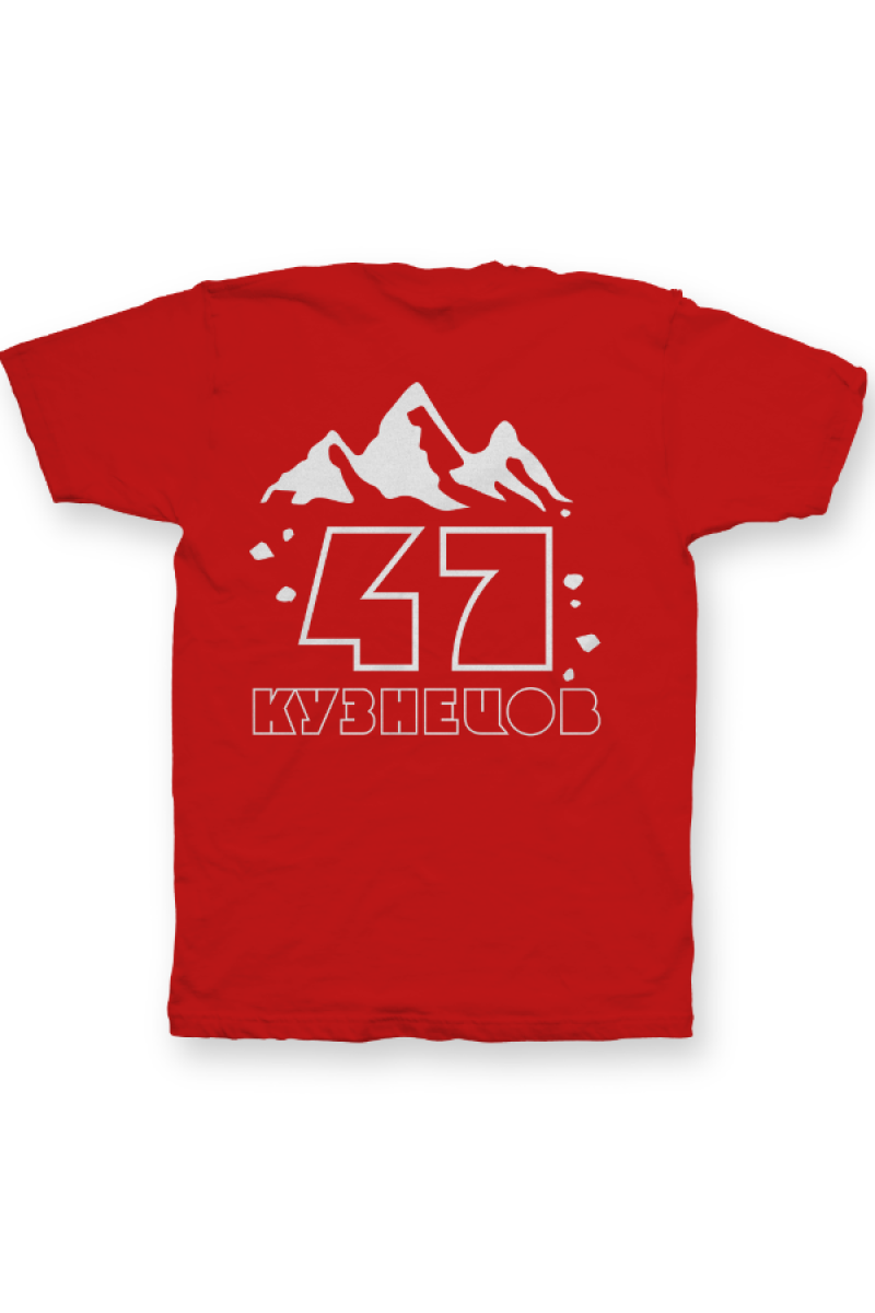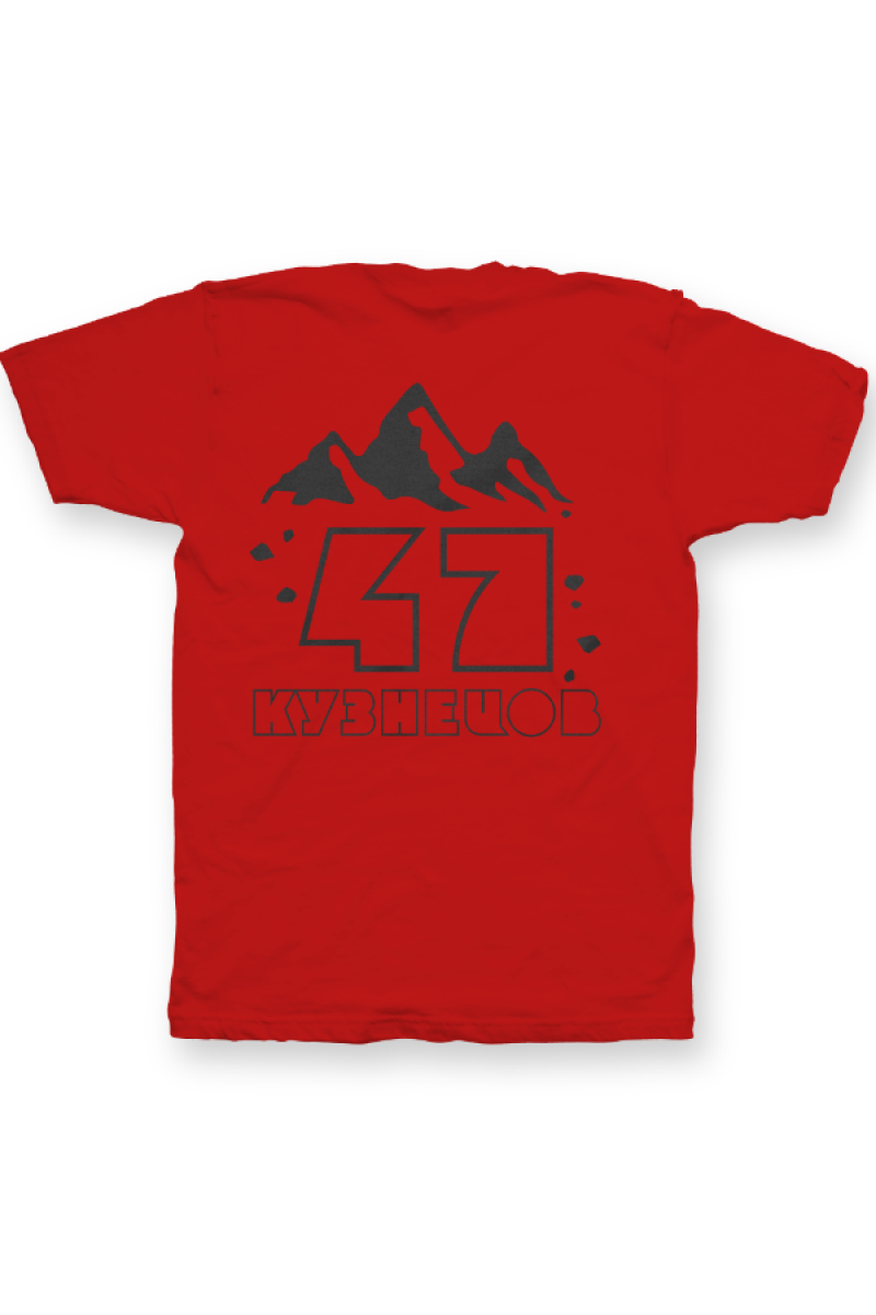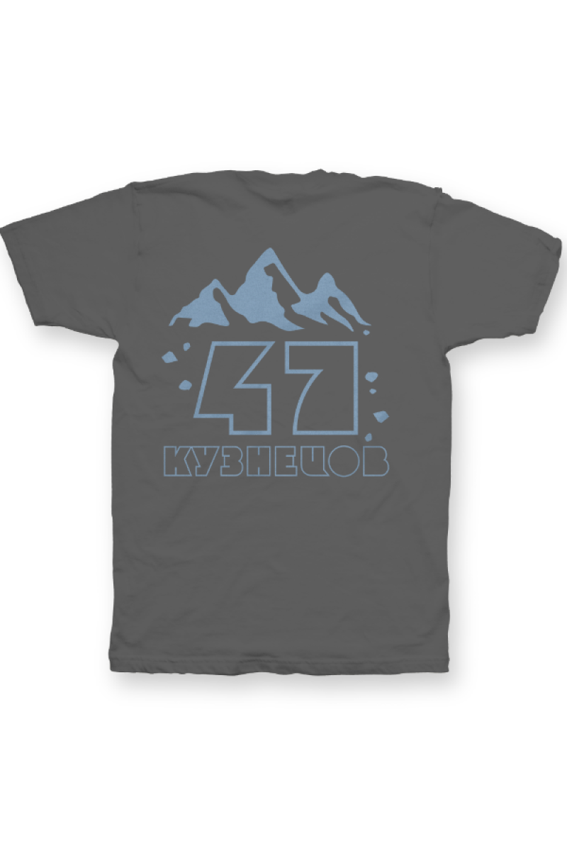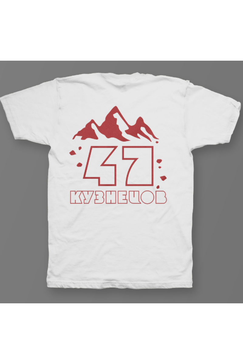 Именная футболка с необычным шрифтом. Помимо надписи на футболке есть изображение гор.
