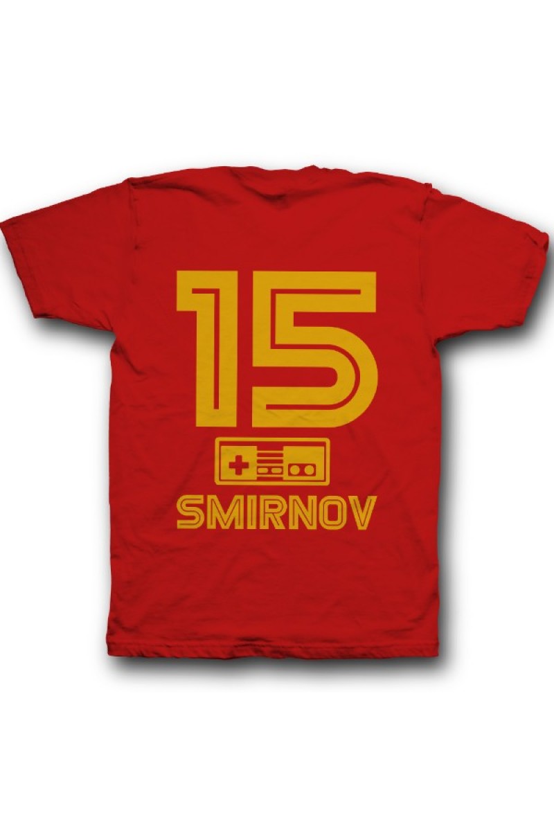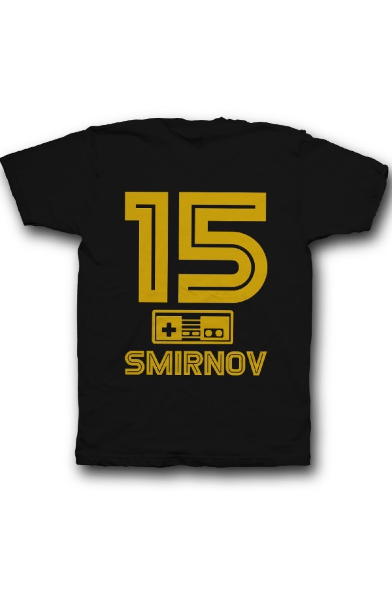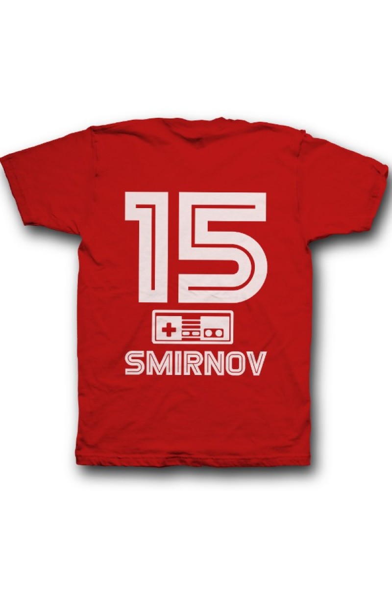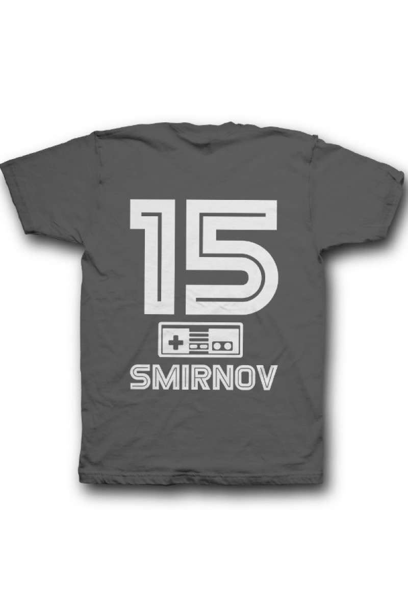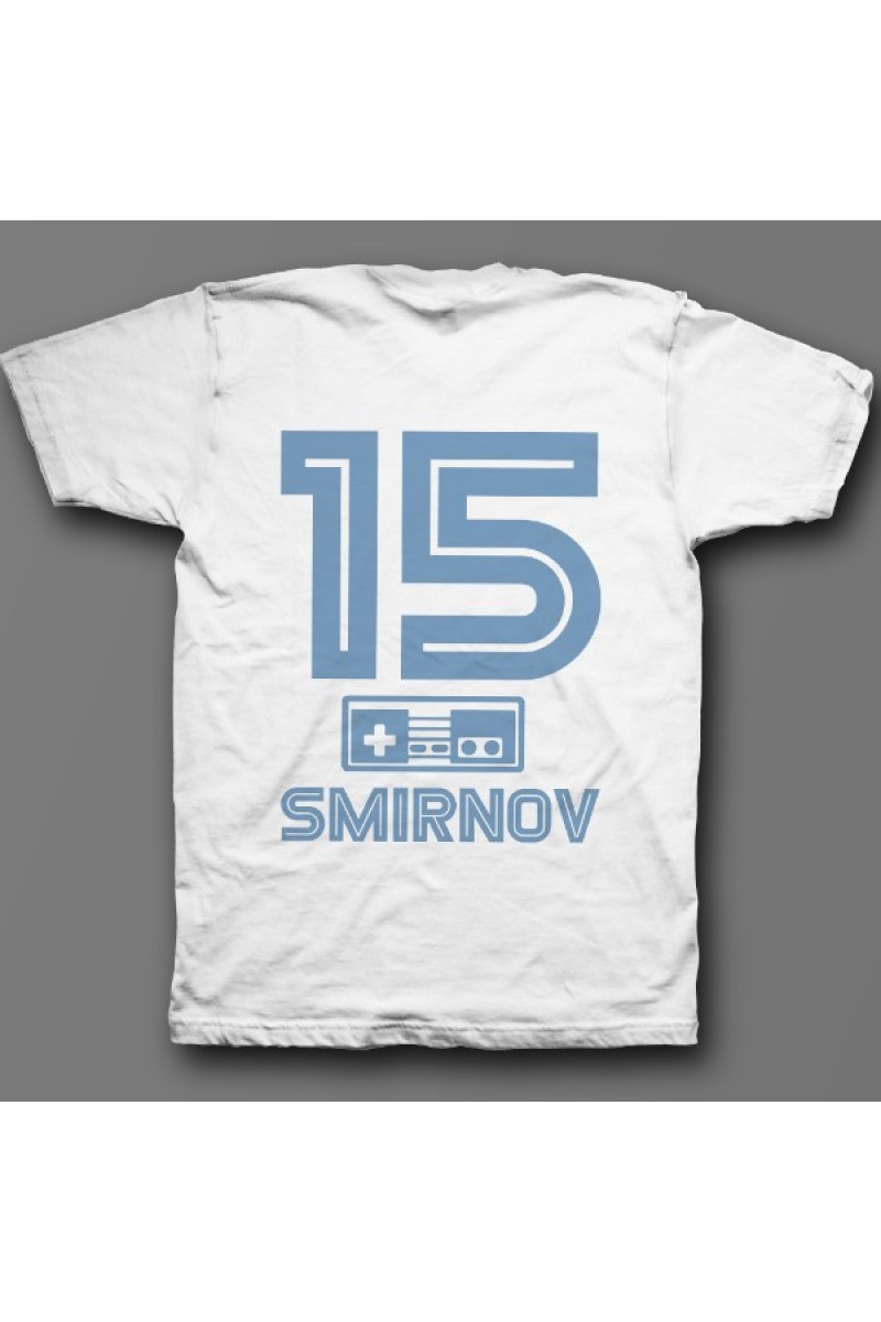 Прикольная именная футболка с шрифтом из игры на приставке Nintendo. Помимо надписи на футболке есть изображение джойстика.