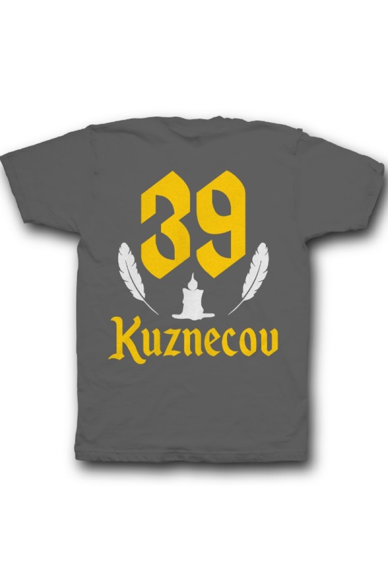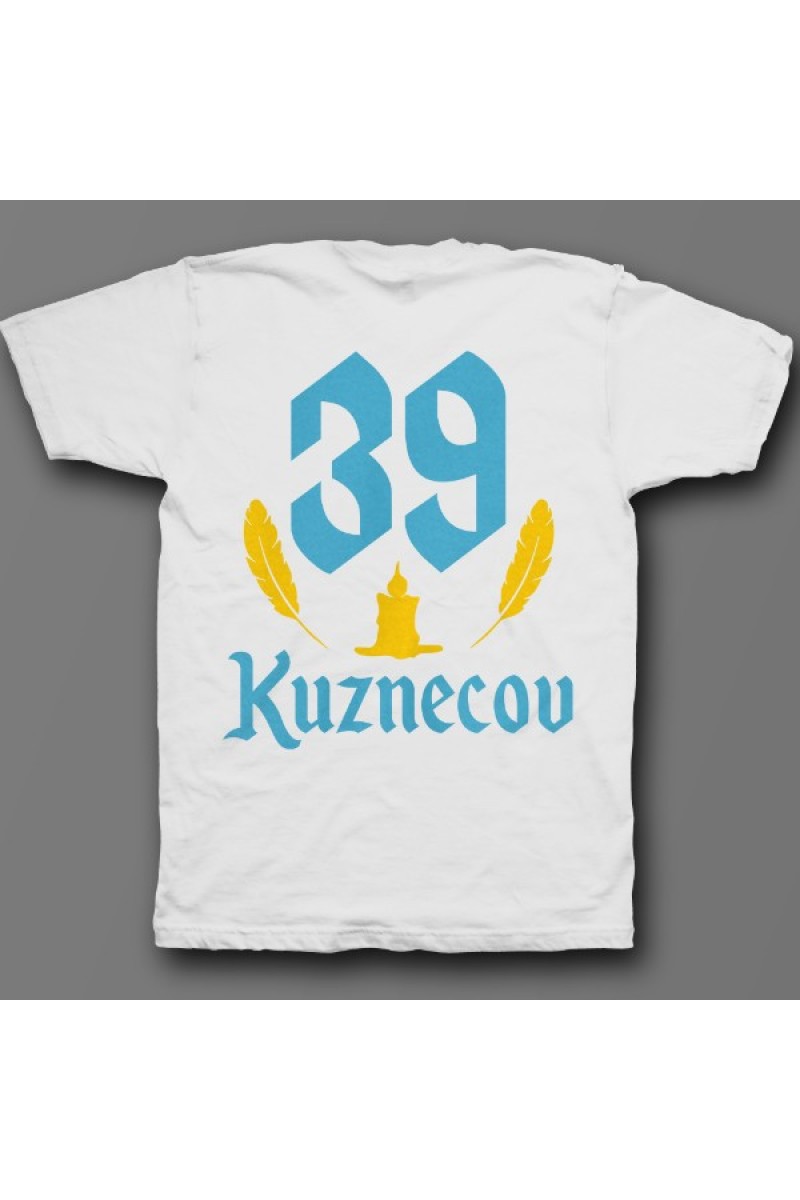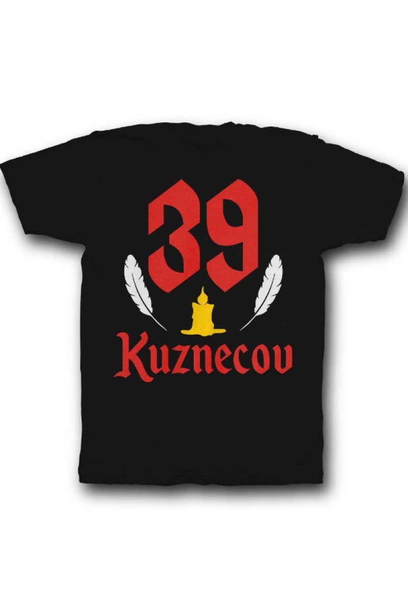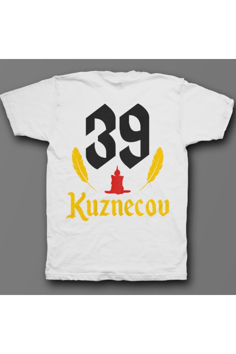 Прикольная именная футболка с шрифтом старого времени. Помимо надписи на футболке есть изображение свечки и письменных перьев.