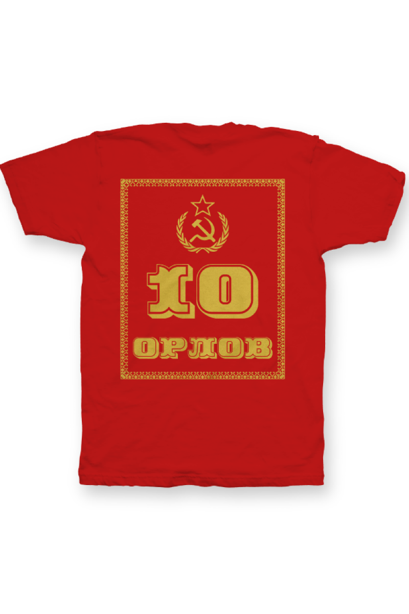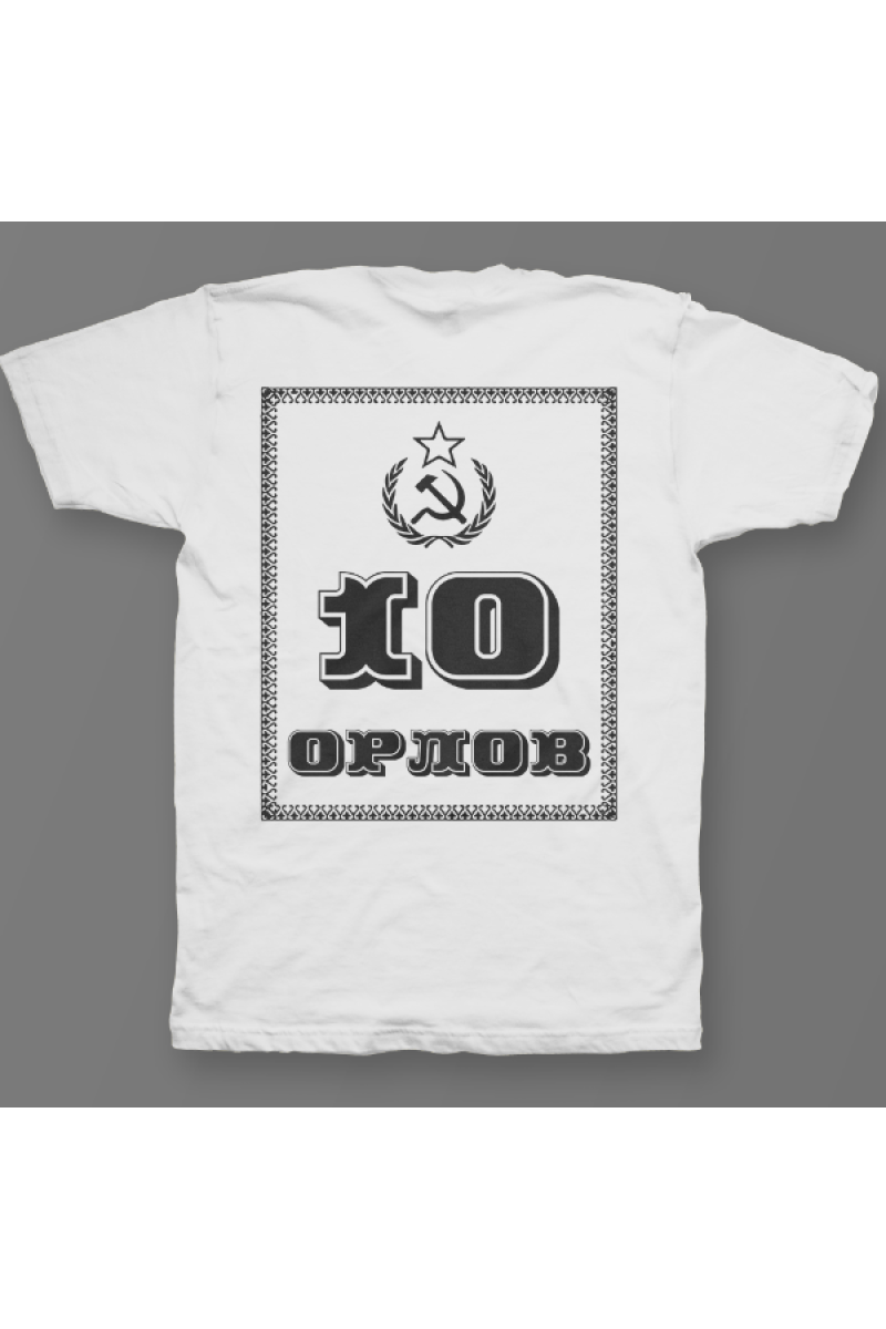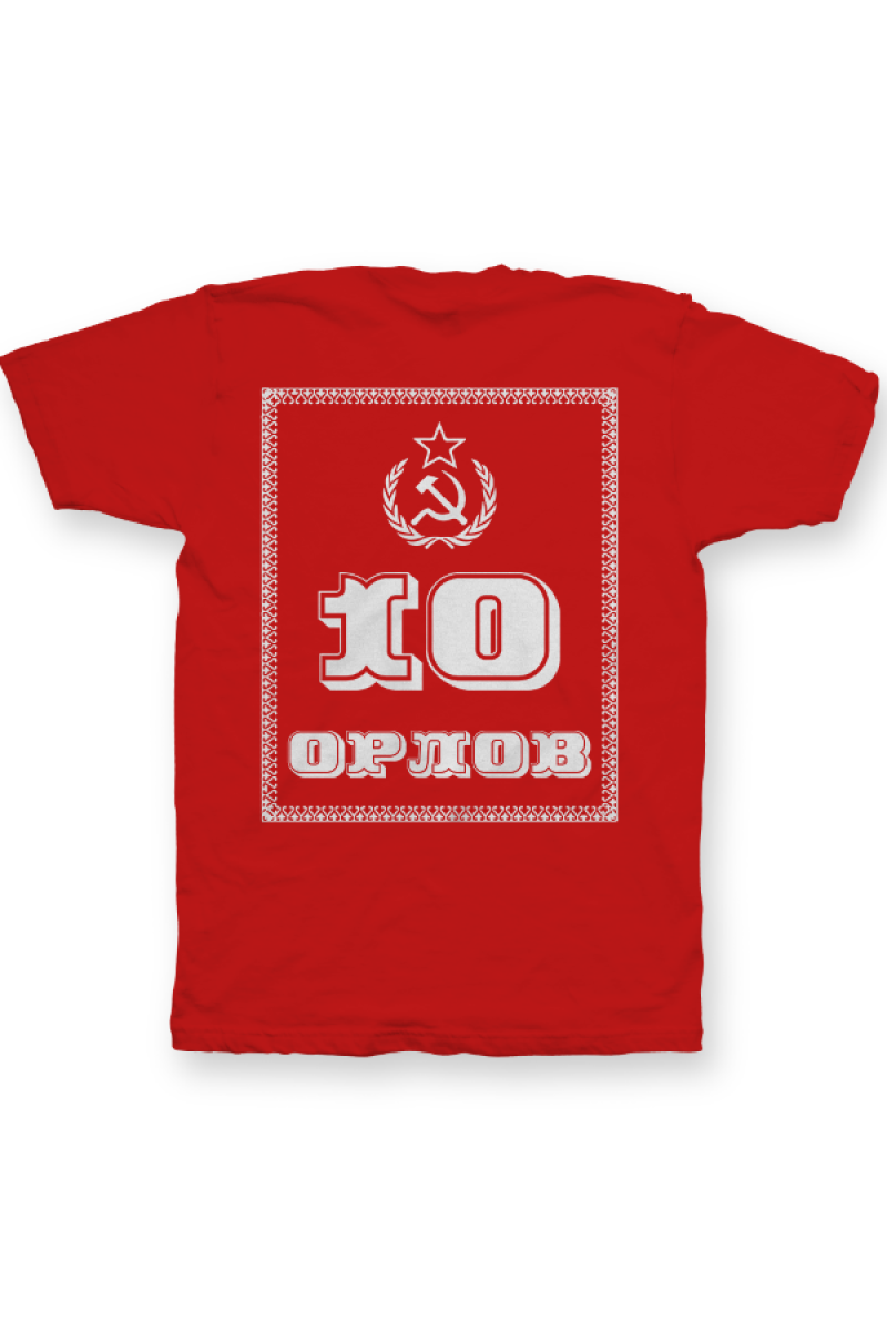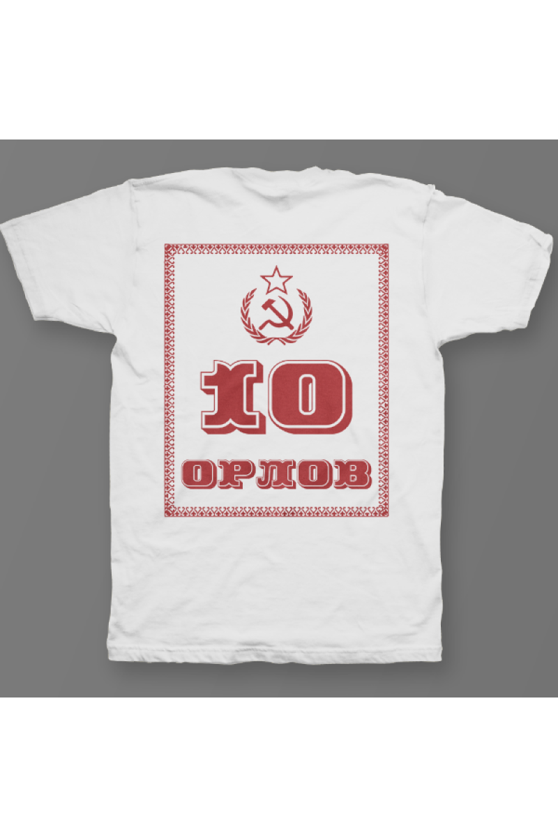 Именная футболка с революционным шрифтом. Помимо надписи на футболке есть изображение серпа и молота.