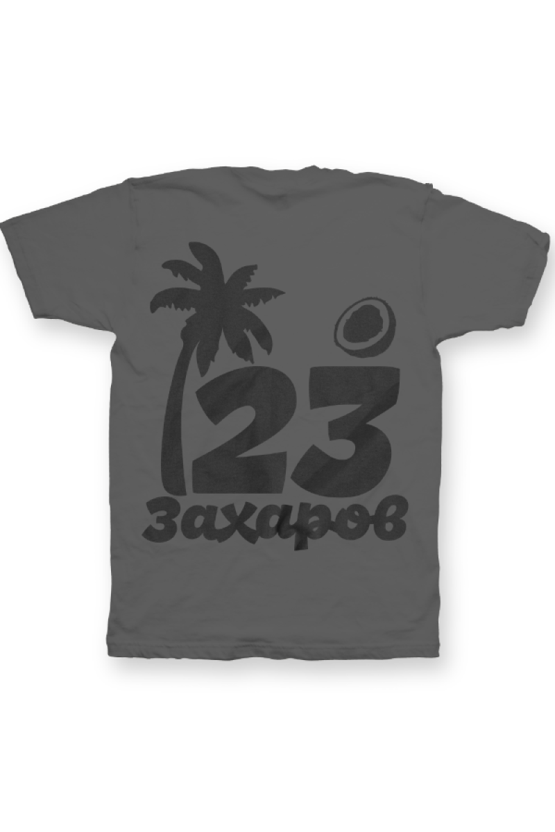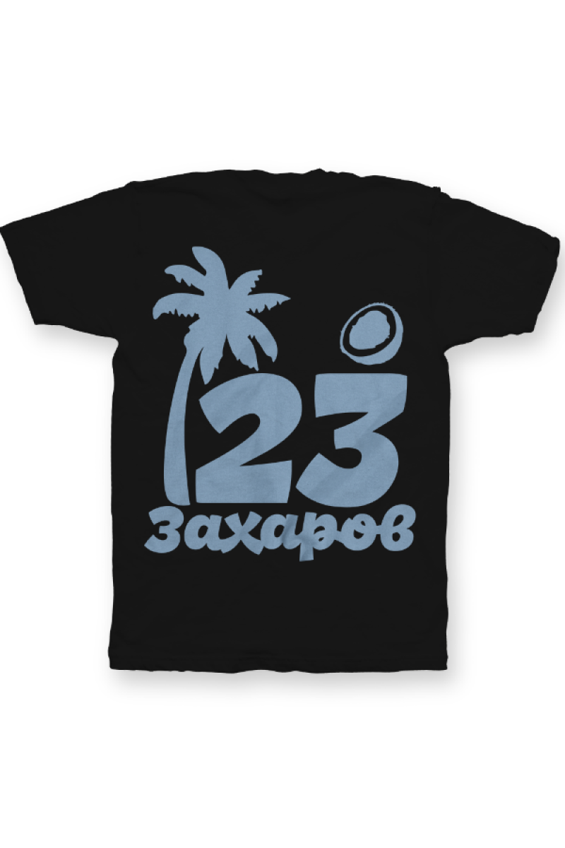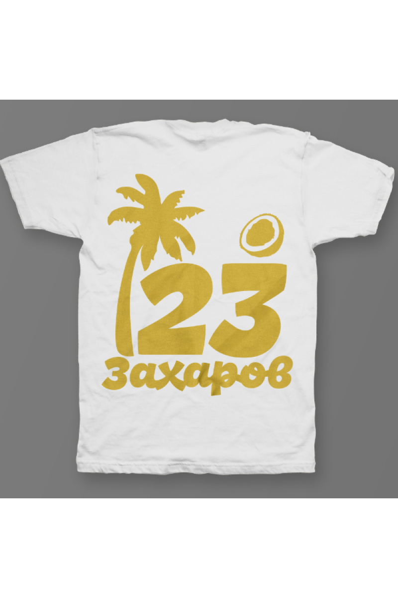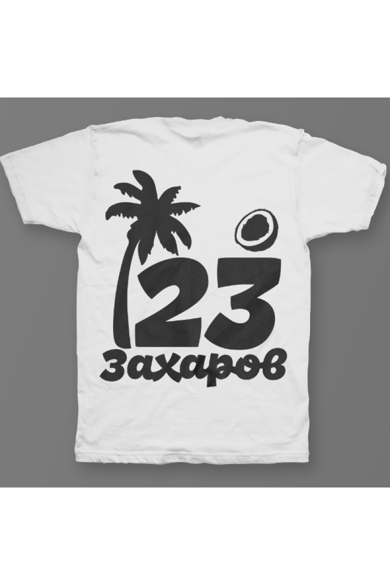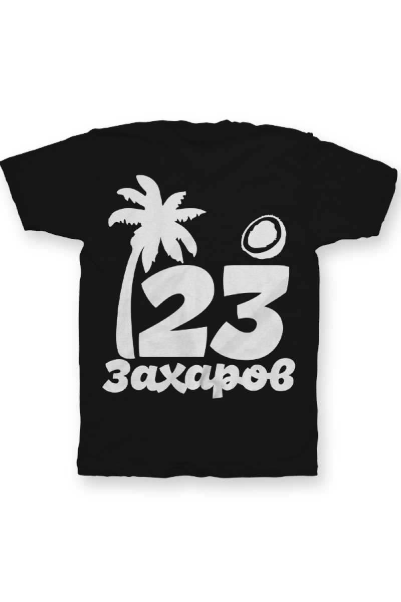 Именная футболка с тропическим шрифтом. Помимо надписи на футболке есть изображение пальмы и кокоса.