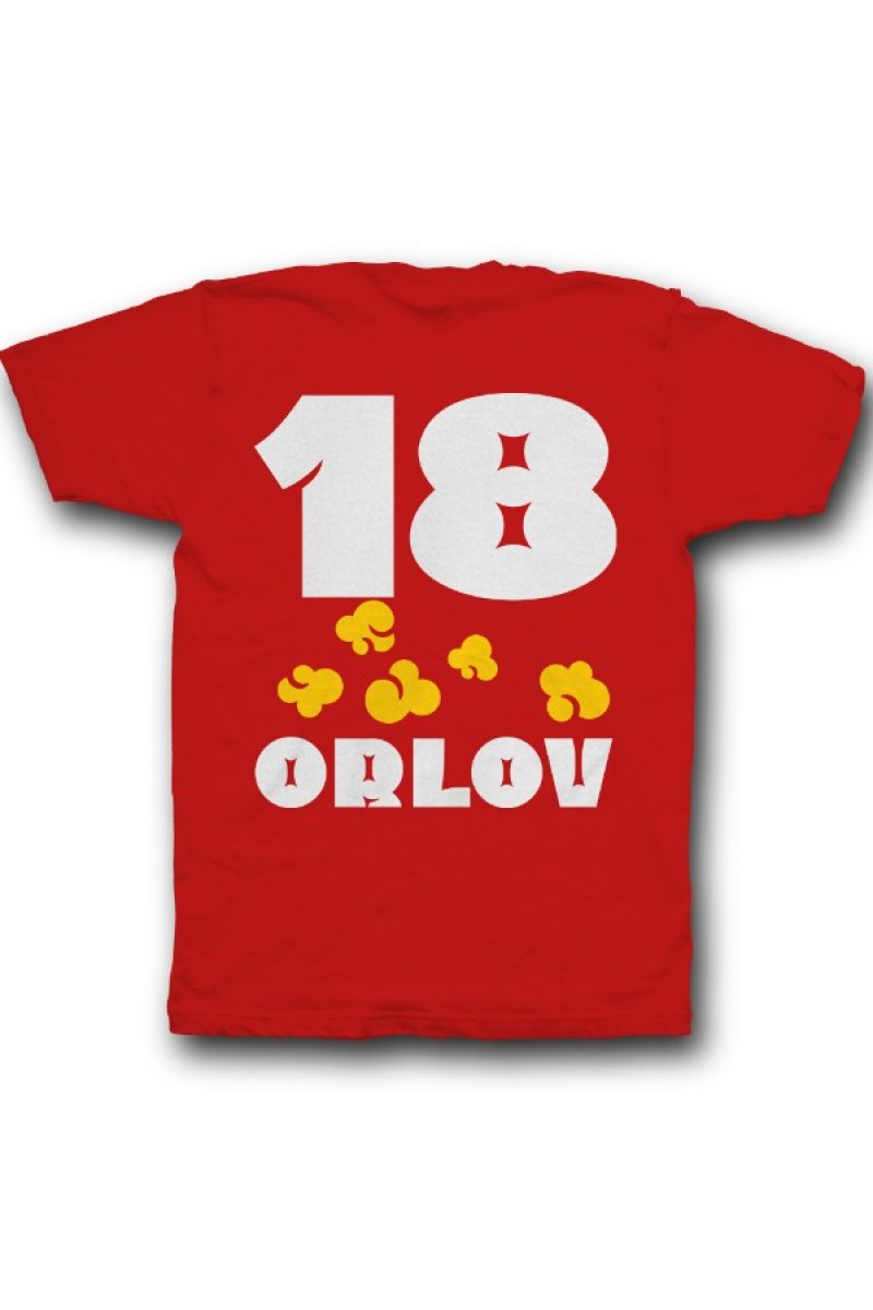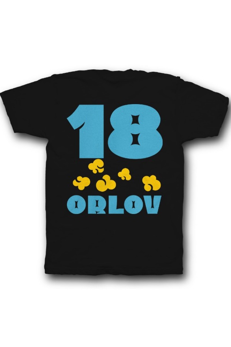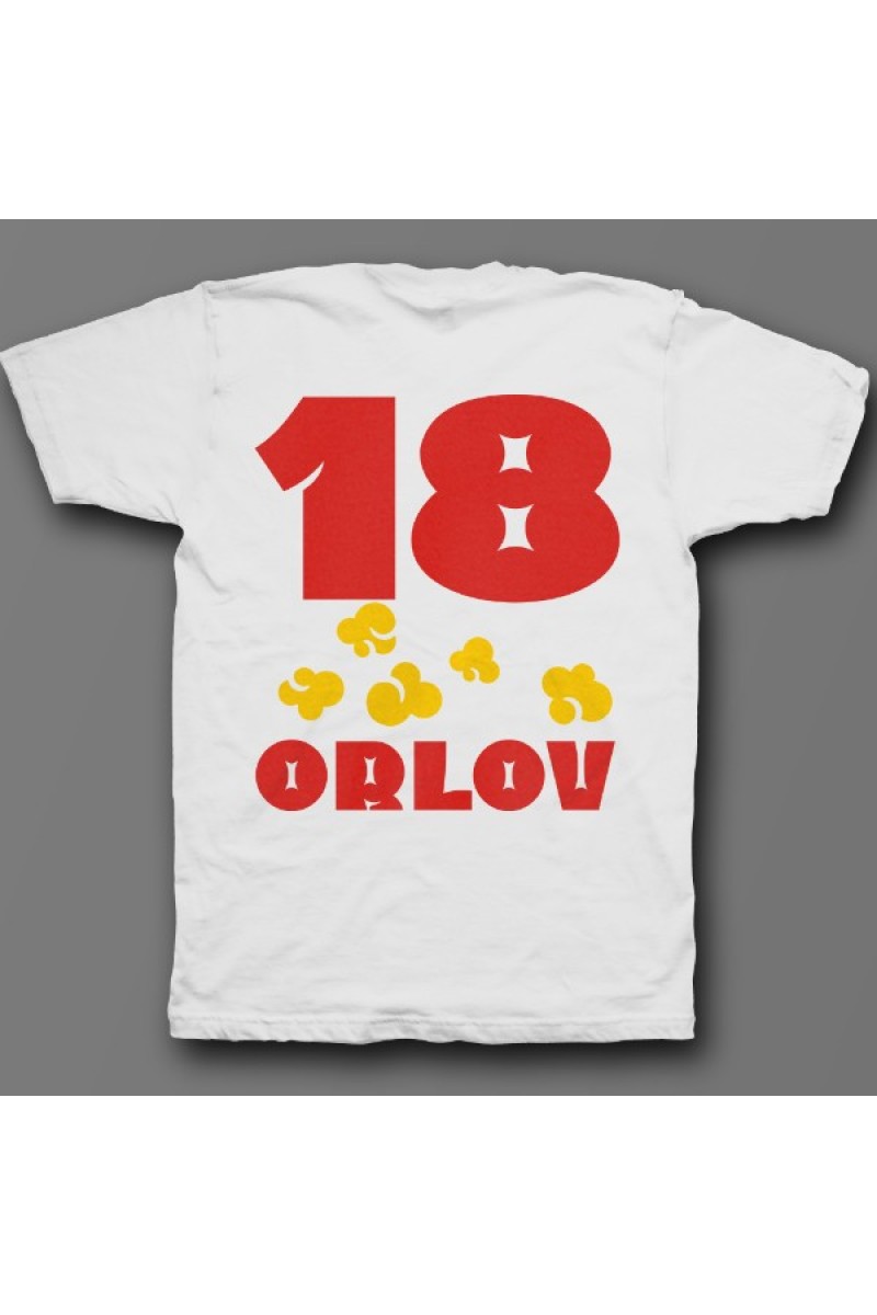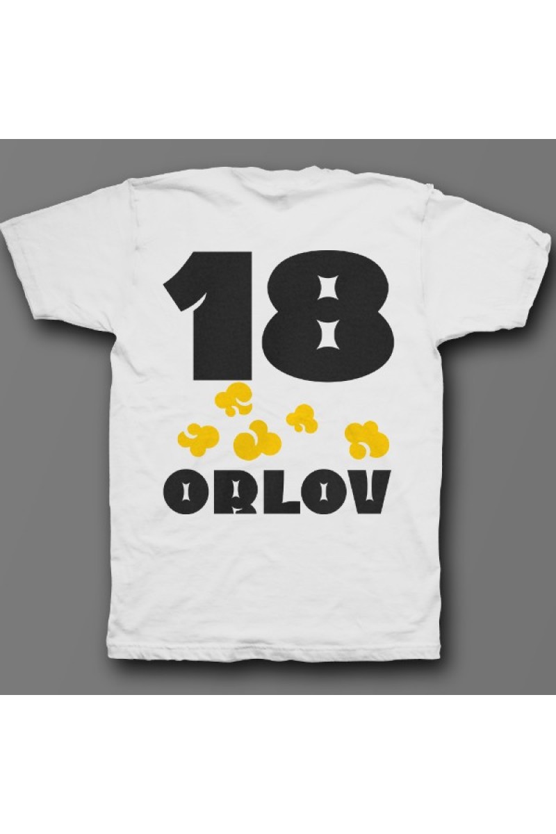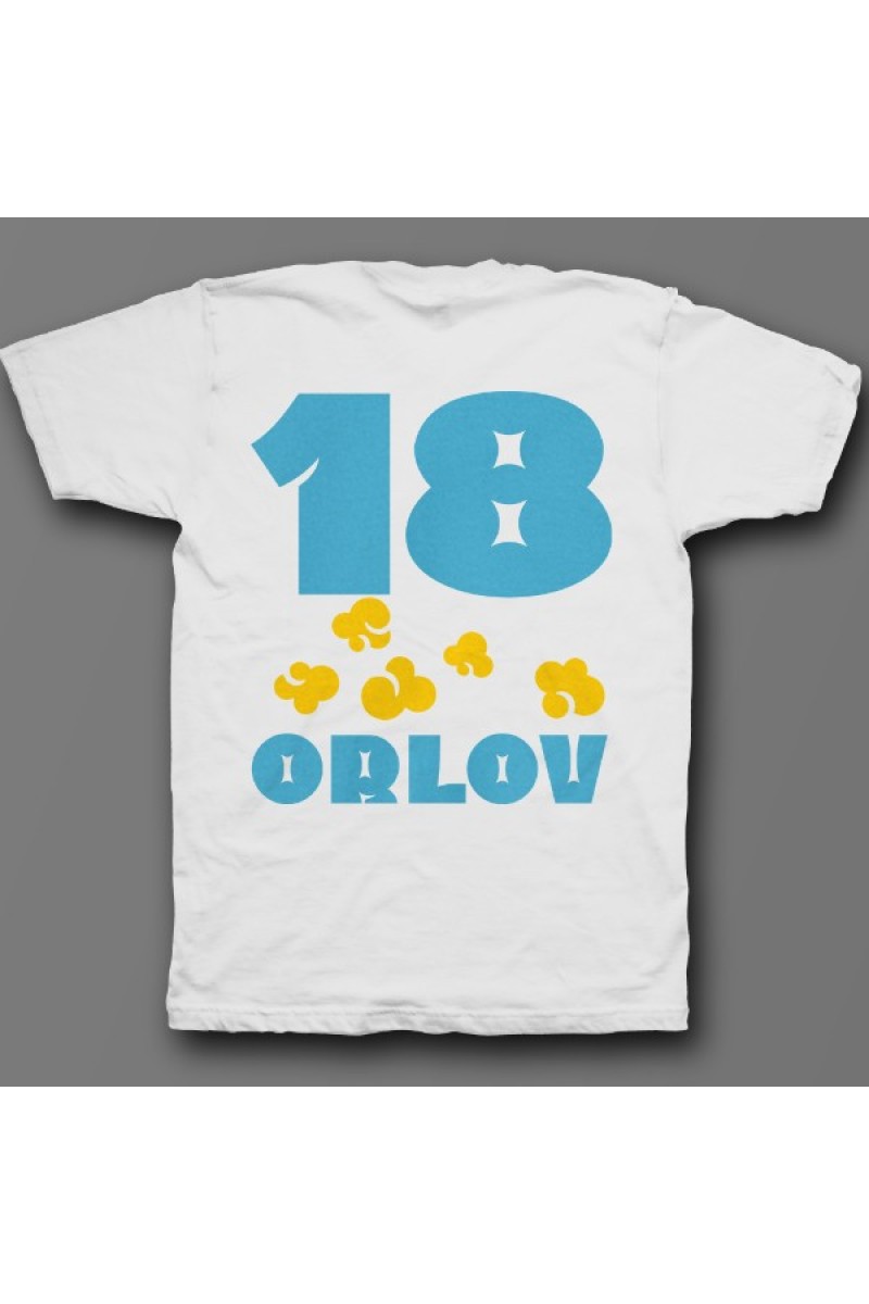 Прикольная именная футболка с веселым шрифтом. Помимо надписи на футболке есть изображение попкорна.