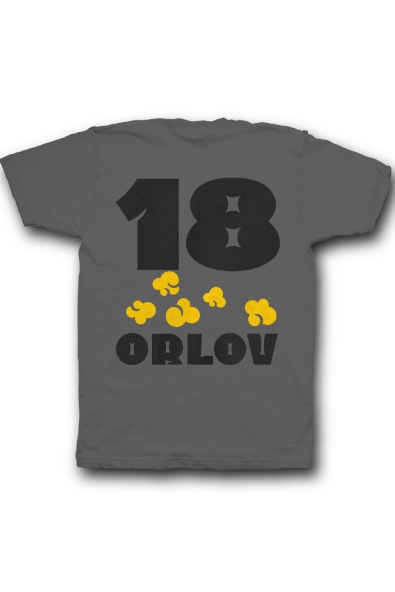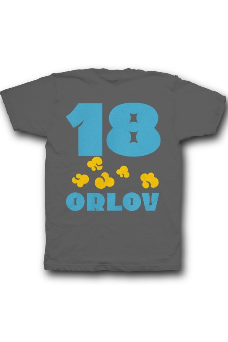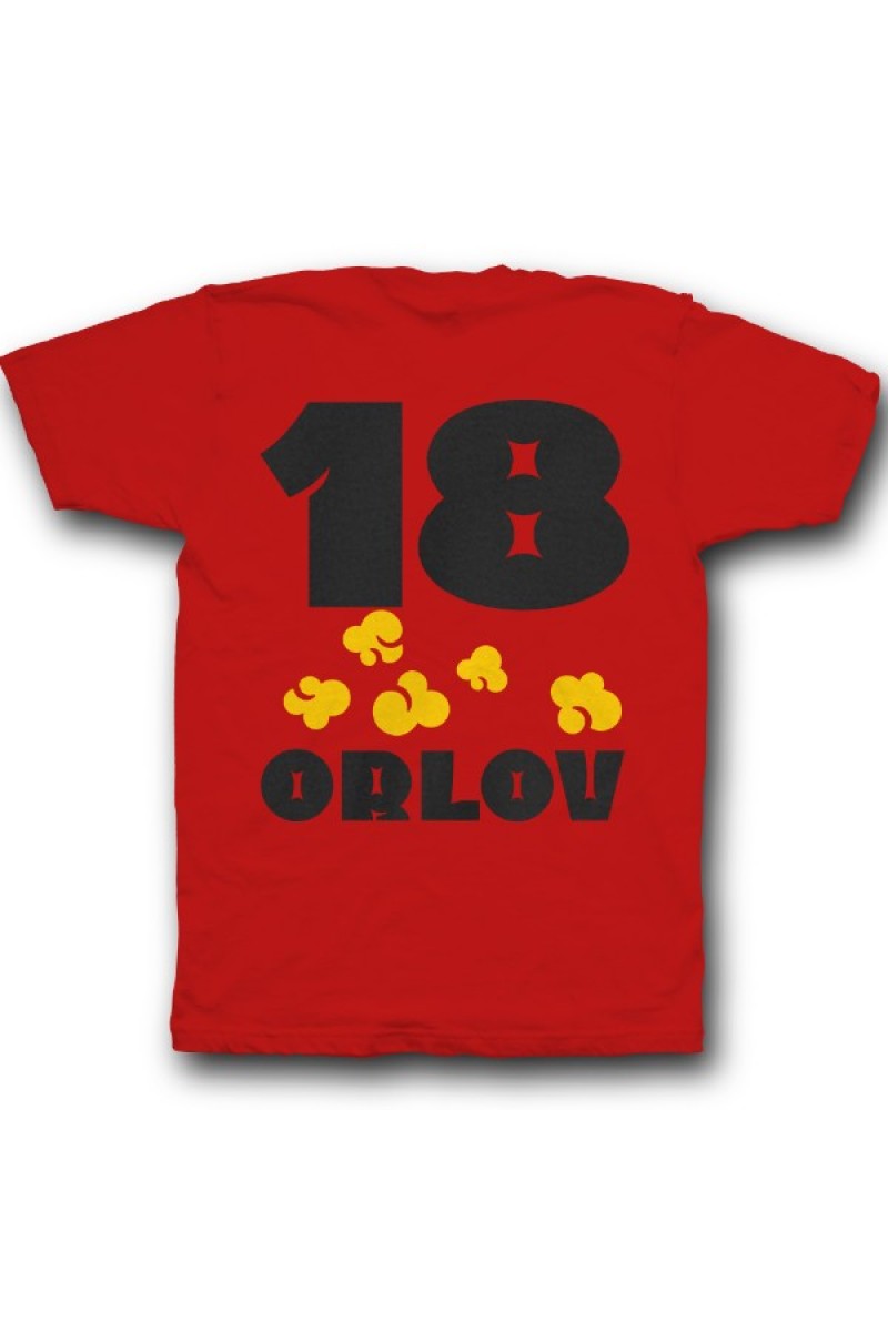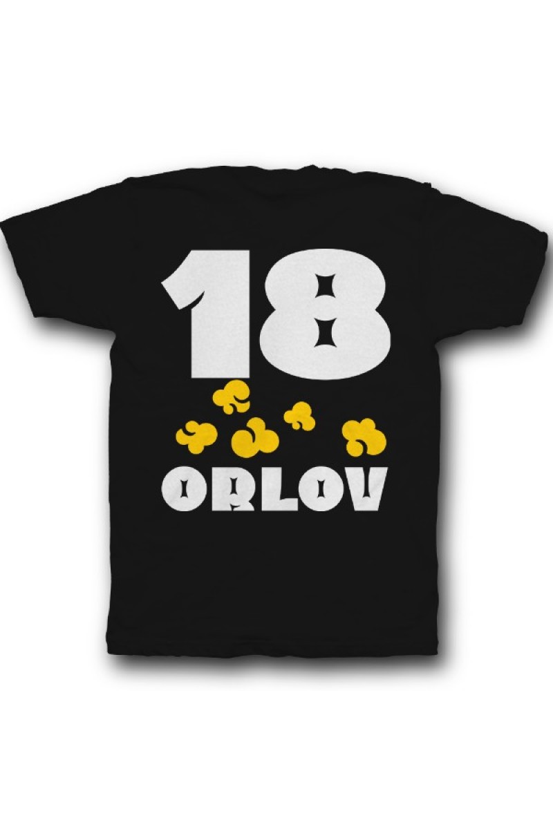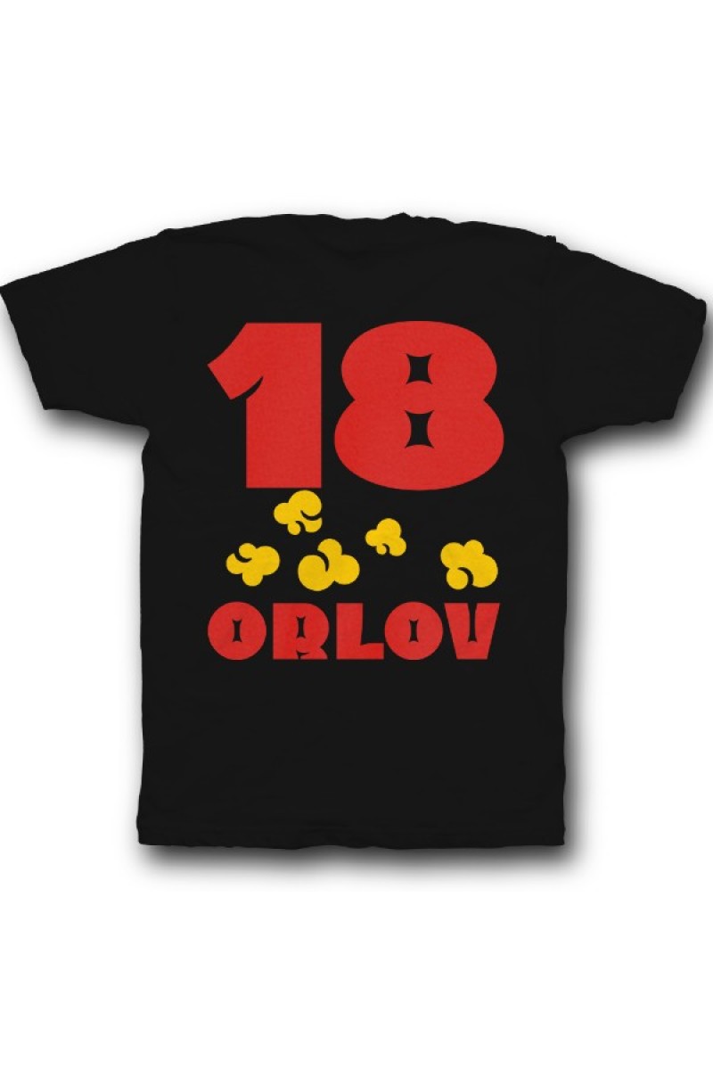 Прикольная именная футболка с веселым шрифтом. Помимо надписи на футболке есть изображение попкорна.