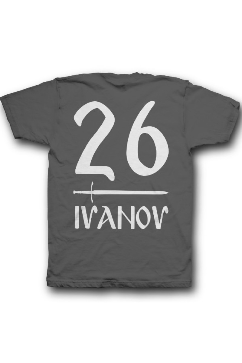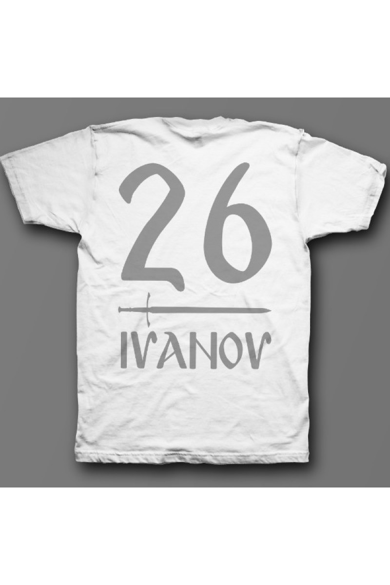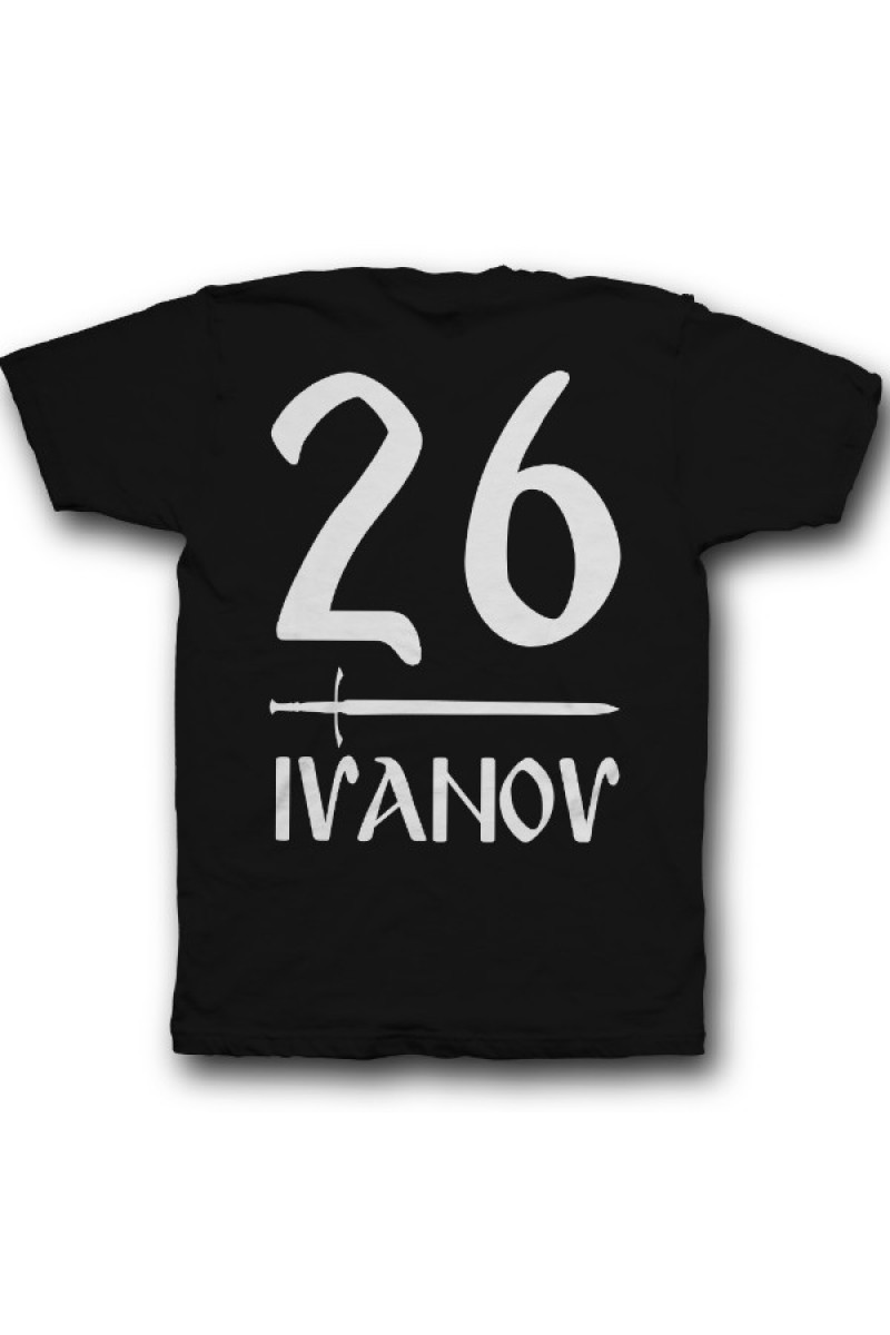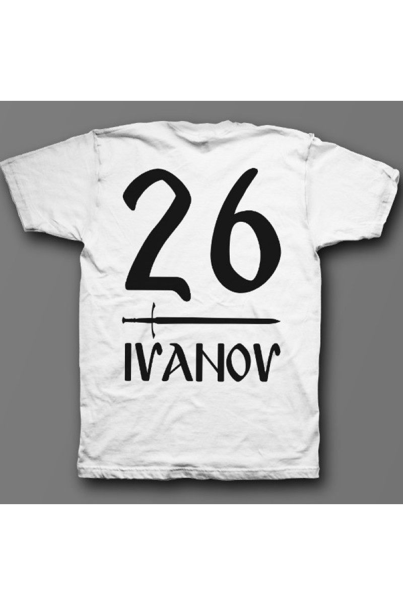 Именная футболка со славянским шрифтом. Помимо надписи на футболке есть изображение меча.