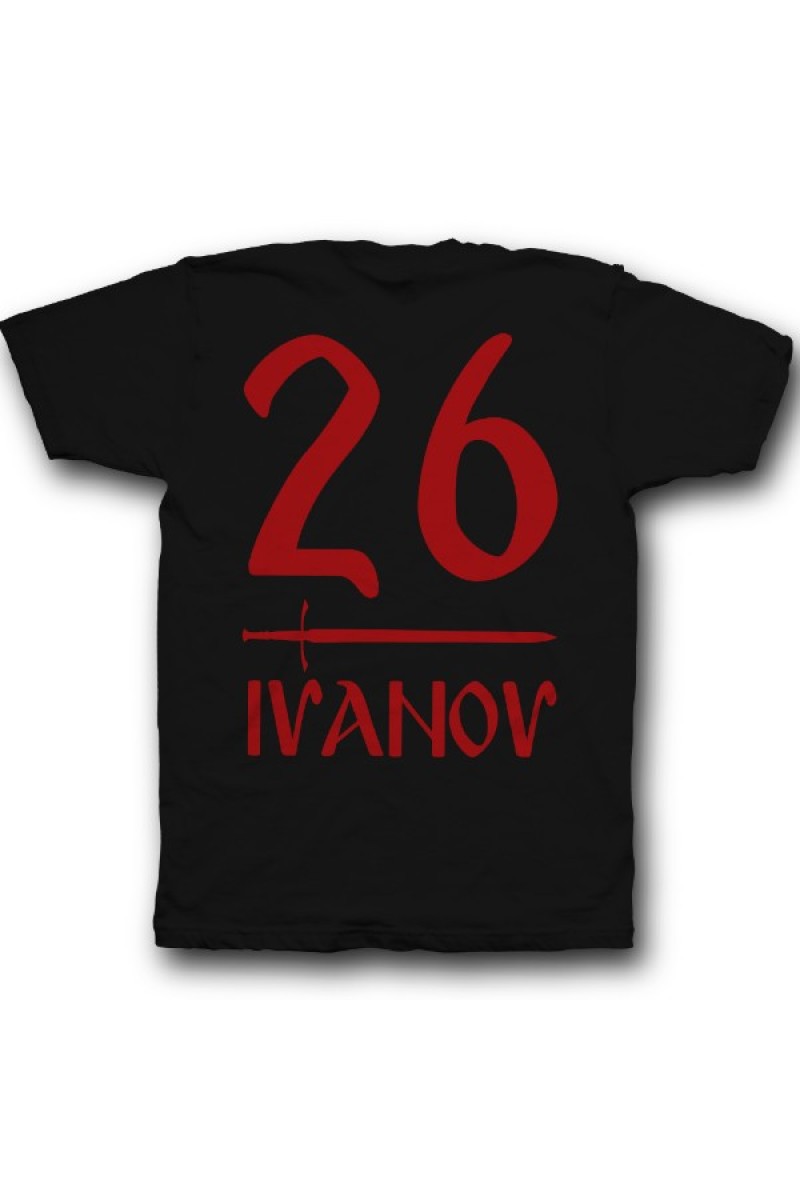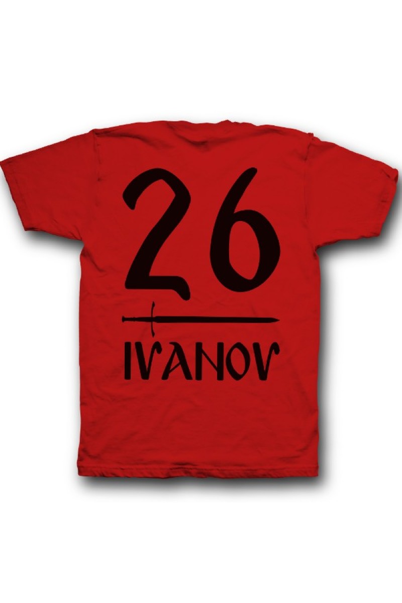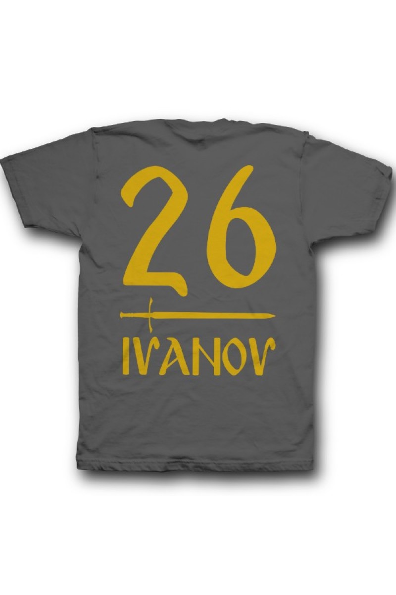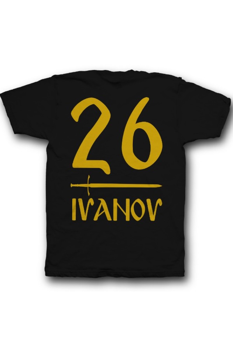 Именная футболка со славянским шрифтом. Помимо надписи на футболке есть изображение меча.