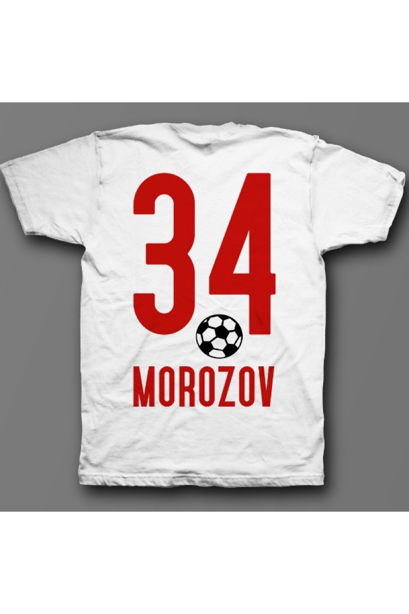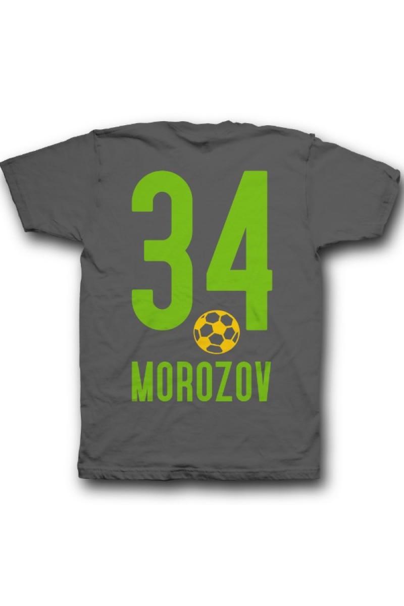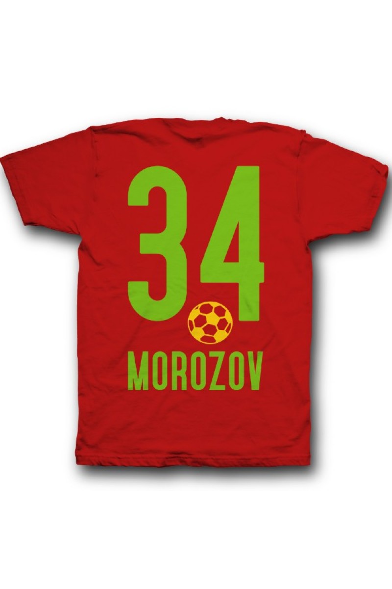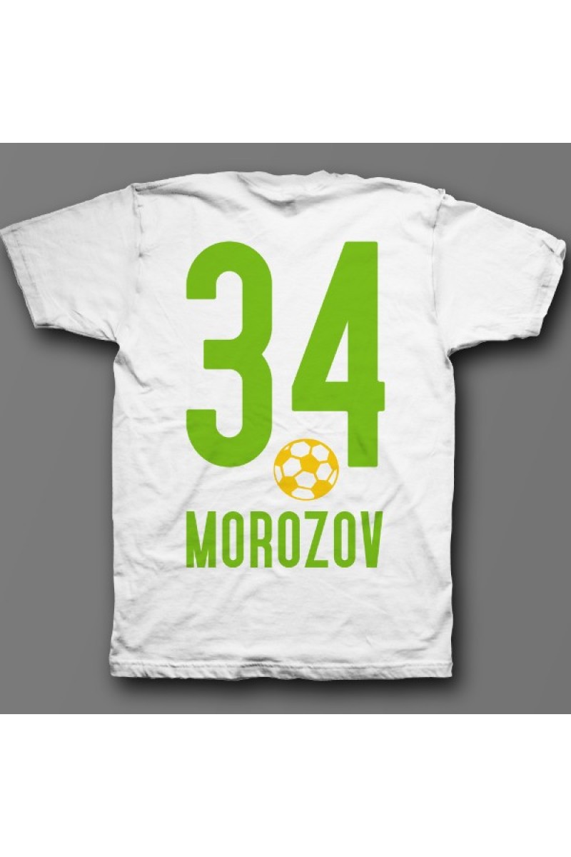 Веселая именная футболка со спортивным шрифтом. Помимо надписи на футболке есть изображение футбольного мяча.