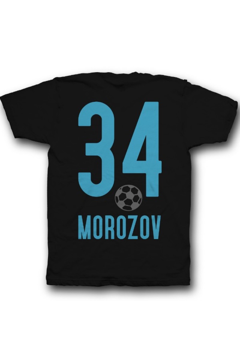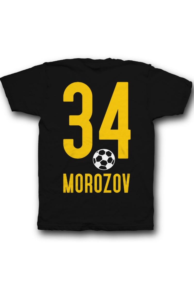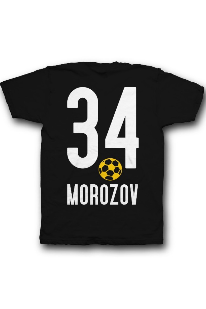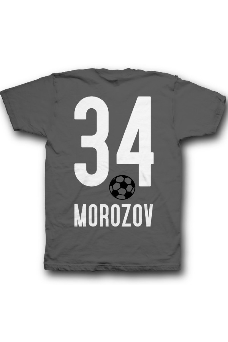 Веселая именная футболка со спортивным шрифтом. Помимо надписи на футболке есть изображение футбольного мяча.
