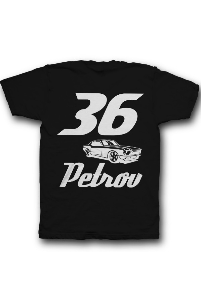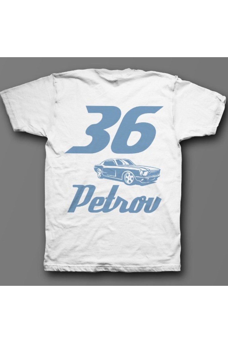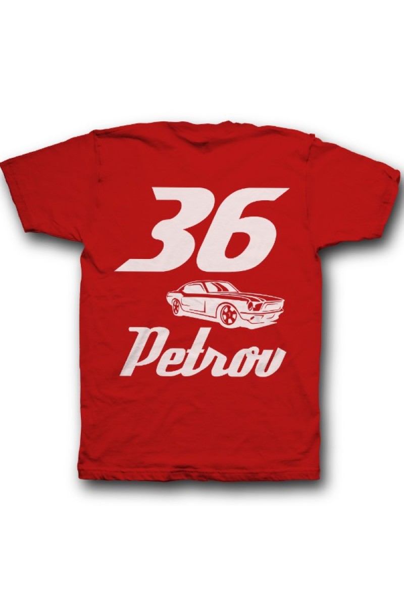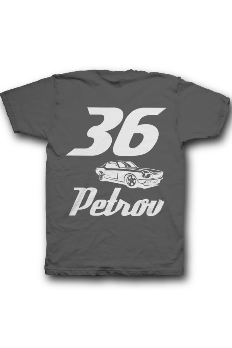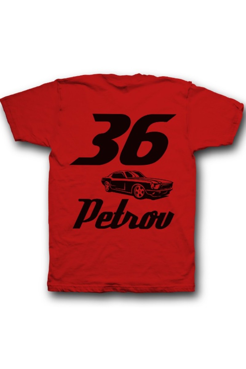 Веселая именная футболка со спортивным шрифтом. Помимо надписи на футболке есть изображение гоночной машины.