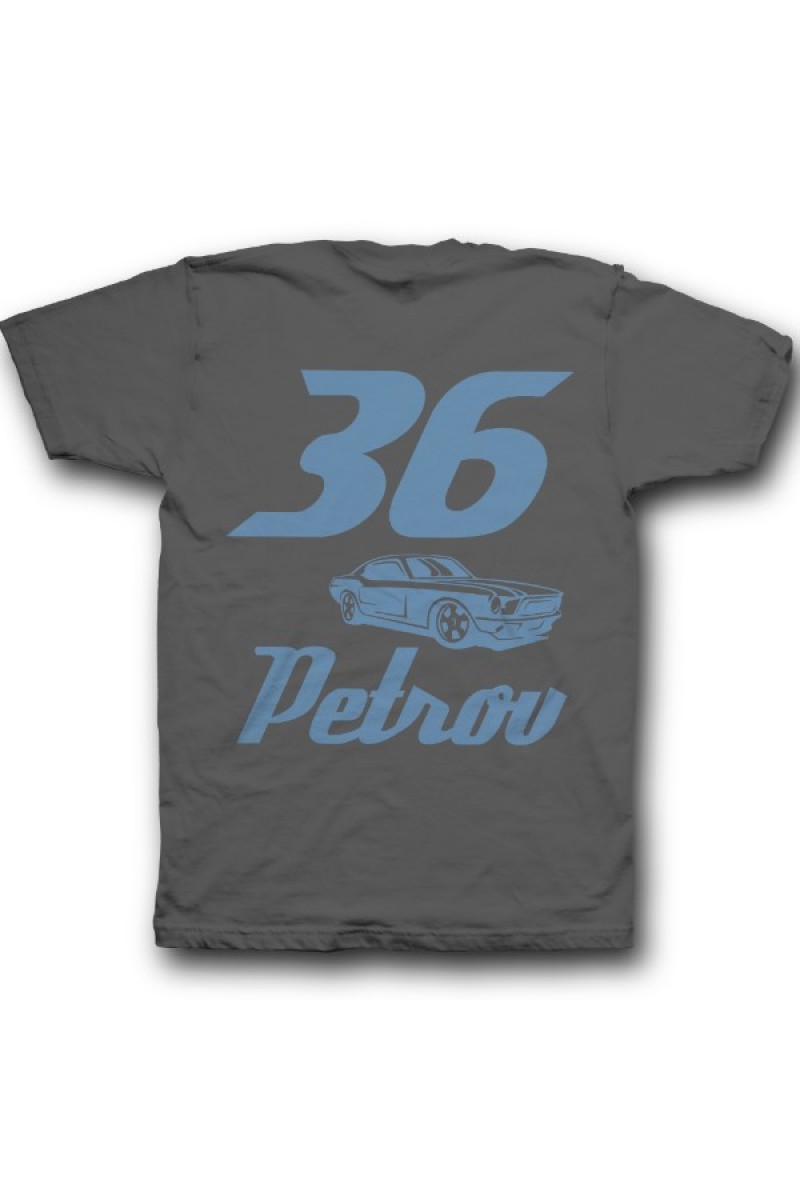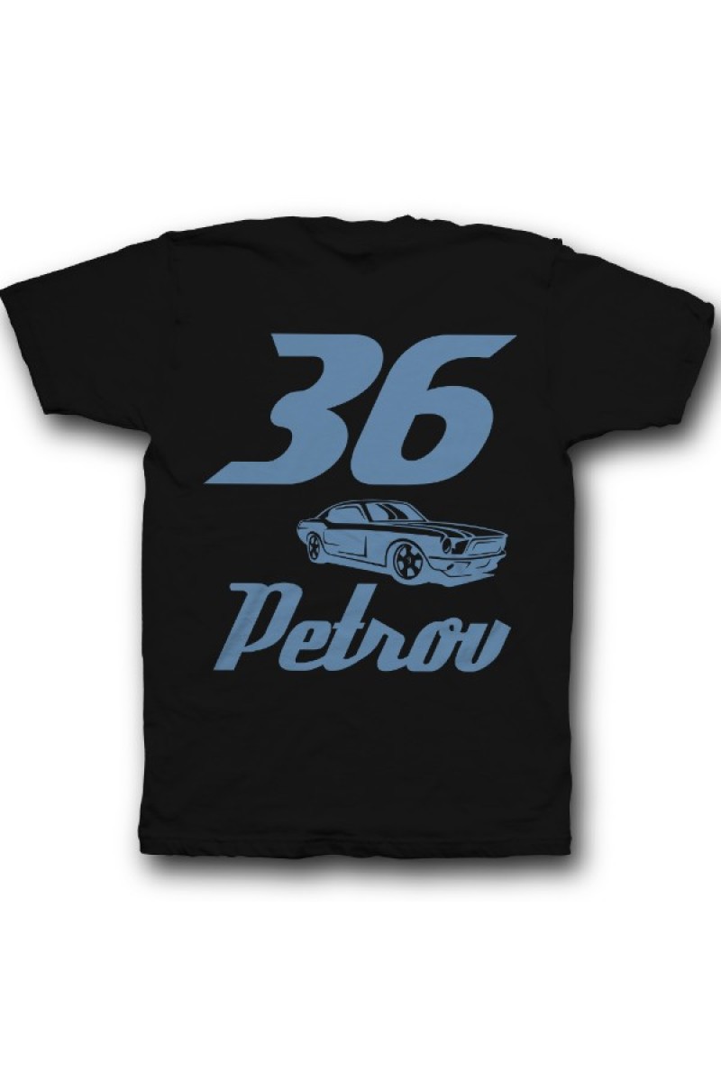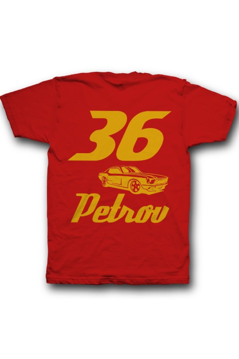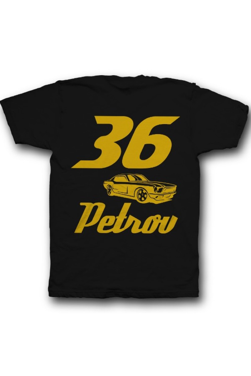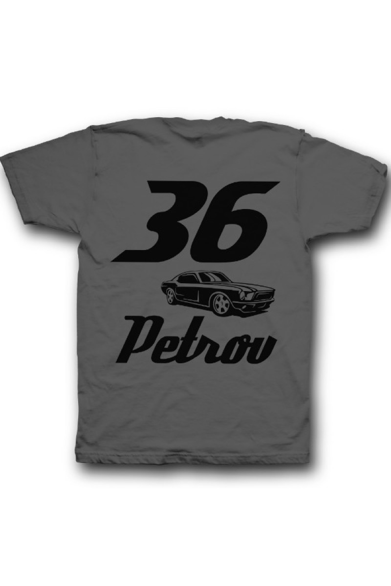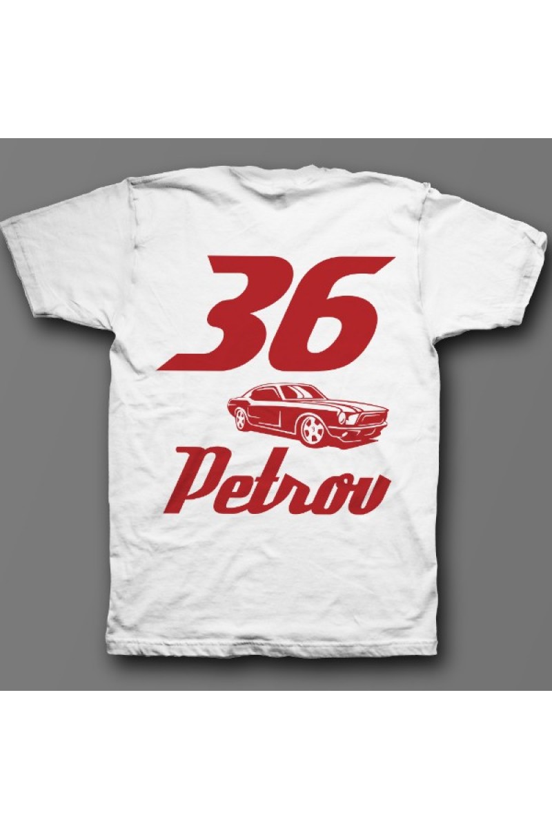 Веселая именная футболка со спортивным шрифтом. Помимо надписи на футболке есть изображение гоночной машины.