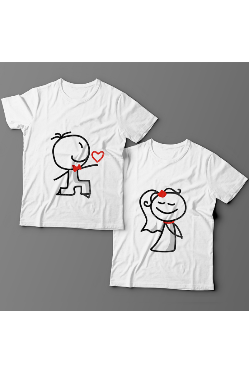 Парные футболки для молодоженов с изображениями жениха, который дарит свое сердце, и невесты в свадебном платье.
