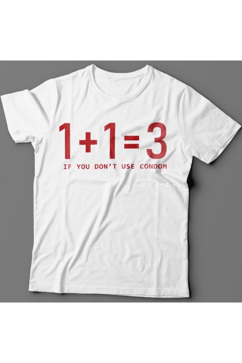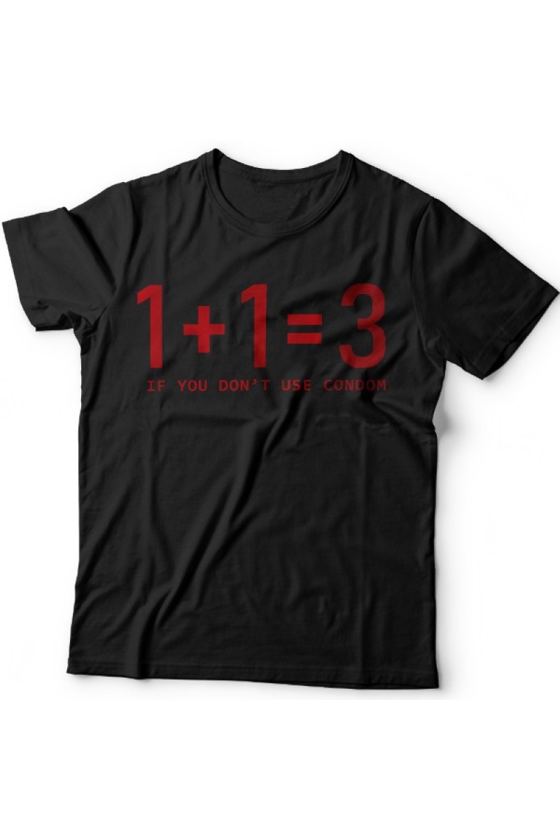Смешная футболка с надписью "1+1=3 if you don't use condom" - 1+1=3 если не используешь презерватив".