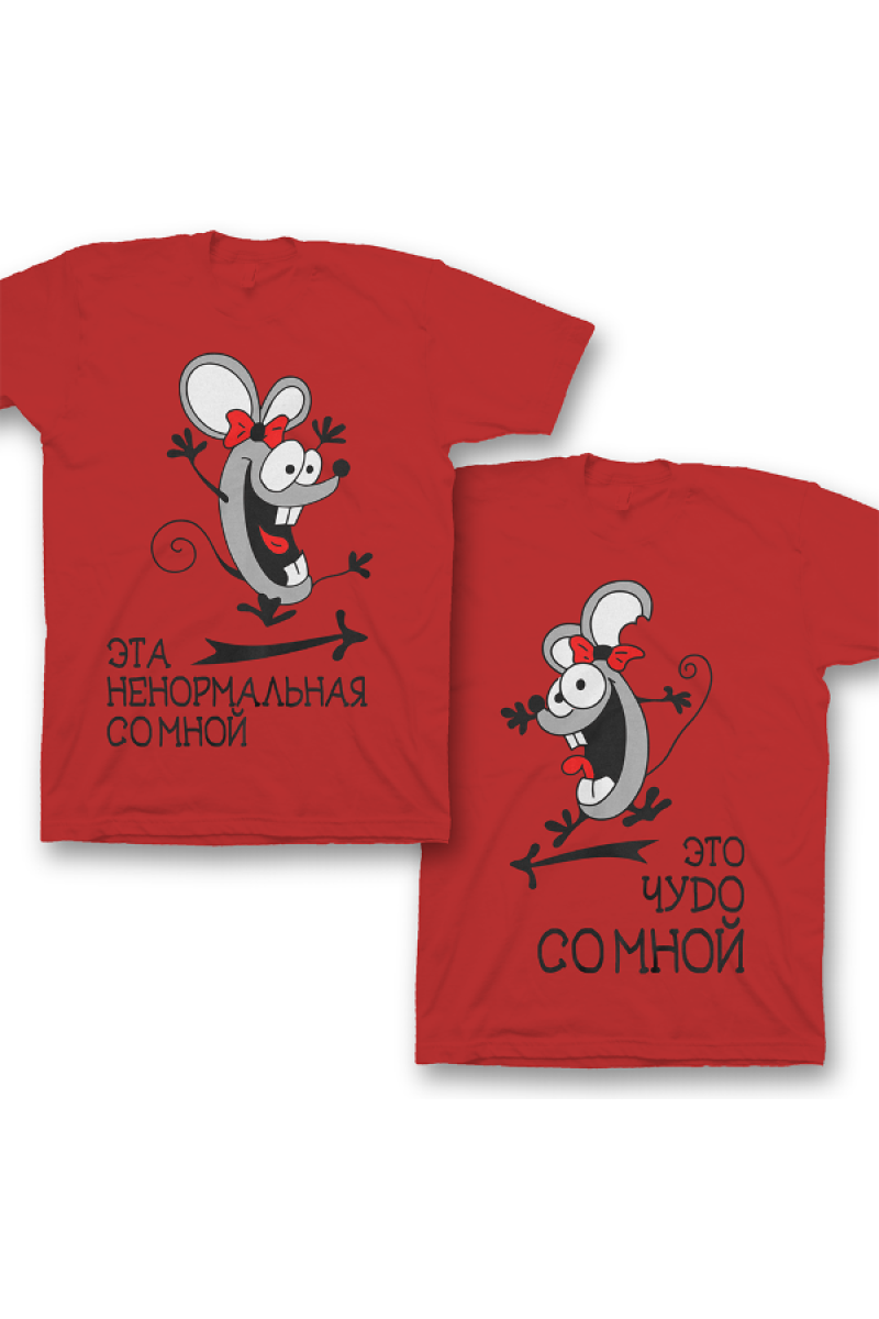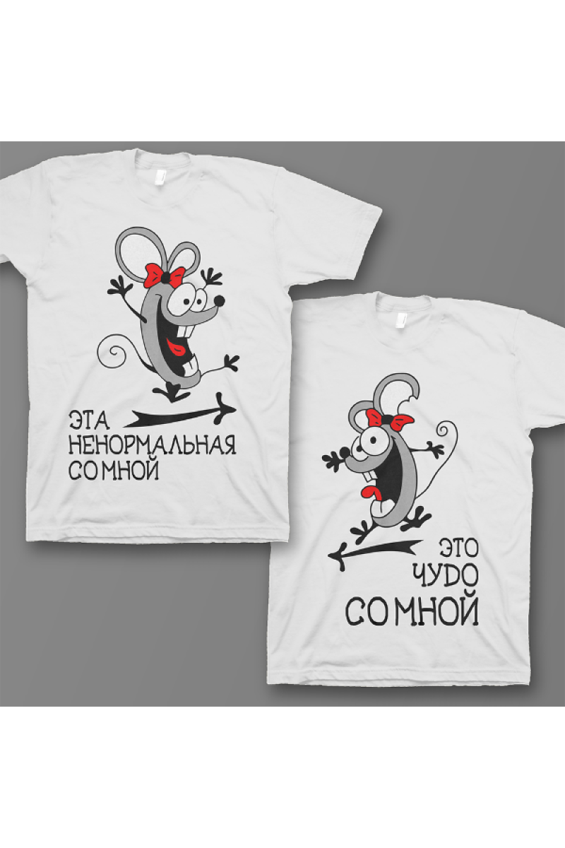 Парные футболки для влюбленных с надписями "Это чудо со мной" - для нее и "Эта ненормальная со мной" - для него. Помимо надписей на принте изображены смешные мышки.