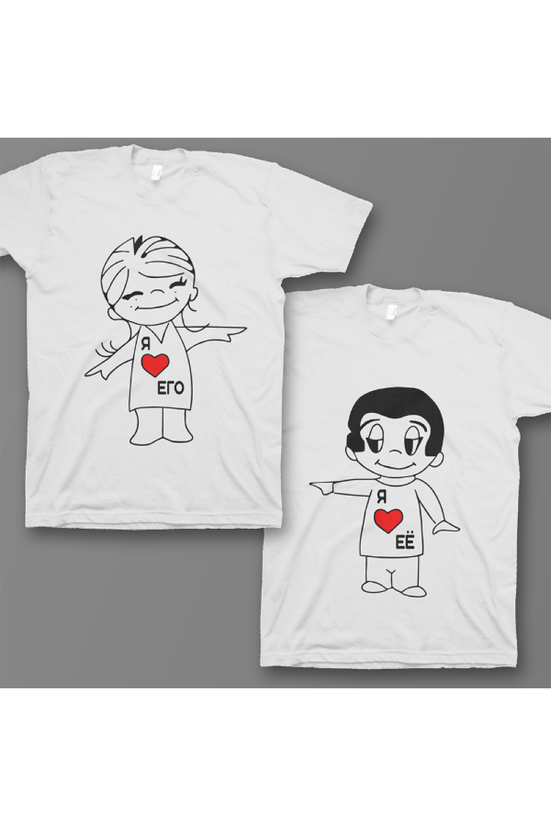 Парные футболки для влюбленных с надписями "Я люблю его" - для нее и "Я люблю её" - для него. Помимо надписей на принте изображены человечки Love is.