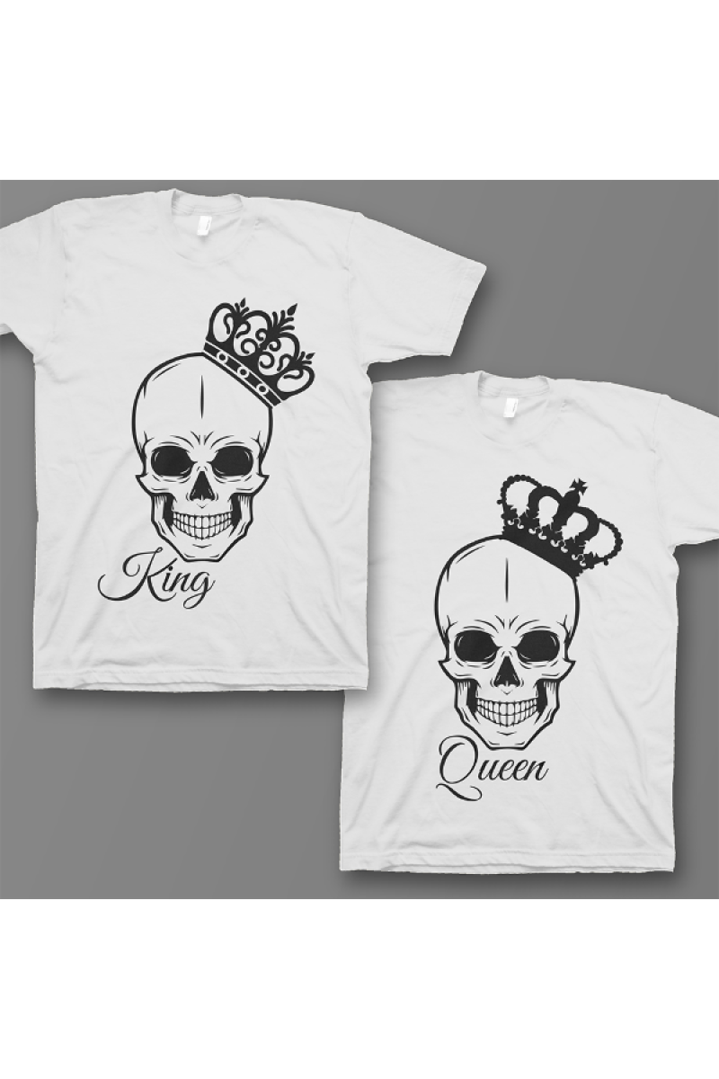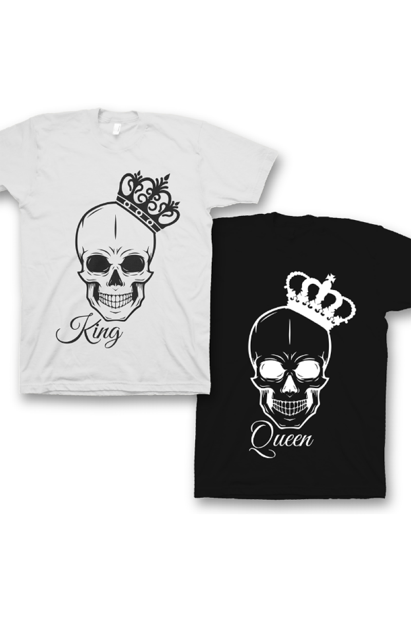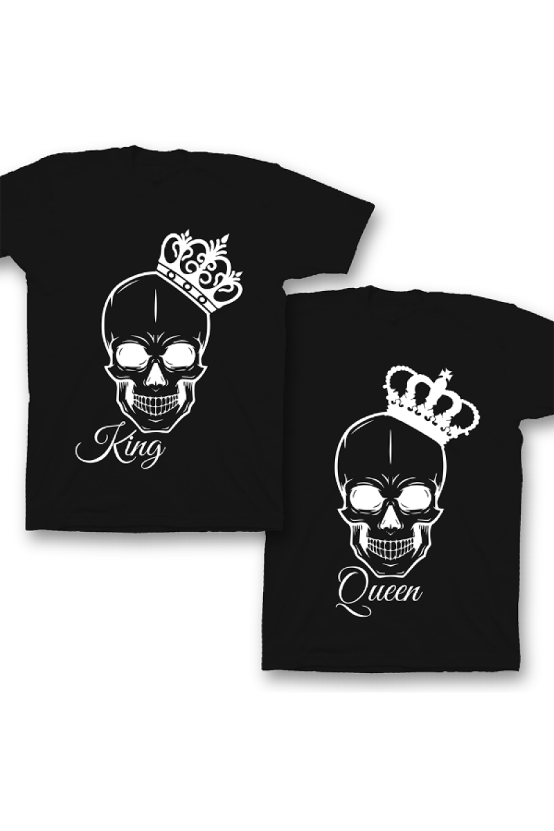 Парные футболки для влюбленных с надписями "Queen" (Королева) - для нее и "King" (Король) - для него. Помимо надписей на принте изображены черепа с коронами.