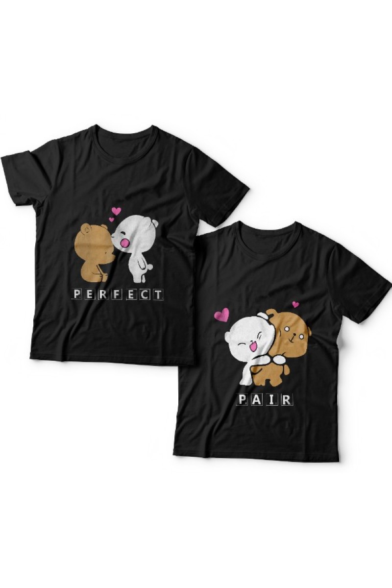 Парные футболки для влюбленных с надписями "Perfect" - лучшая и "Pair" - пара. Помимо надписей на принте есть смешные рисунки белого и бурого мишек.