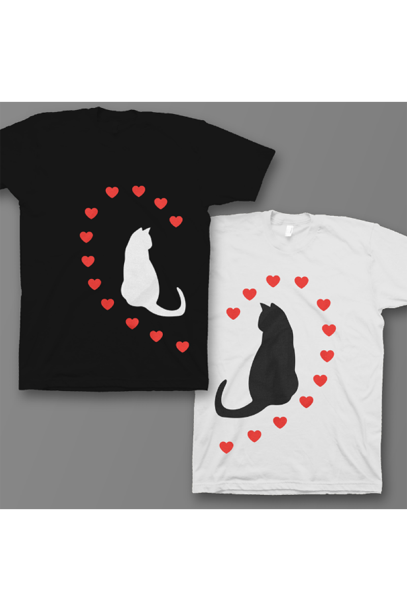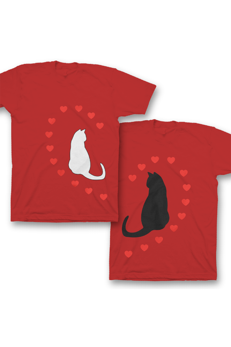Парные футболки для влюбленных с милыми принтами кошечки и кота внутри узора из сердечек