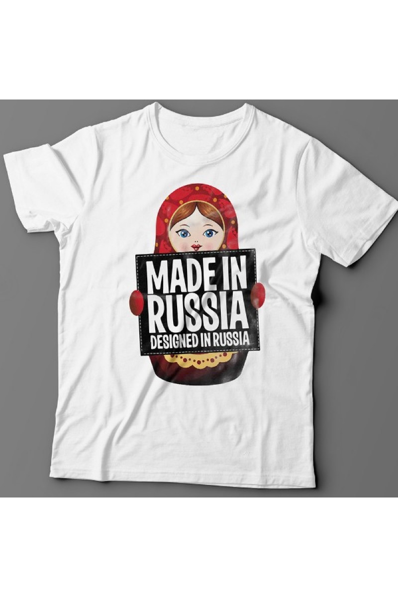 Парные футболки для влюбленных с оригинальным принтом в виде матрешки, которая держит табличку с надписью "Made in Russia" (Сделано в России).