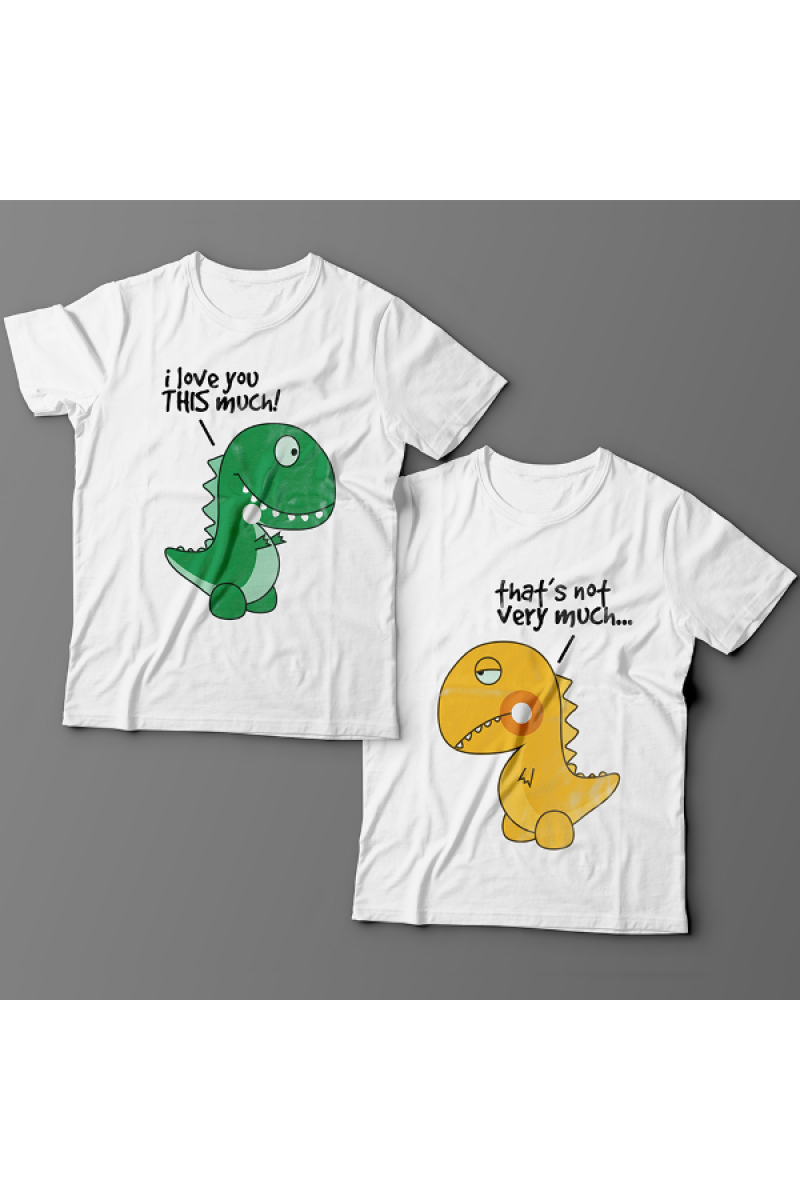 Парные футболки для влюбленных с надписями "I love you THIS much" ("Я люблю тебя ВОТ так") для него и "That's not so much" ("Этого не достаточно..") для неё. Помимо надписи на принте есть рисунок динозавриков, на мужской зеленый, на женской желтый.