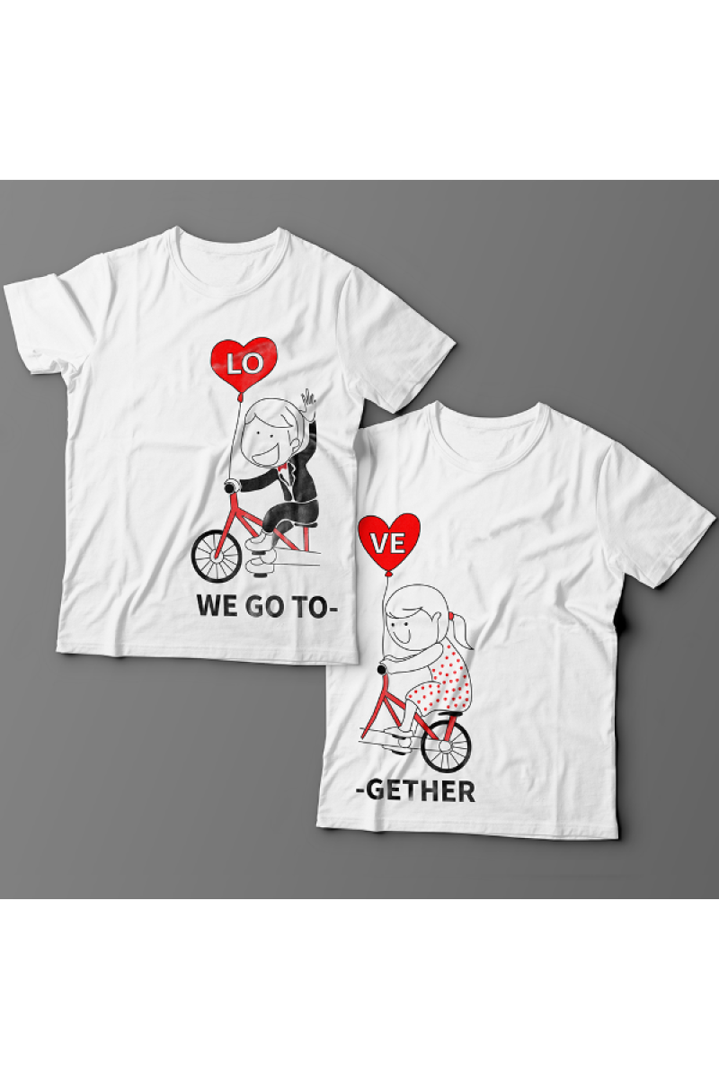 Парные футболки для влюбленных с надписями "We go" ("мы едем") для него и "Together" ("вместе") для неё. Помимо надписи на принте есть изображения мальчика и девочки, которые едут на одном велосипеде вместе.