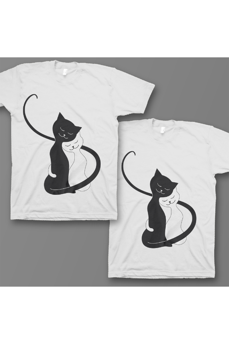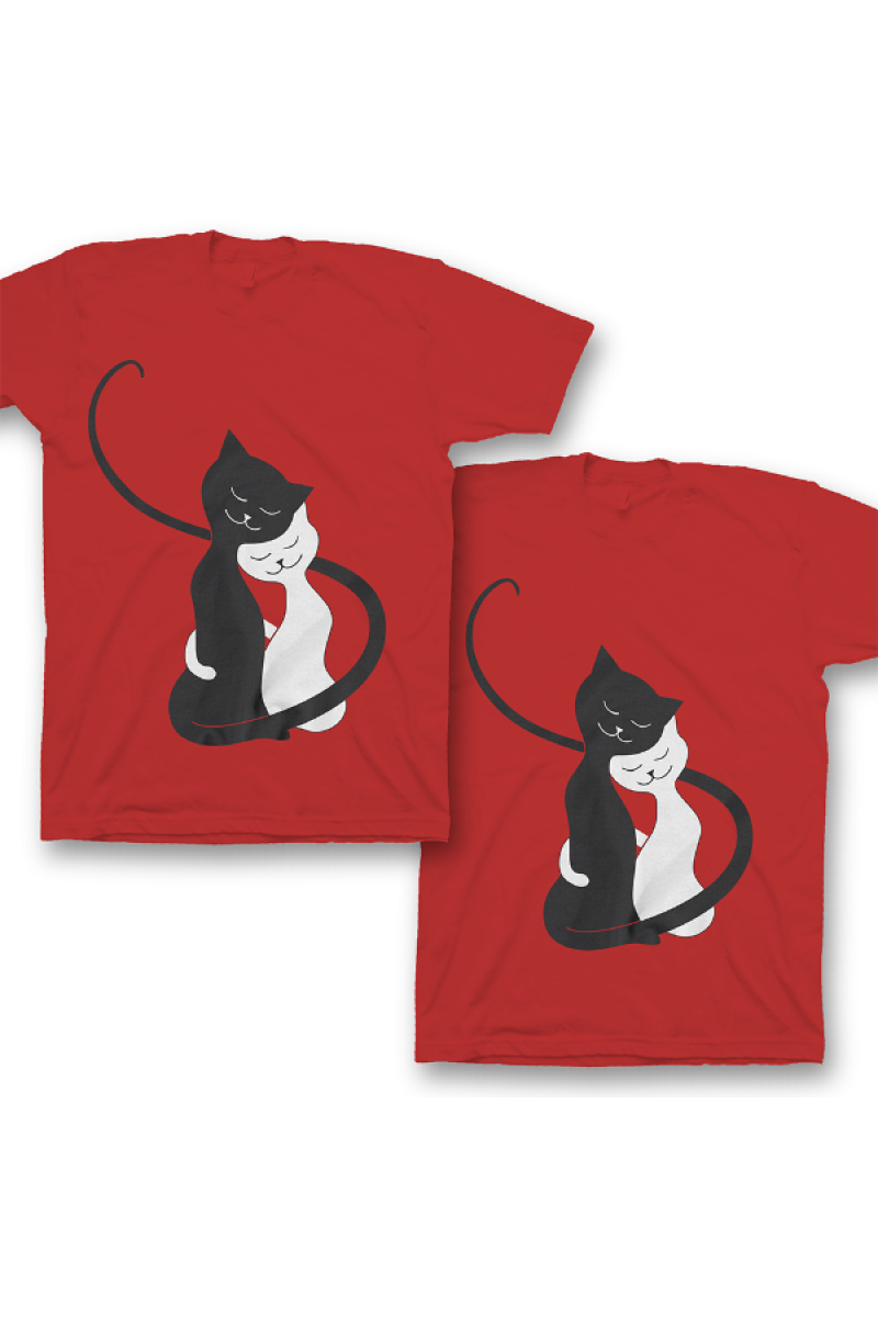Парные футболки для влюбленных с милыми принтами обнимающихся котиков.