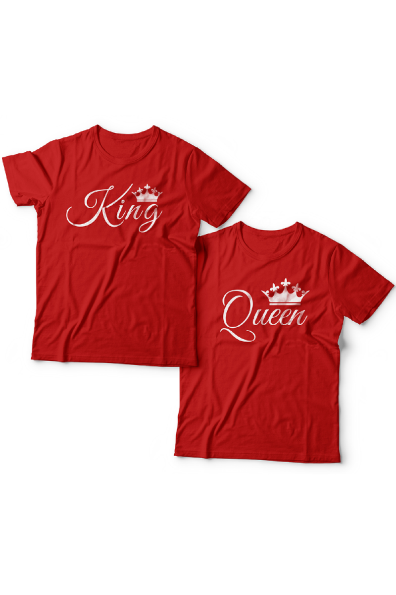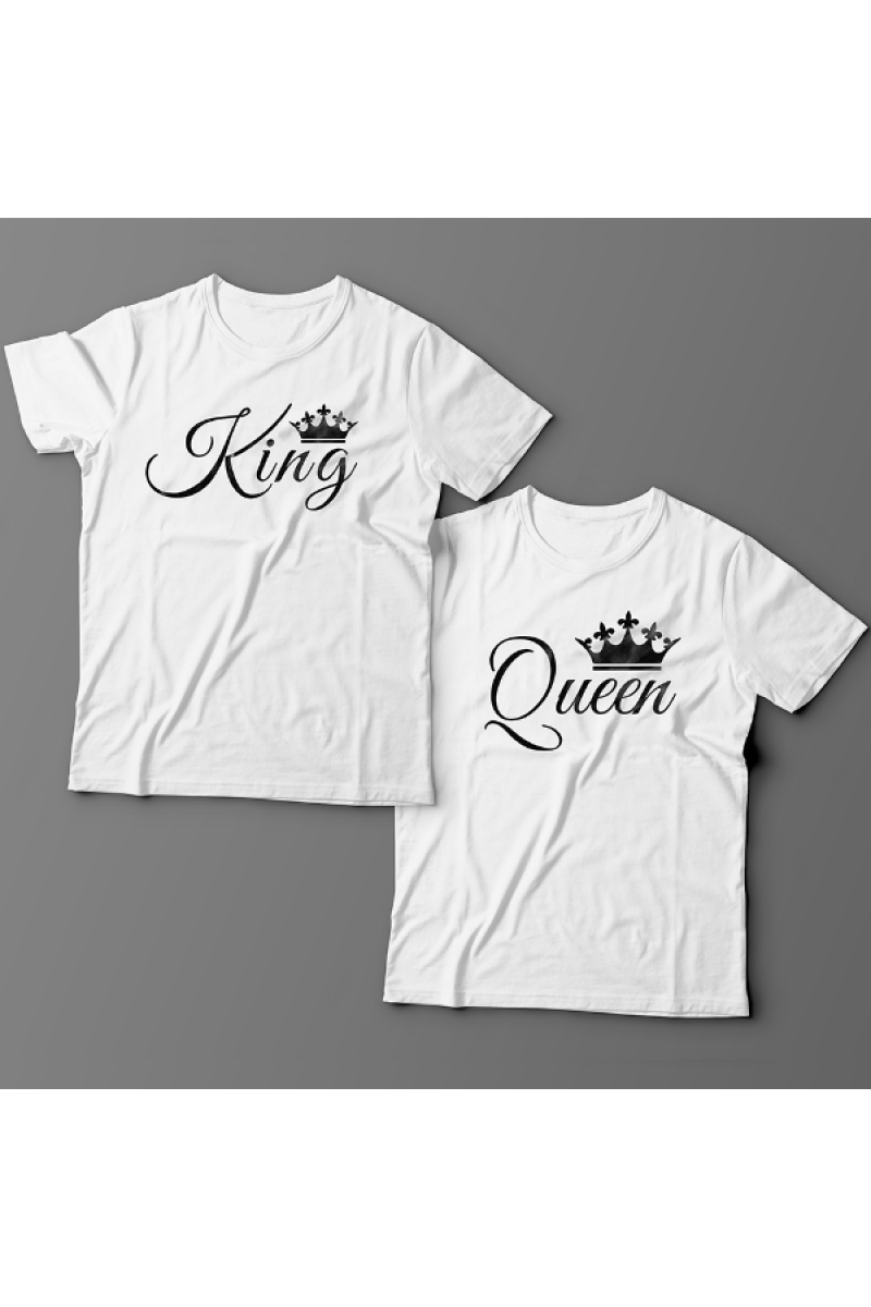 Парные футболки для влюбленных с надписями "King" ("Король") для него и "Queen" ("Королева") для неё. Помимо надписи на принте есть изображения короны.