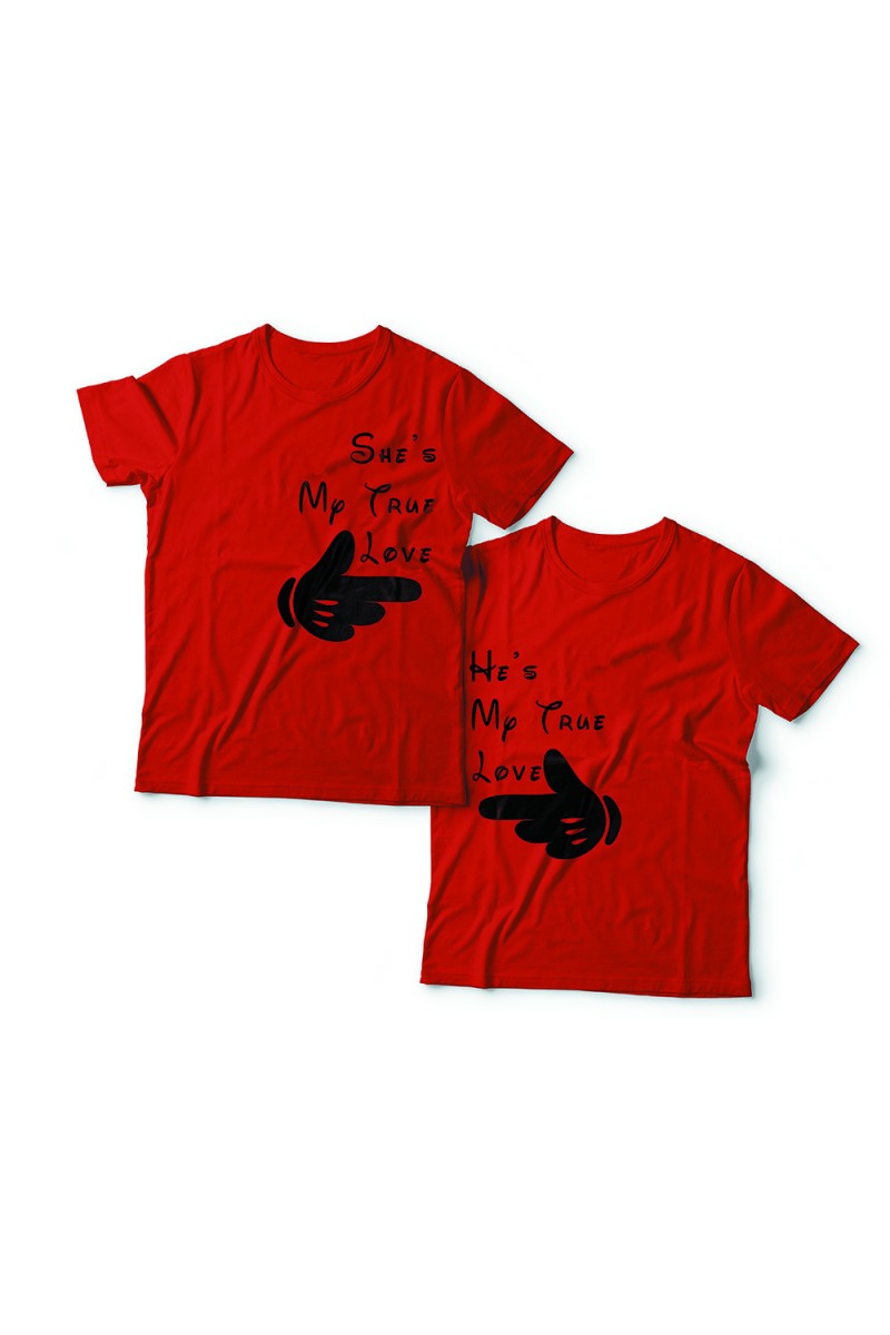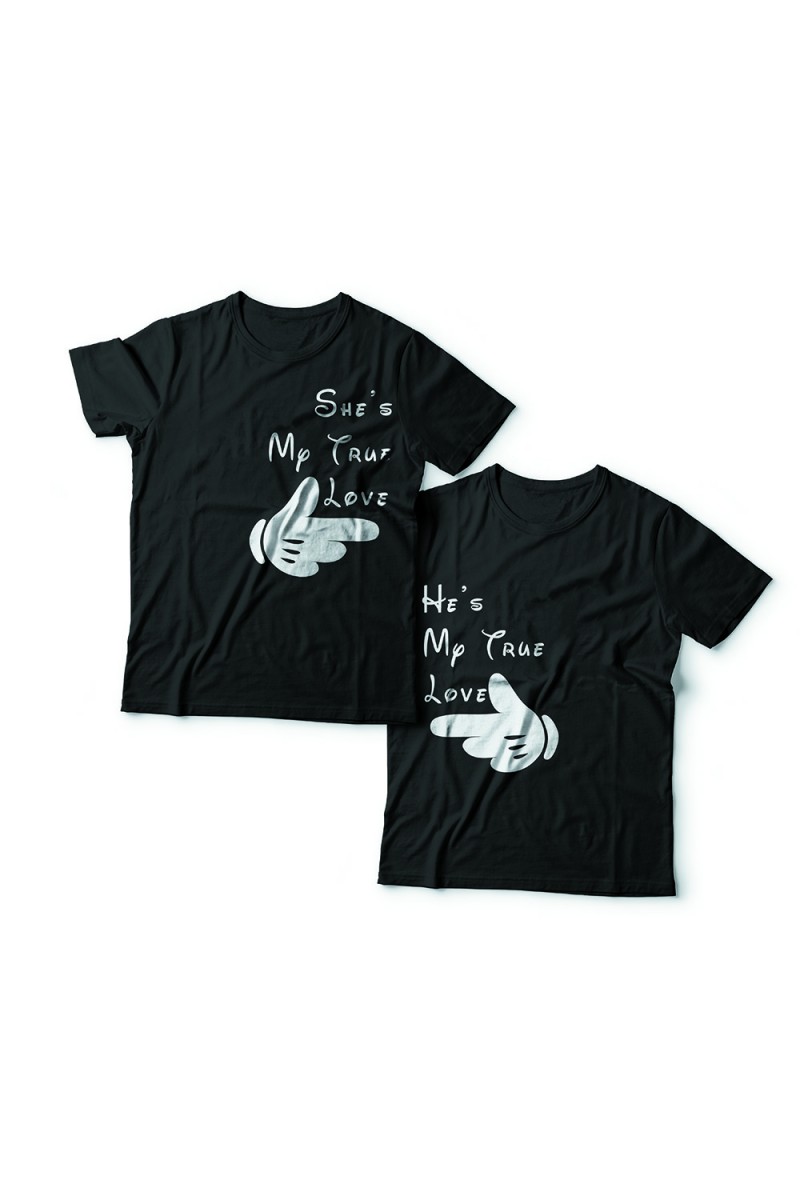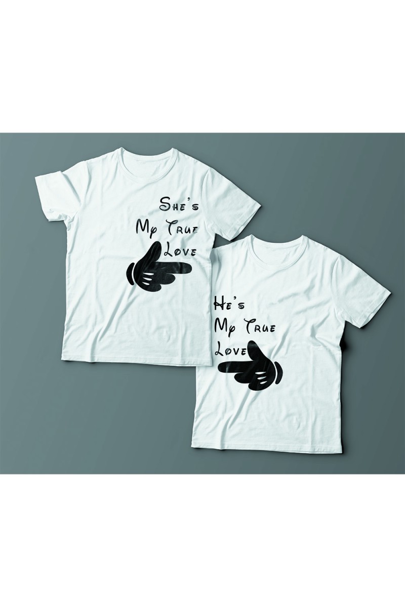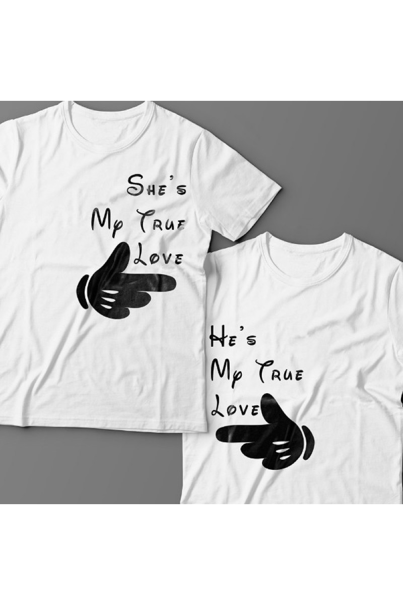 Парные футболки для влюбленных с указывающими друг на друга пальцами и подписями "Она моя настоящая любовь" и "Он моя настоящая любовь". Надписи и рисунок выполнены в Диснеевской стилистике.