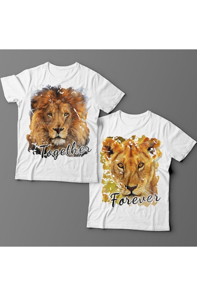 Парные футболки для влюбленных с изображениями льва и львицы и надписью "Together forever" (Вместе навсегда).