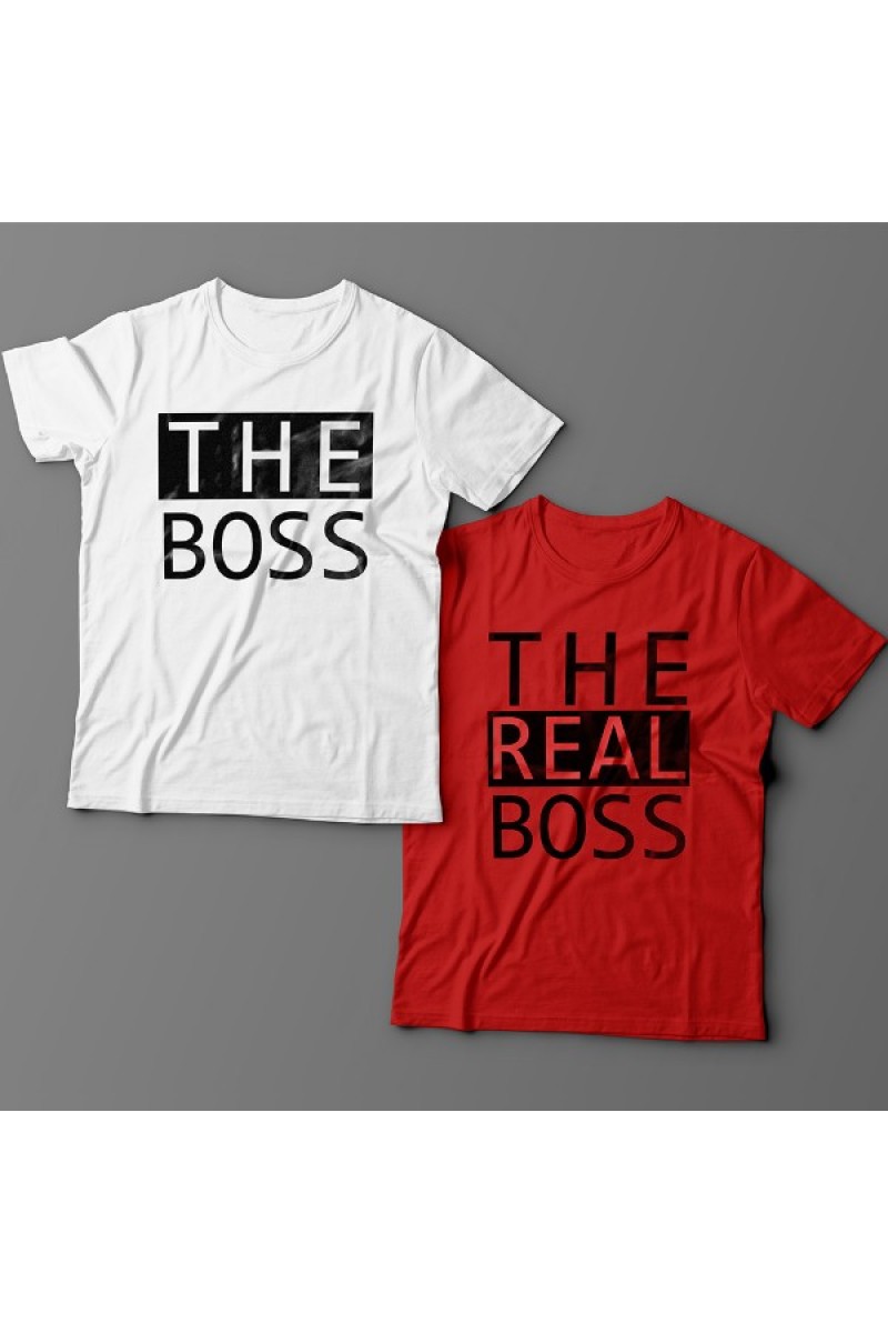 Парные футболки для влюбленных с надписями "The boss" (Босс) - для него и "The real boss" (Настоящий босс) - для неё.